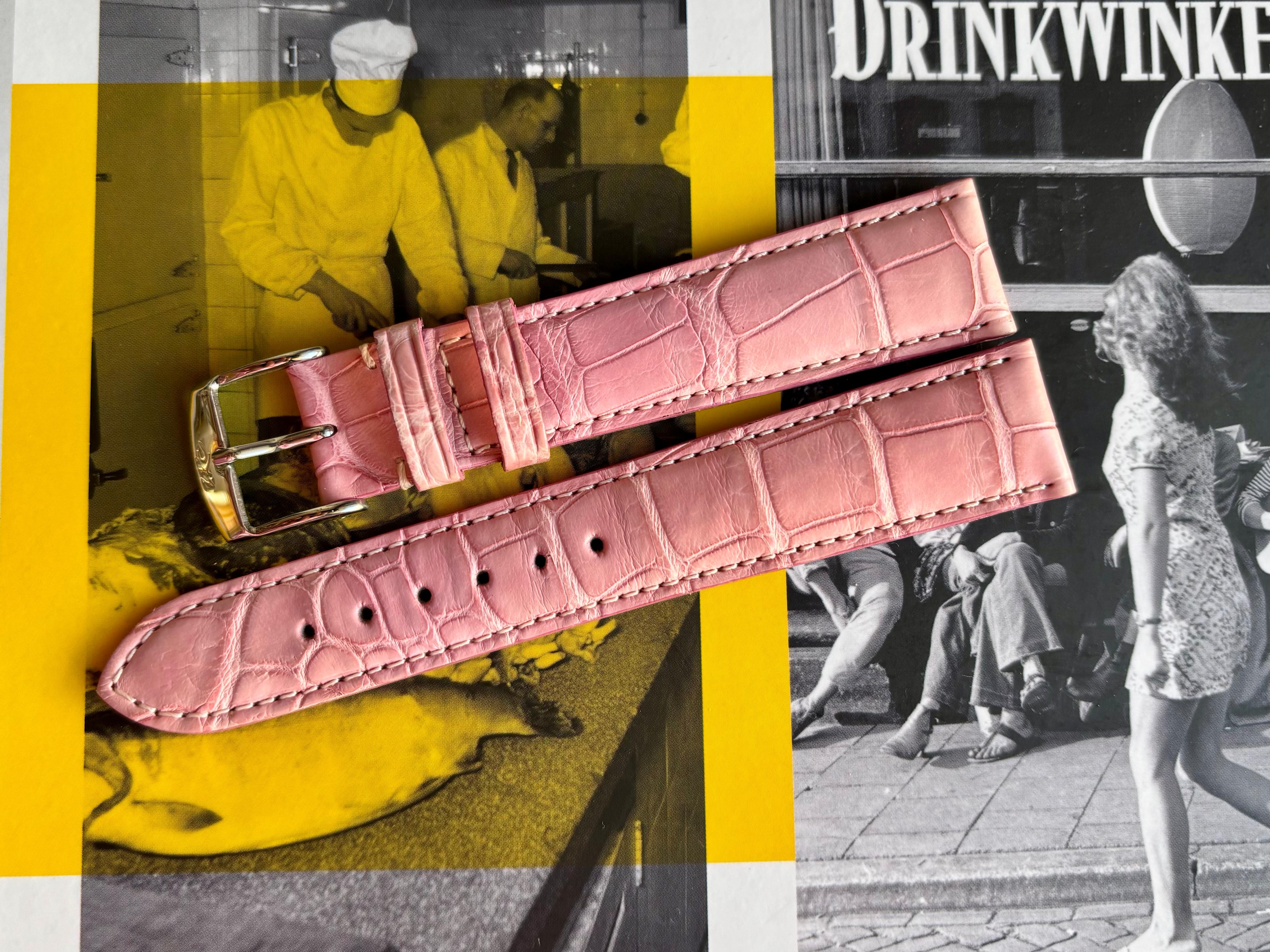 Was het niet voor dochterlief en dus nieuw en ongedragen te koop deze heerlijke zachte ècht alligatorlederen band in het roze van een Frans topatelier.