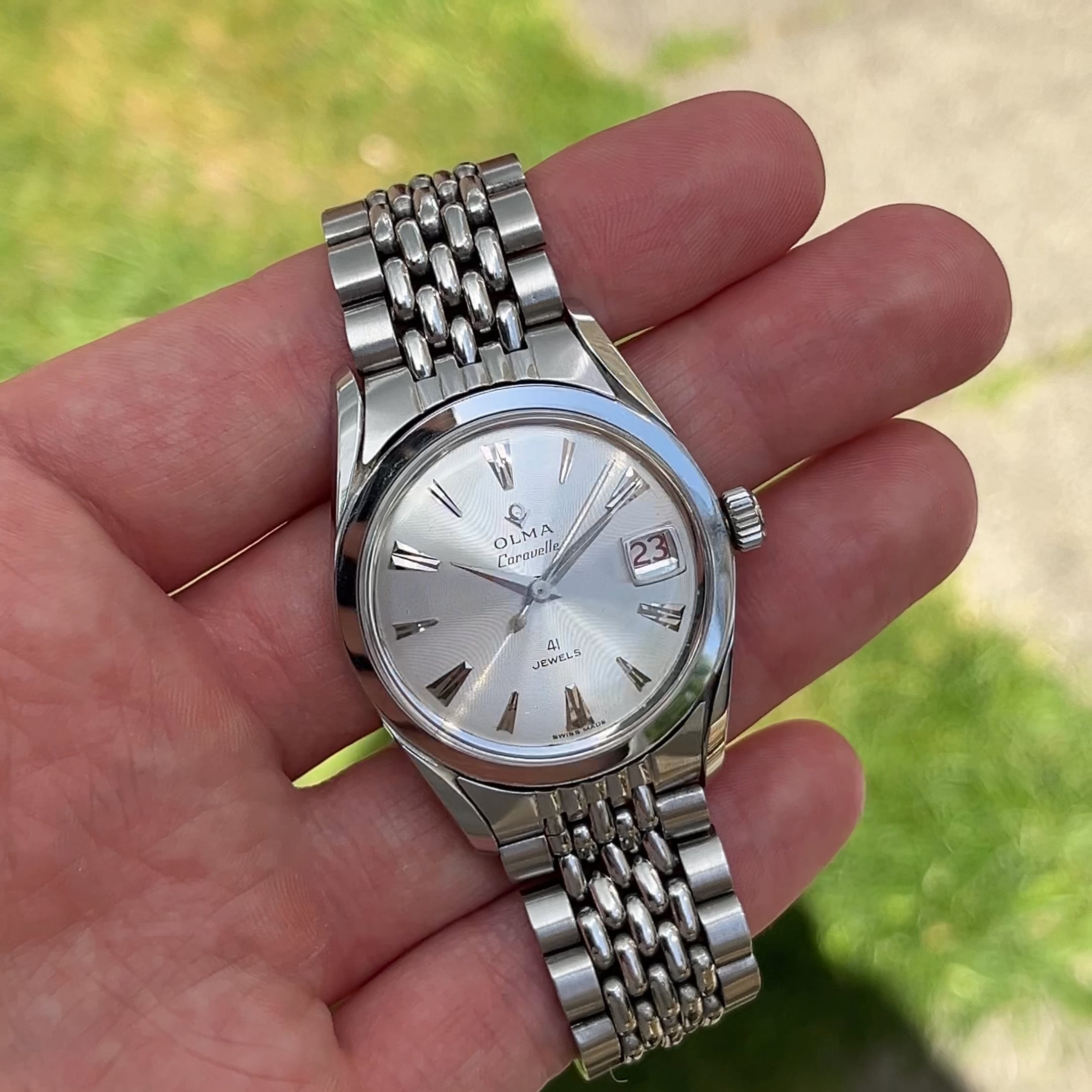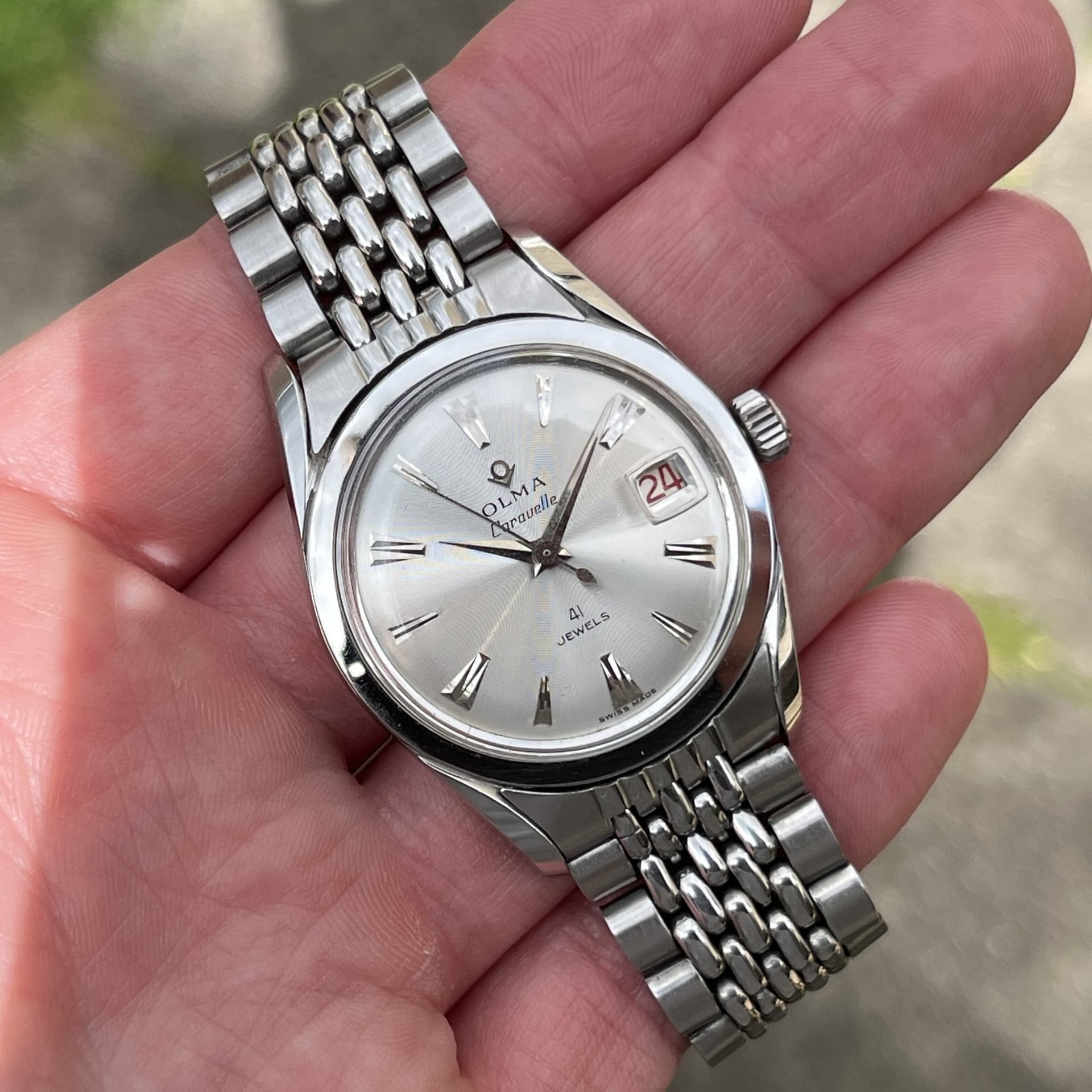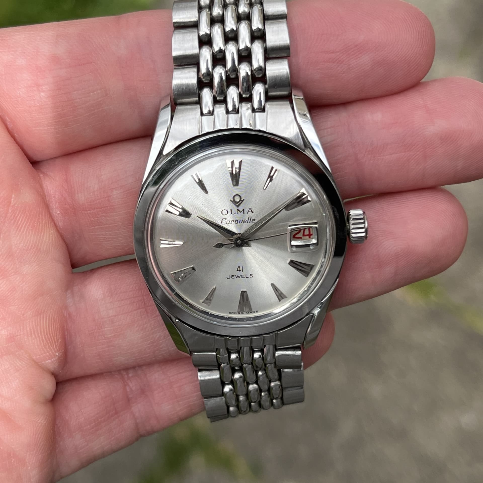 Merk: Olma Caravelle. Olma heeft wel meer versies gemaakt, maar van deze, met concentrische wijzerplaat en spectaculaire uurmarkeringen, zag ik nog geen andere. De roulette datum is een leuk detail.