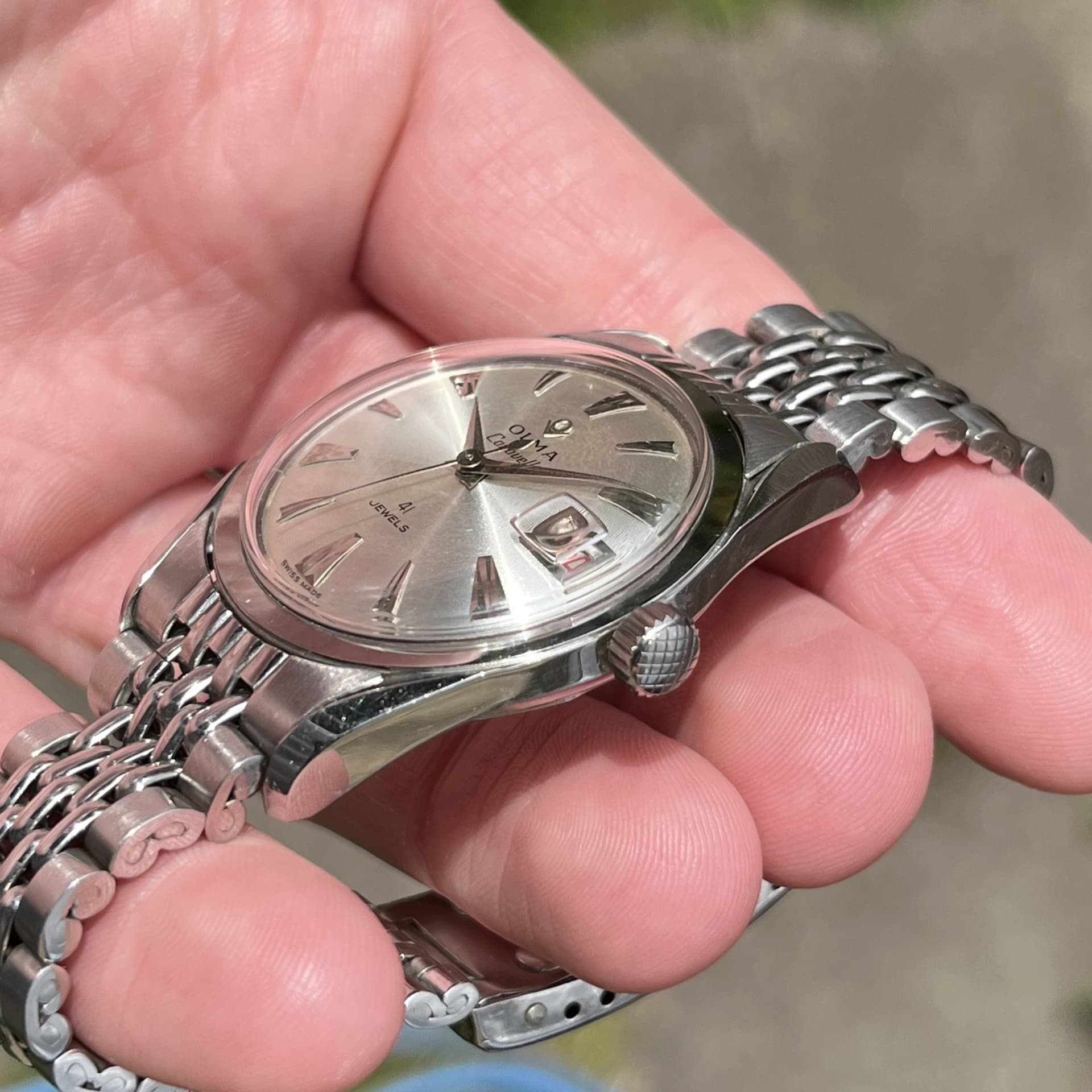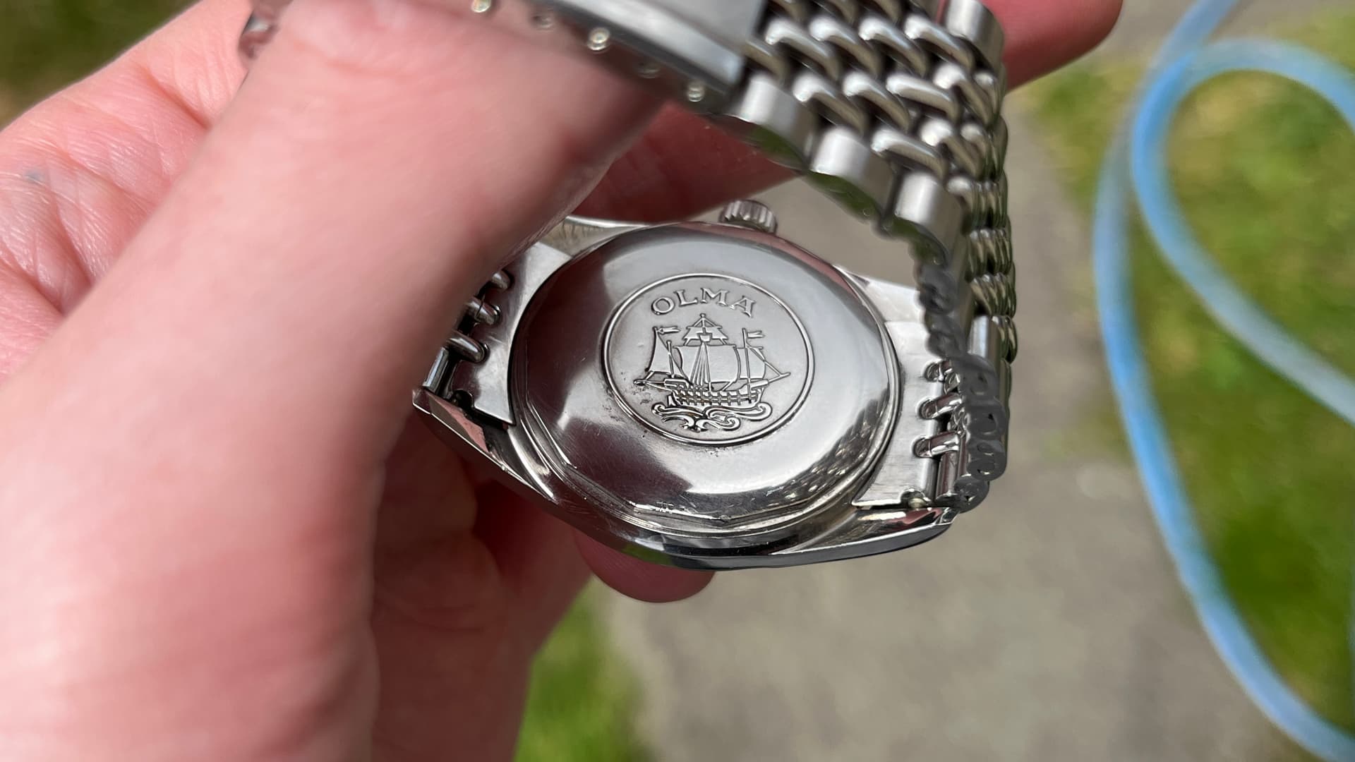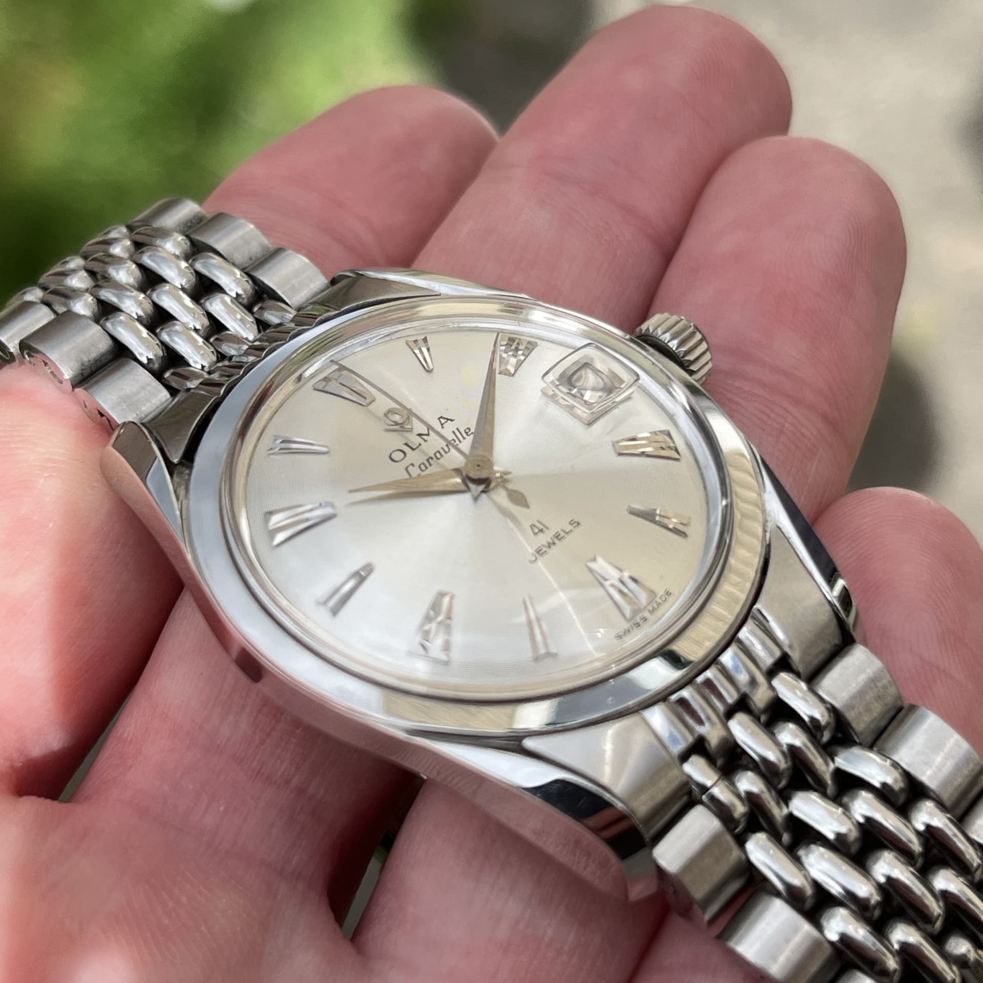Merk: Olma Caravelle. Olma heeft wel meer versies gemaakt, maar van deze, met concentrische wijzerplaat en spectaculaire uurmarkeringen, zag ik nog geen andere. De roulette datum is een leuk detail.