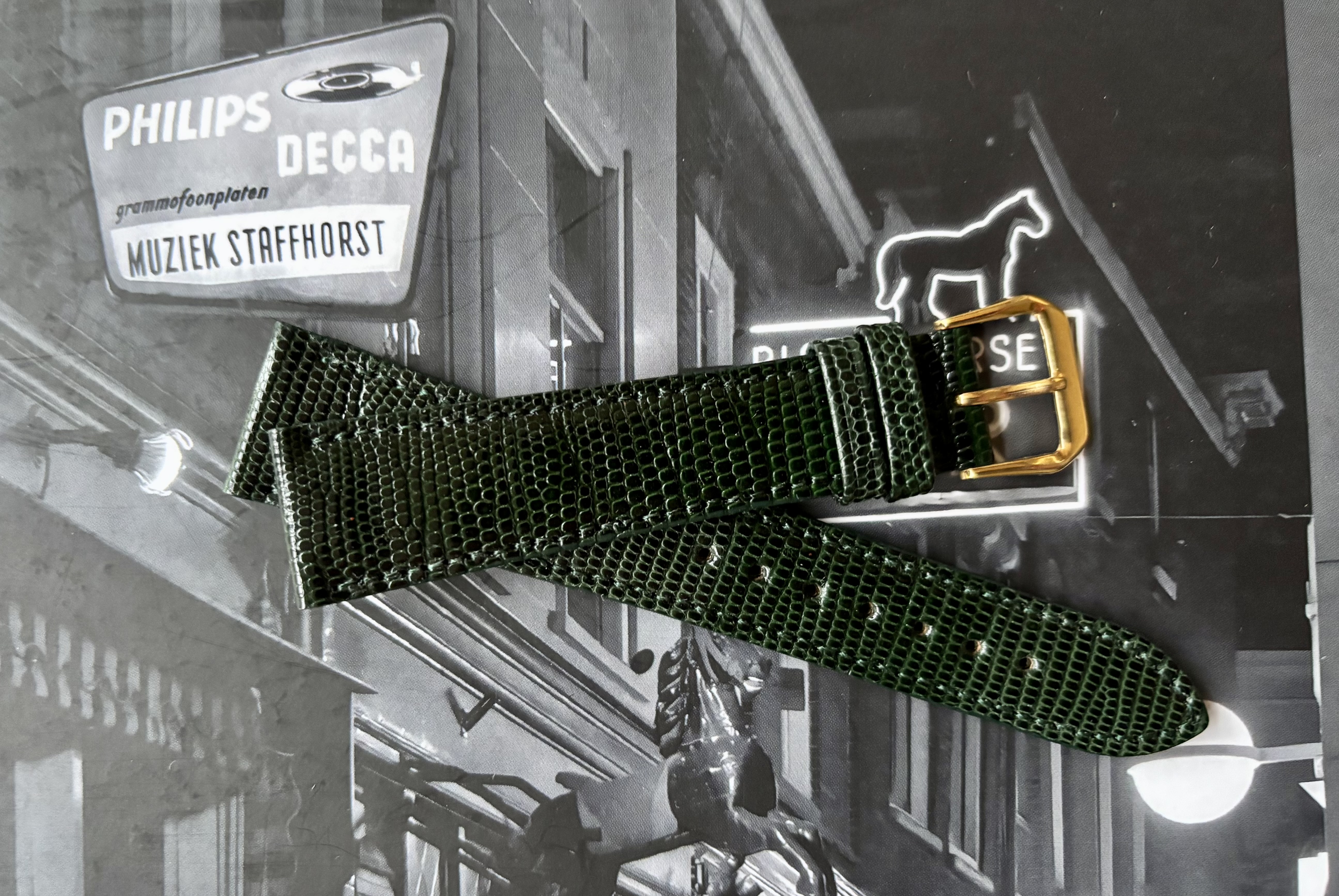 Niet de kleur die ik hoopte, dus deze mag weg, diepdonkergroene Teju hagedislederen band, bandaanzet 20mm taperend naar een heerlijke vintage 16mm bij de gesp.