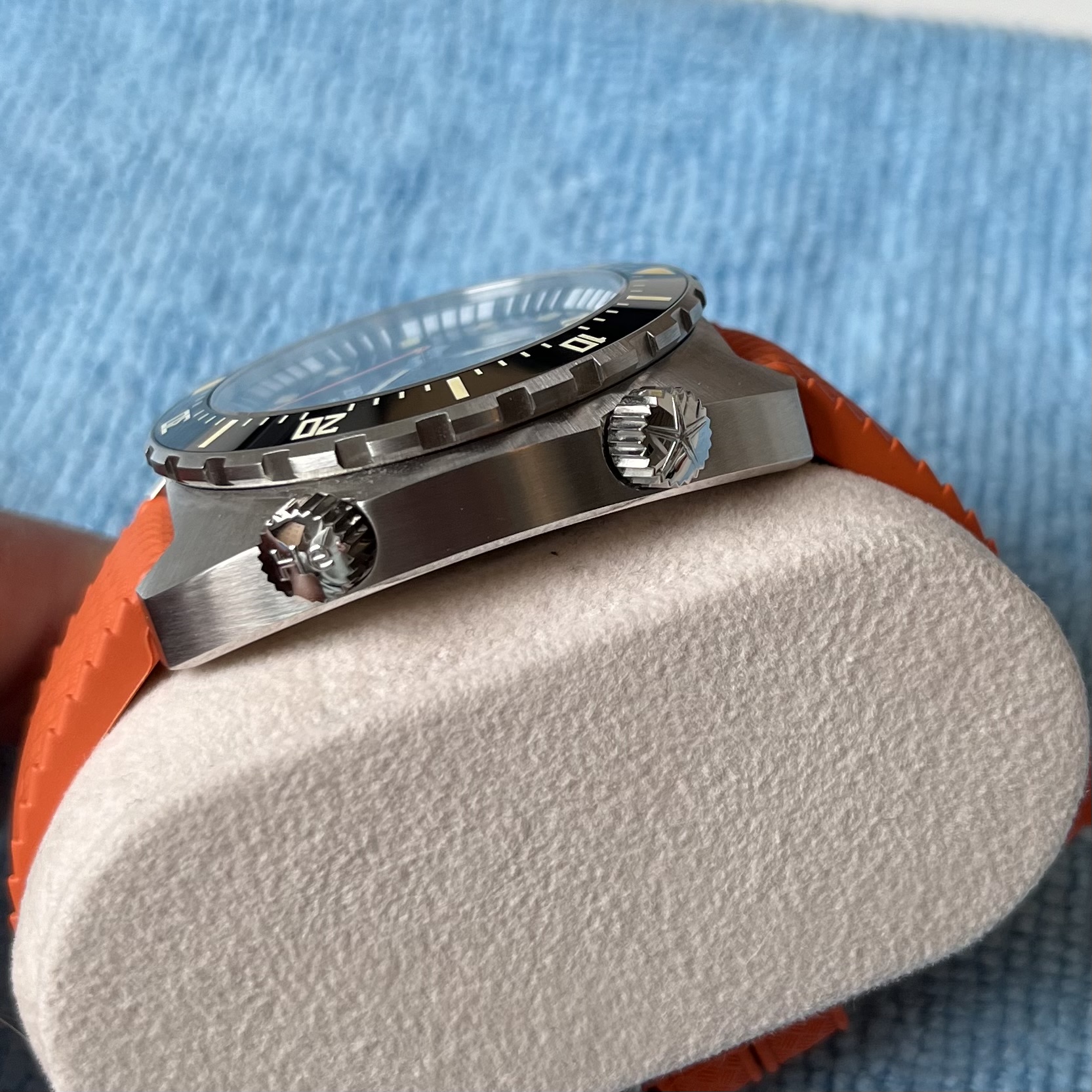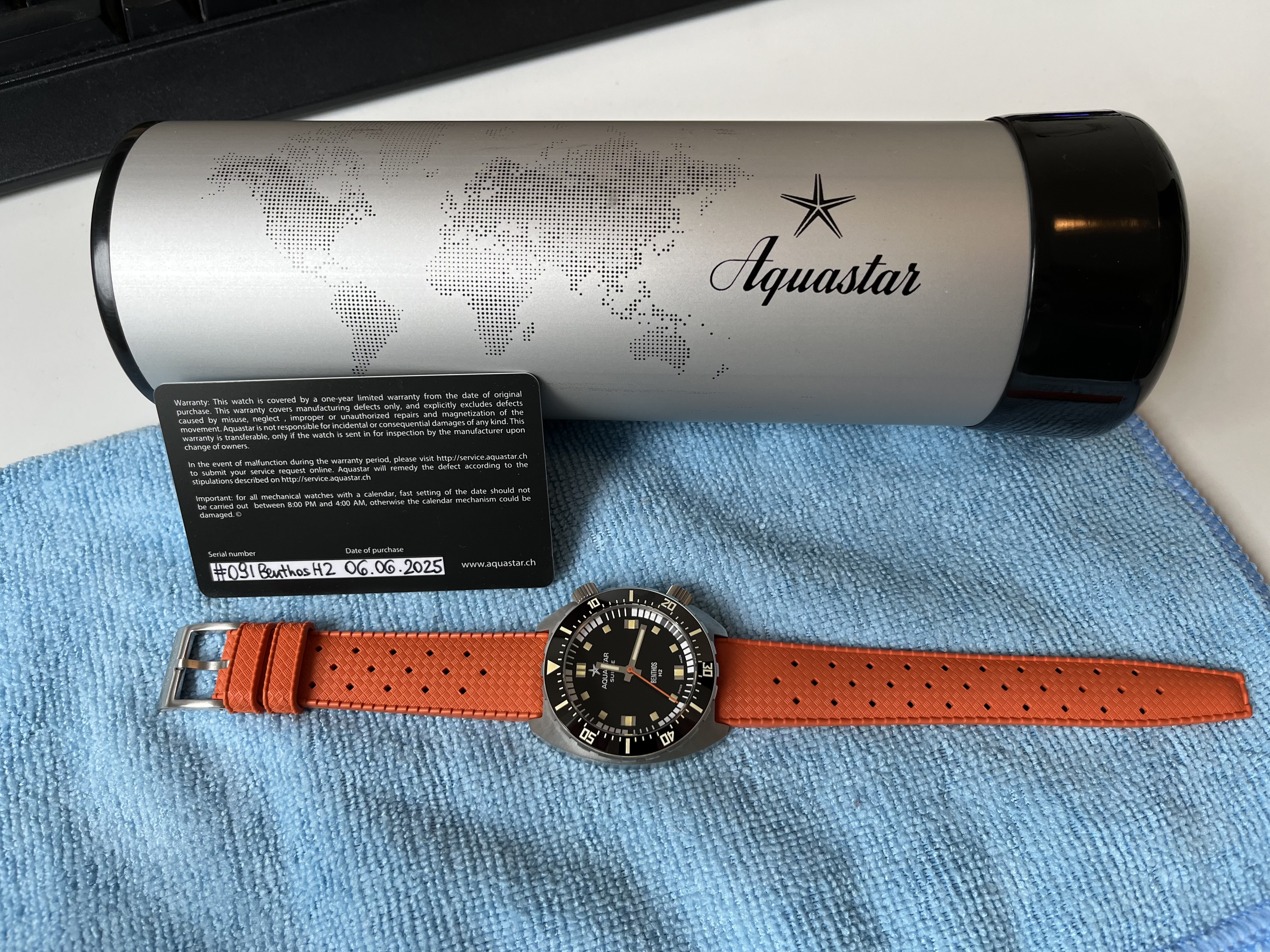 | Originele doos en/of eventuele accessoires: | In de mooie ‘buis’ met oranje én zwart tropic van Wollbrook (=JB) en als je heel lief bent mag je er nog een Watch Steward bandje bij kiezen (zwart, groen, beige) |