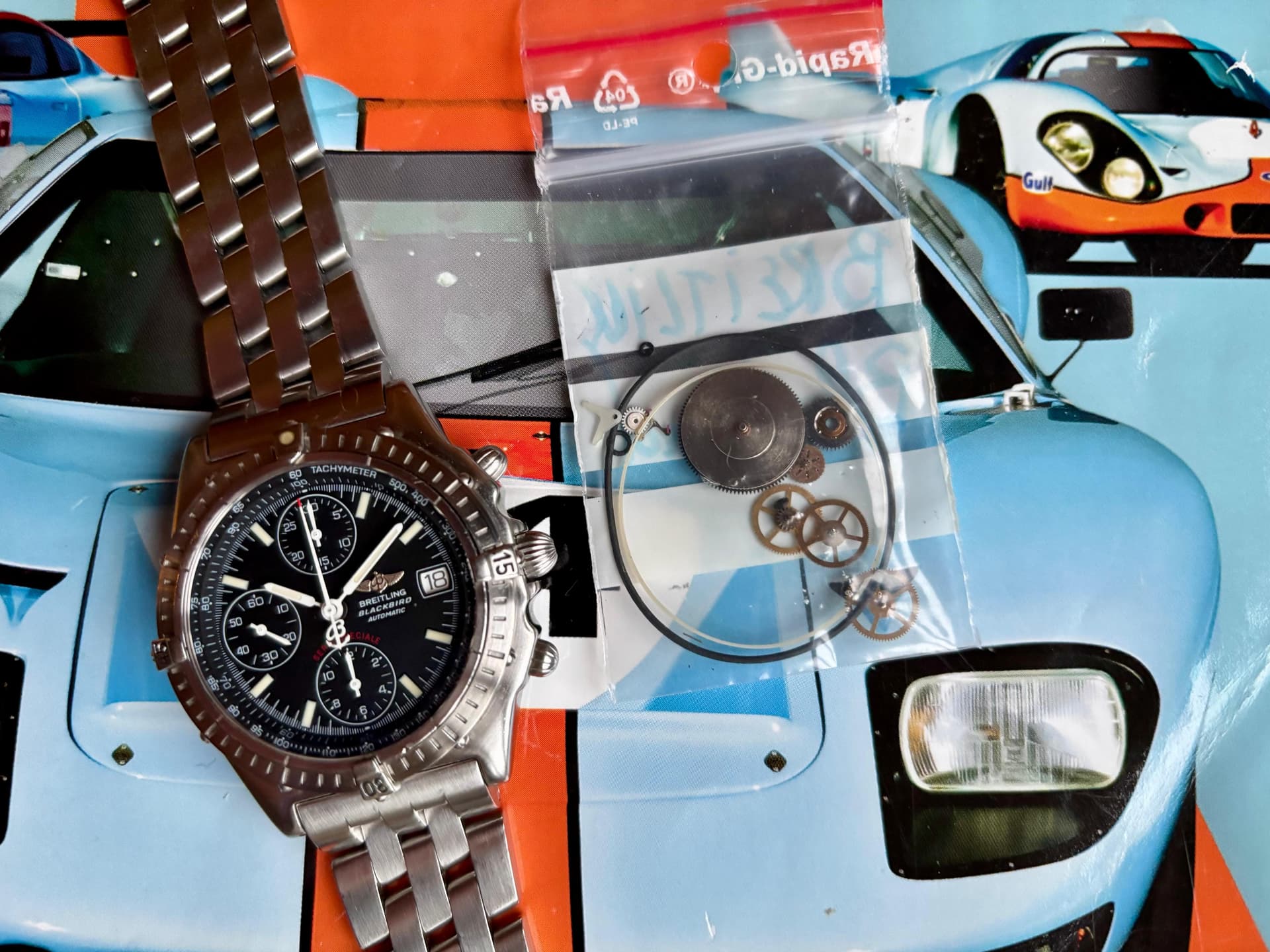 Binnenin tikt het Breitling Caliber 13 Automaat uurwerk. Het horloge is vorig jaar volledig geserviced door mijn vaste, zeer ervaren horlogemaker. Ik heb nog nooit een beurt laten doen waarbij zoveel onderdelen zijn vervangen onder andere de veer, het veertonlager, rem, anker en een hele zwik tandwielen, kijk naar de foto en schrik. Sinds deze service is het horloge slechts 6–7 keer gedragen.