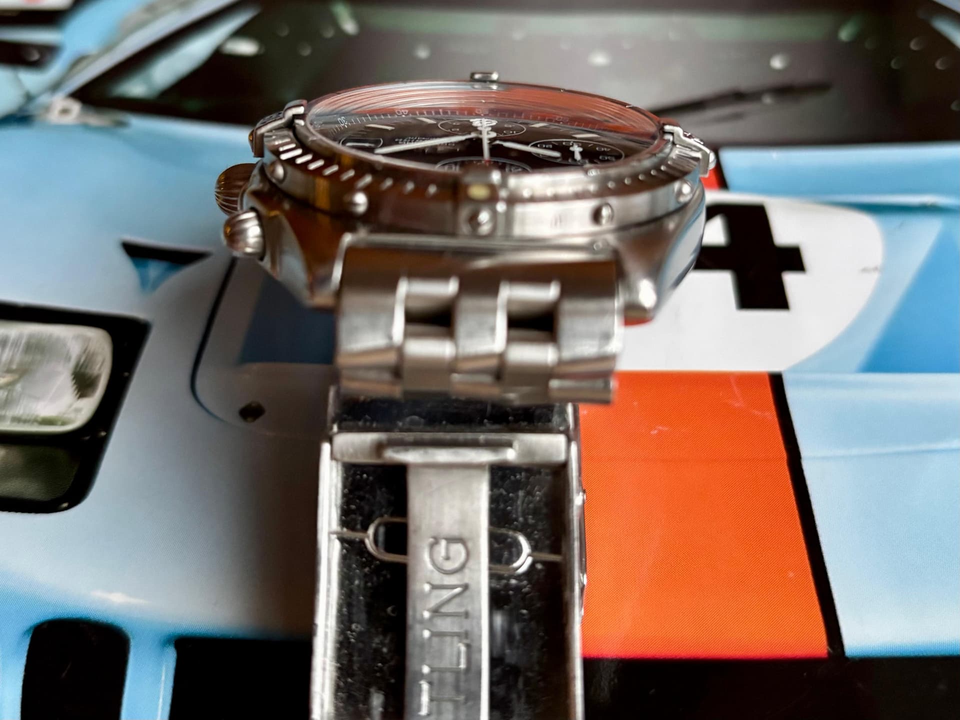 De wijzerplaat is volledig mat en monochroom, zonder contrasterende subdials. De subdials hebben subtiele witte ringe met een rode “Serie Speciale”-opdruk boven de urenteller. Witte wijzers, een chronograafsecondewijzer met felrode tip en lume die langzaam een mooie vanillekleur krijgt. Het aangebrachte goud/bronzen Breitling B-Wings logo brengt de wijzerplaat echt tot leven.