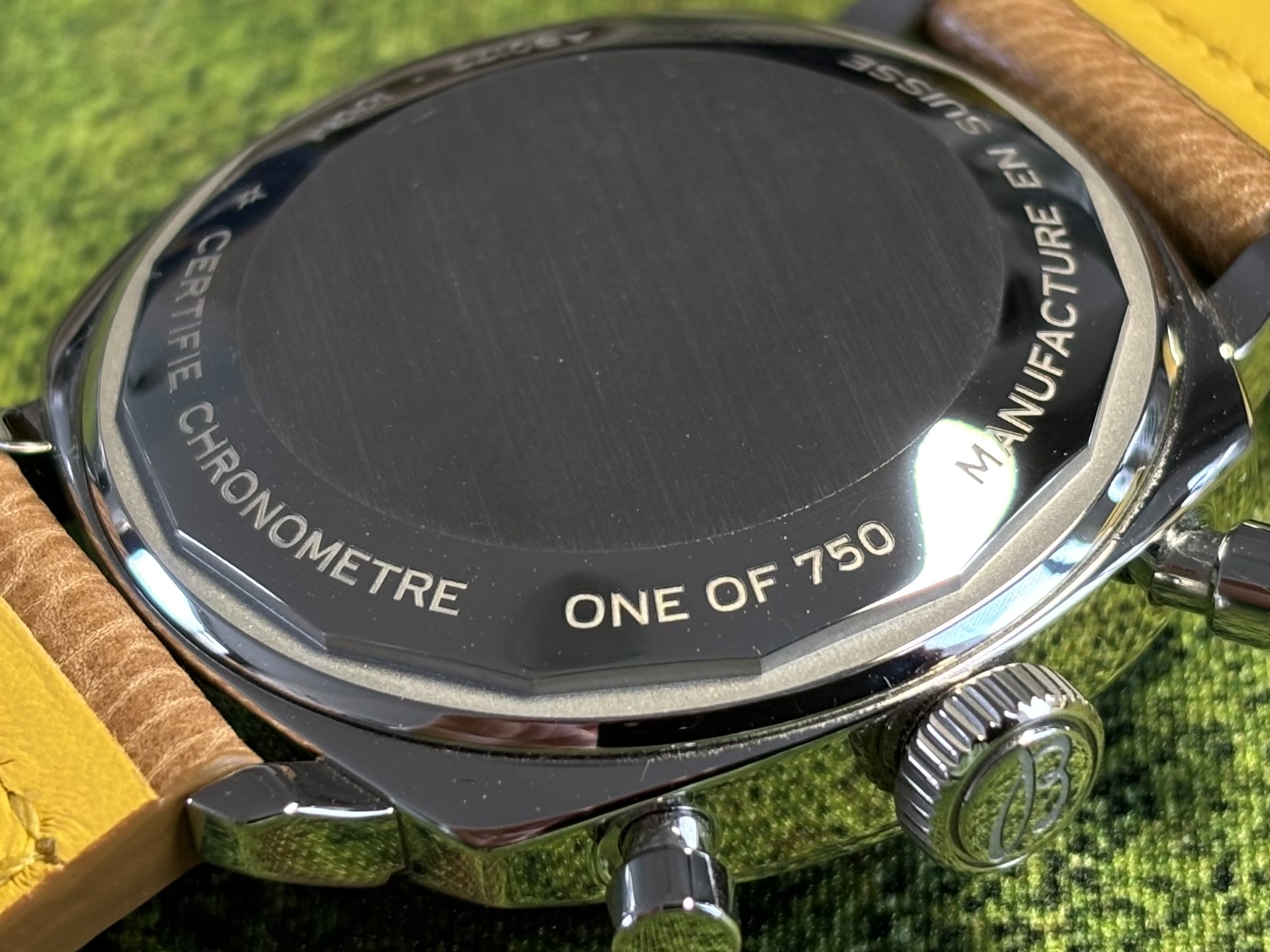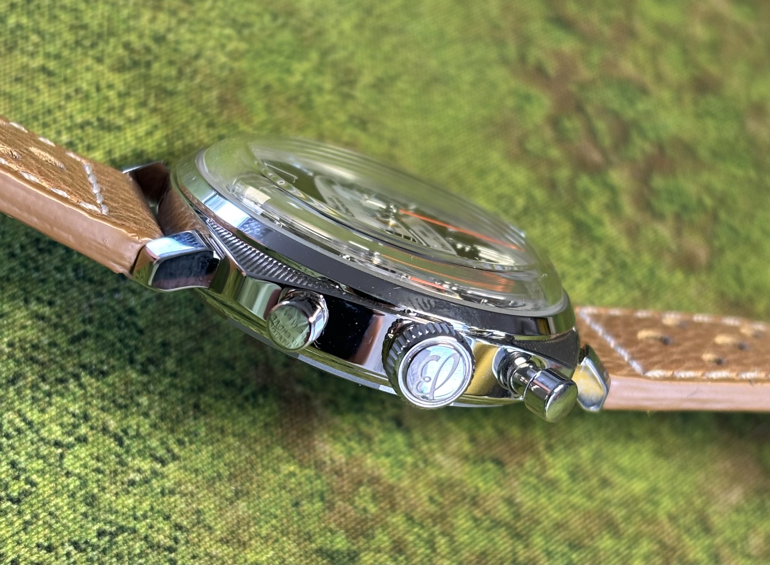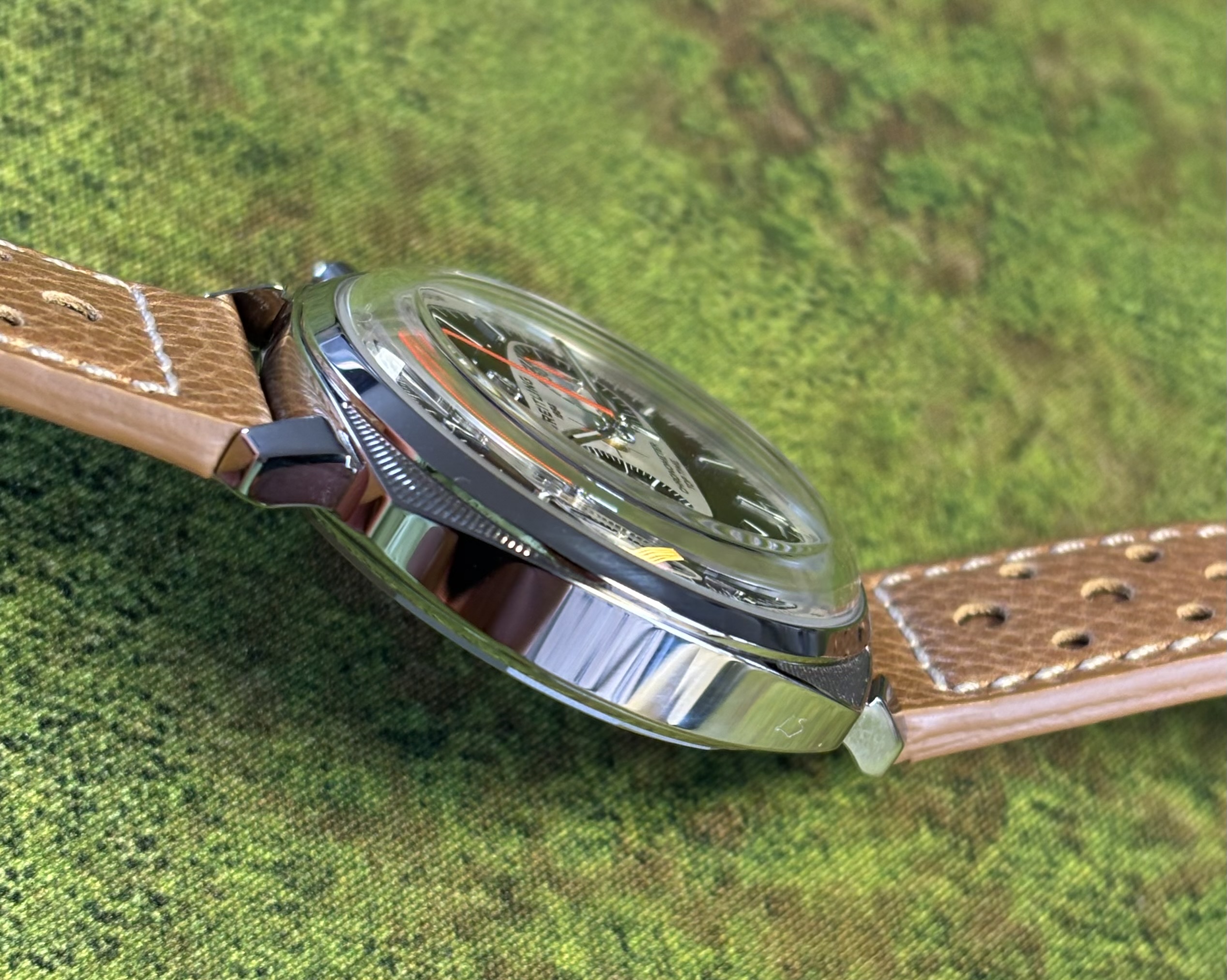 Deze erg mooie classic chrono is een paar keer gedragen, op een “eigen” zwarte band … de originele band is dus ook nieuw en ongedragen.