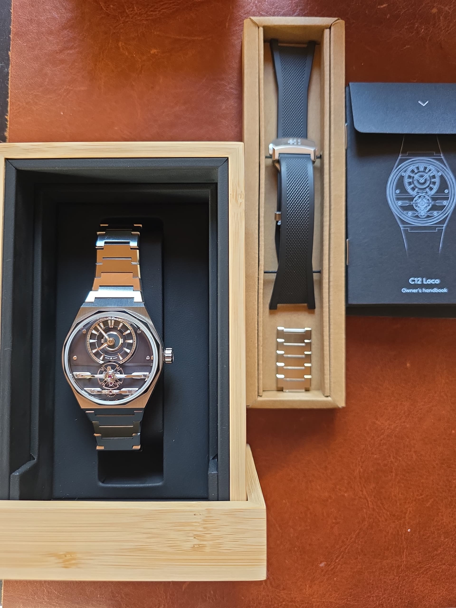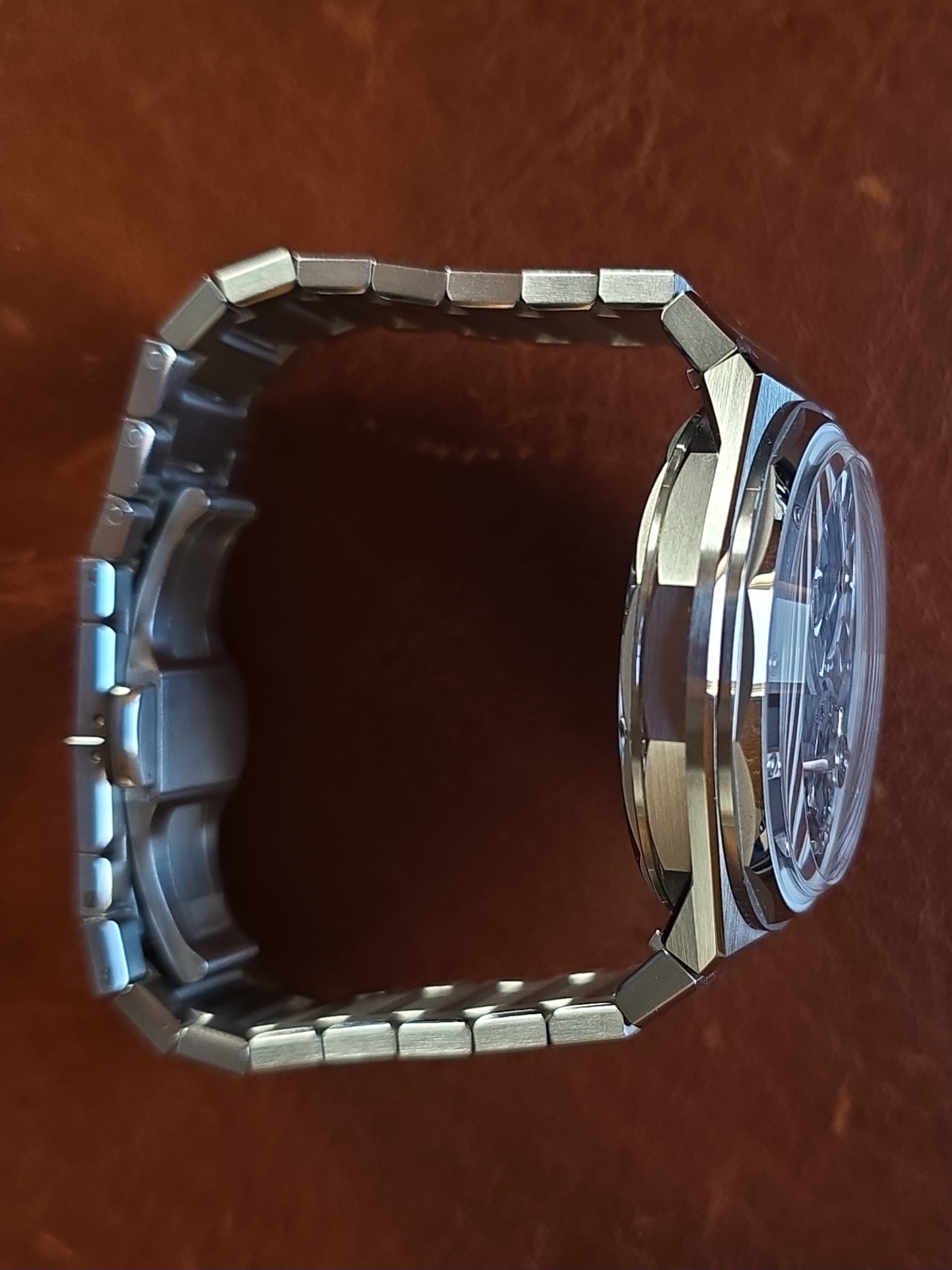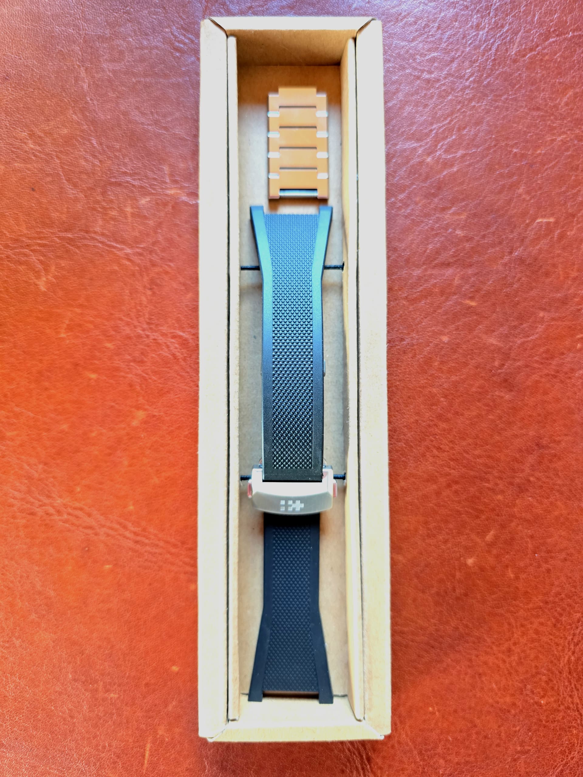 Het horloge komt op zijn quasi-geïntegreerde metalen band, en met een extra rubberen band. De metalen band is bijna niet gedragen.