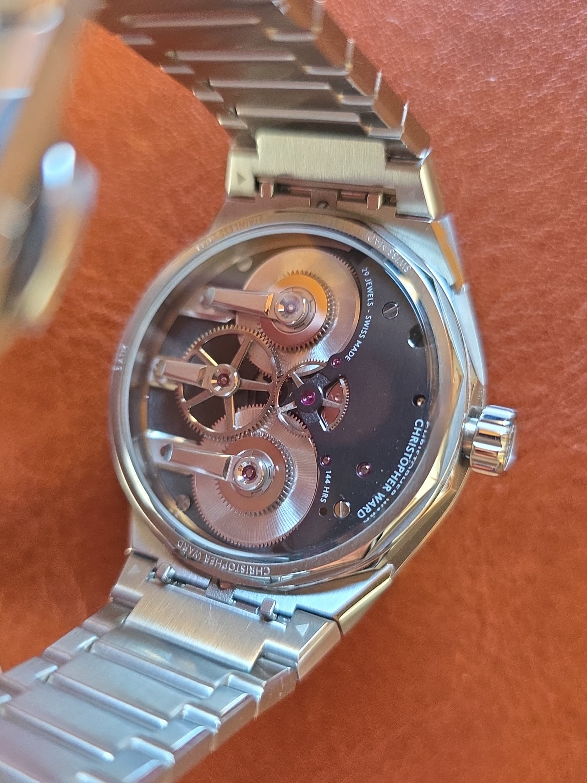 Free sprung balance wheel en het escapement zijn zichtbaar aan de voorzijde. En de achterzijde is minstens zo indrukwekkend, want daar zitten de dubbele veertonnen, die voor de 144 uur reserve zorgen!