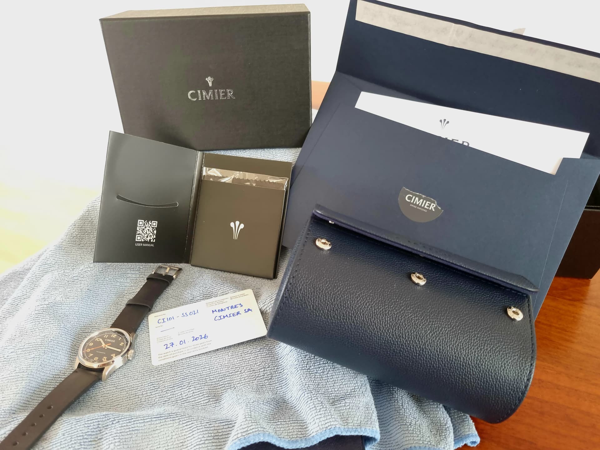 | Originele doos en/of eventuele accessoires: | outer box, CIMIER watchrol voor 2 horloges, garantiekaartje d.d. 27-1-2026, factuur en poetsdoekje |