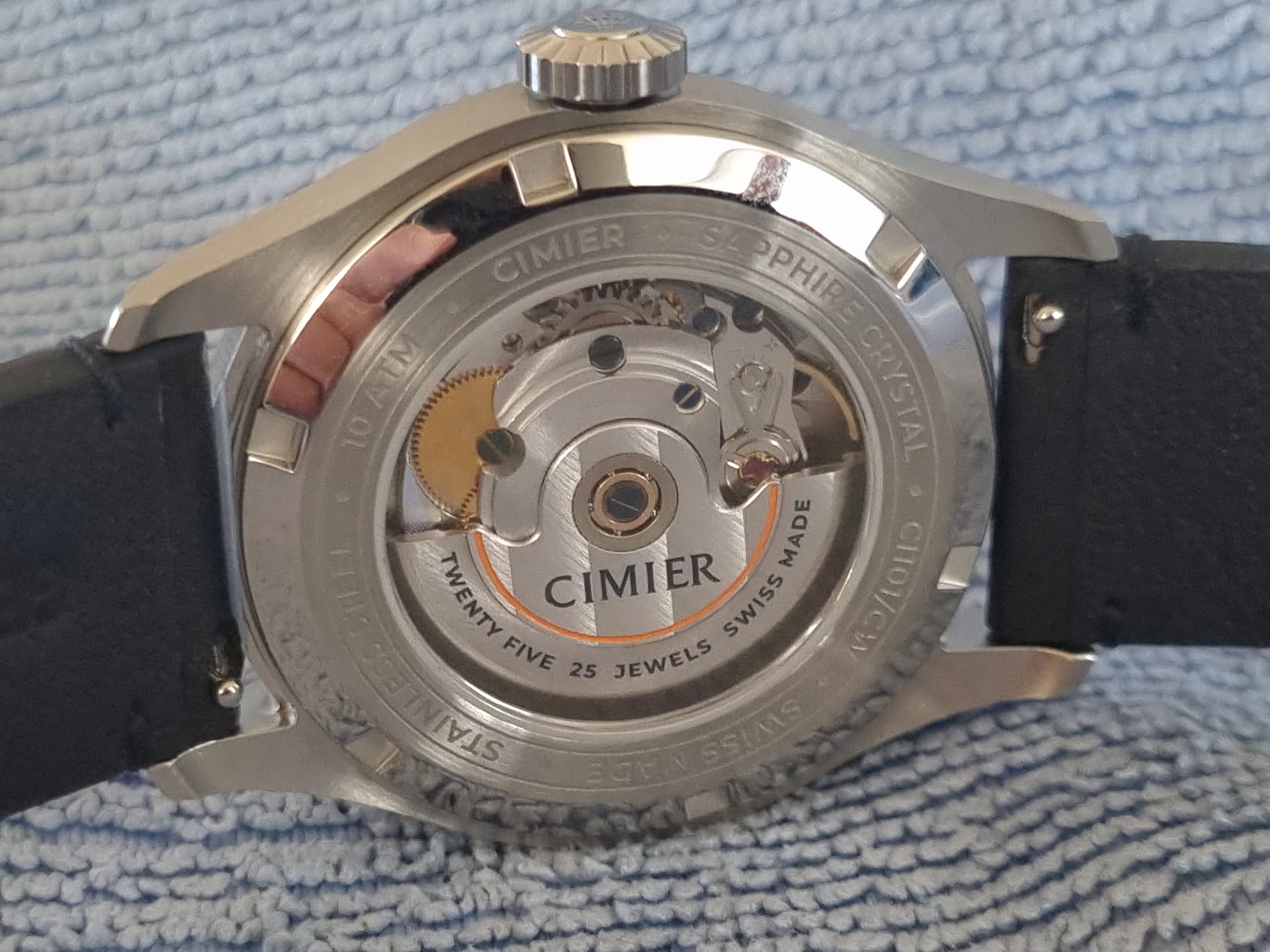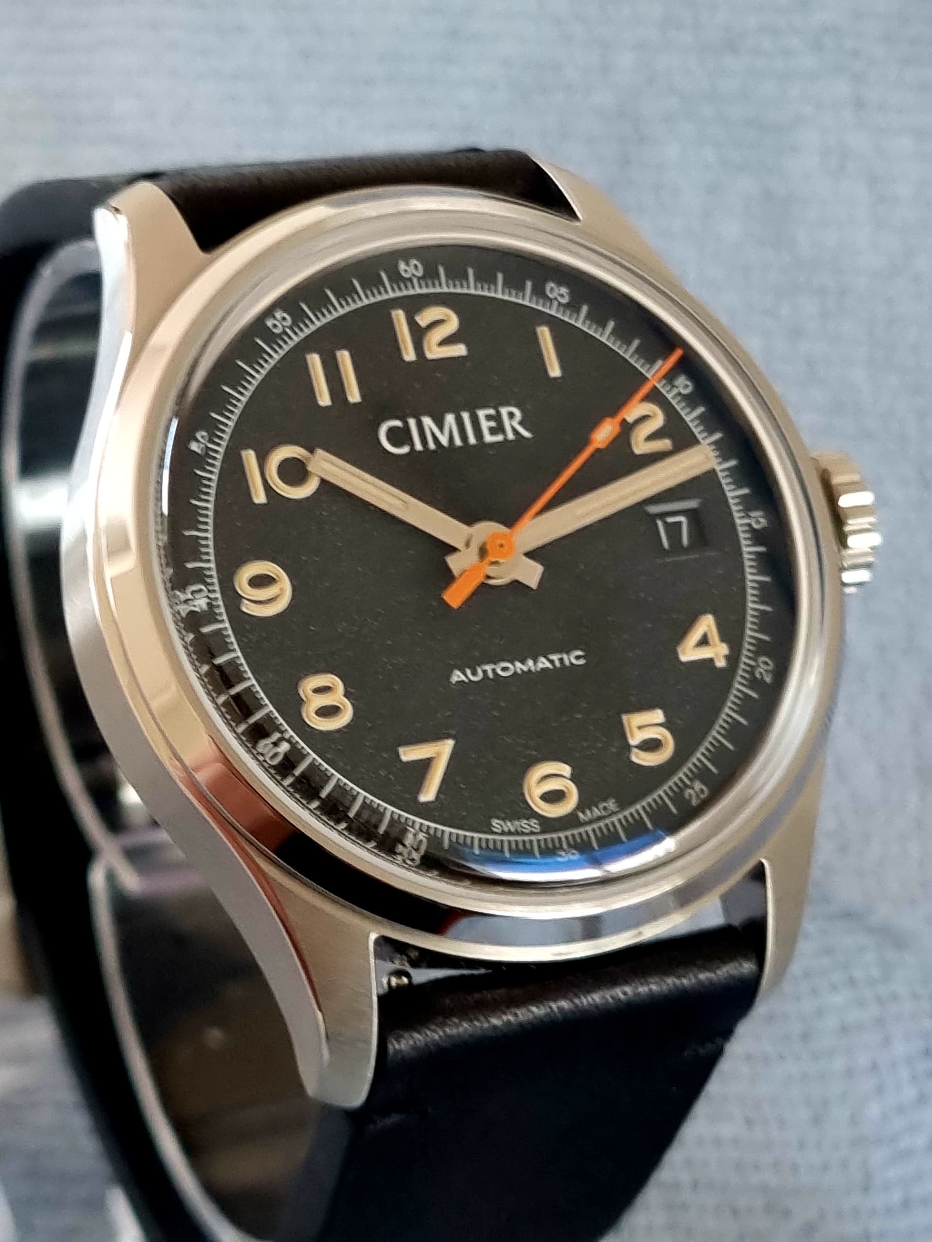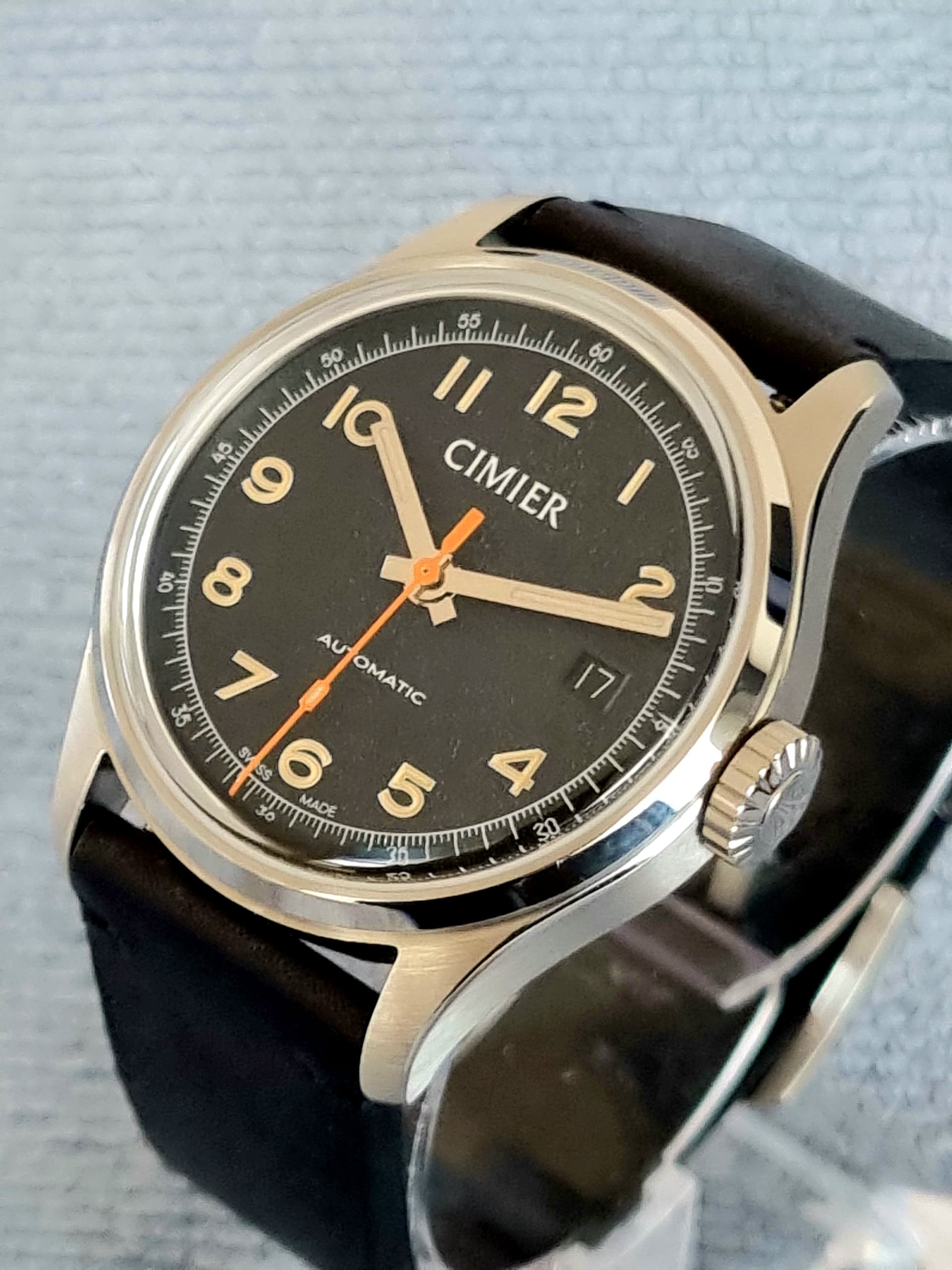 Deze mag zijn reis vervolgen binnen dit forum. Nieuwe field watch van CIMIER, een gerevitaliseerd Zwitsers merk, met mooie afmetingen, een matzwarte wijzerplaat met ZOAB look (?), donker datum veld en retro lume. Grote geschroefde en gesigneerde kroon, see through case back ongebruikte zwarte vintage-achtige band. Ik kwam hem tegen op Monochrome