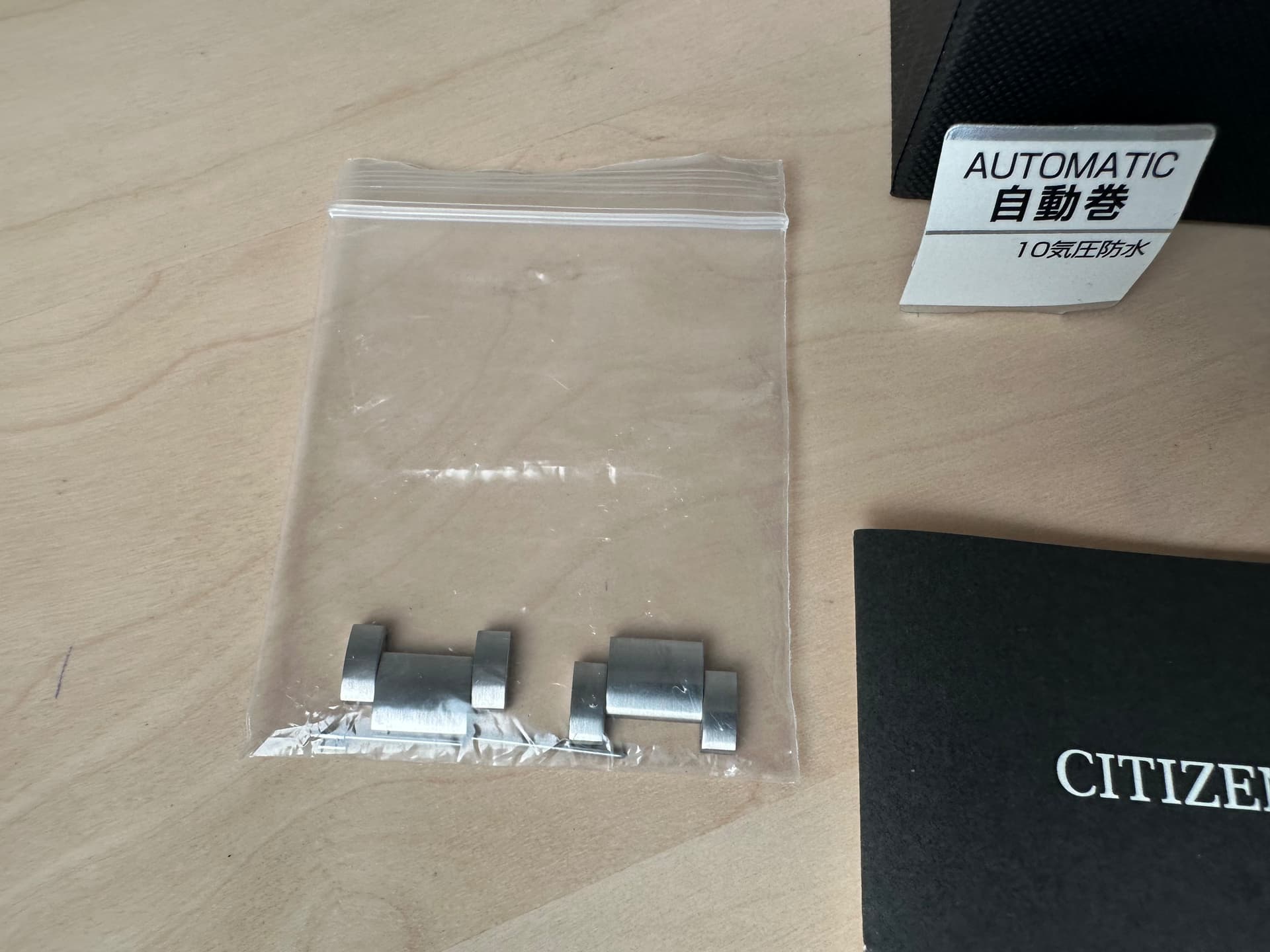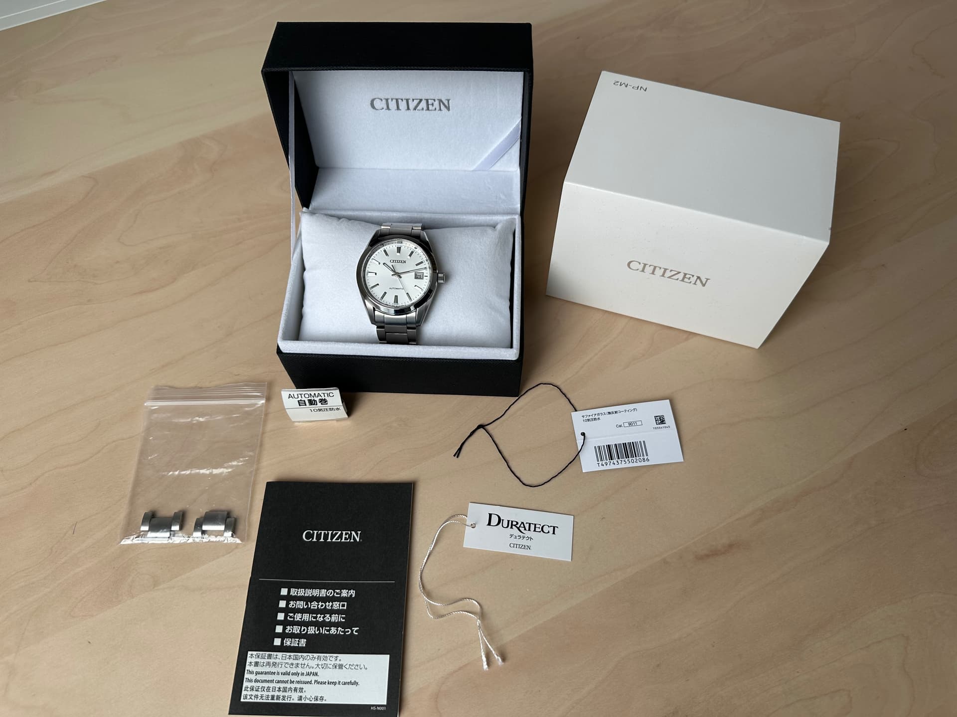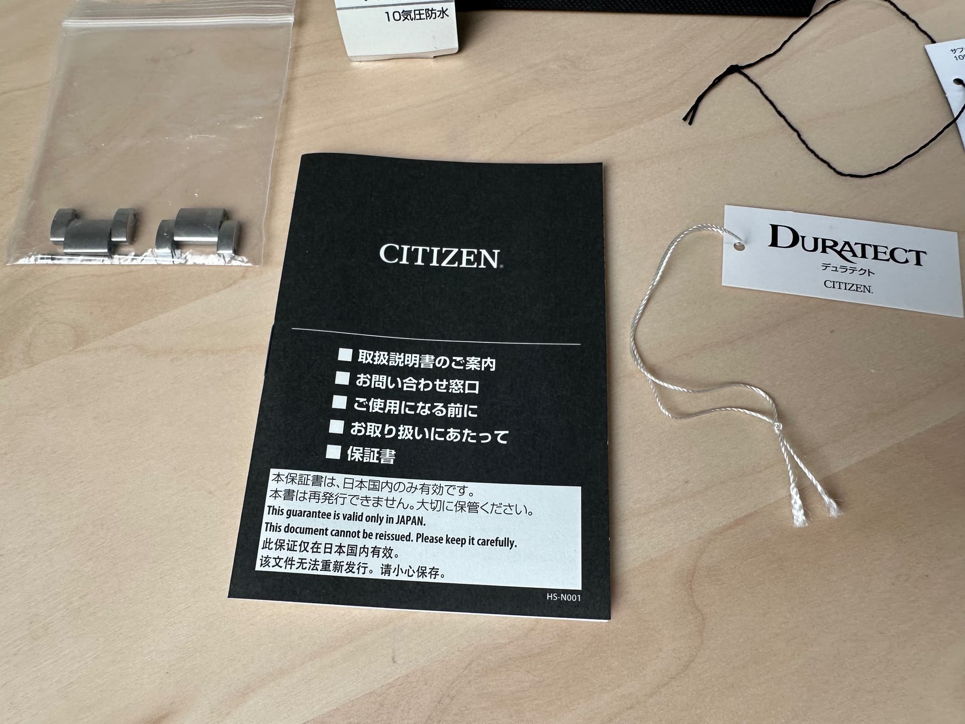 (zie foto’s: omdoos, doos, extra schakels, tag, garantie boekje (dat alleen in Japan geldig is)).