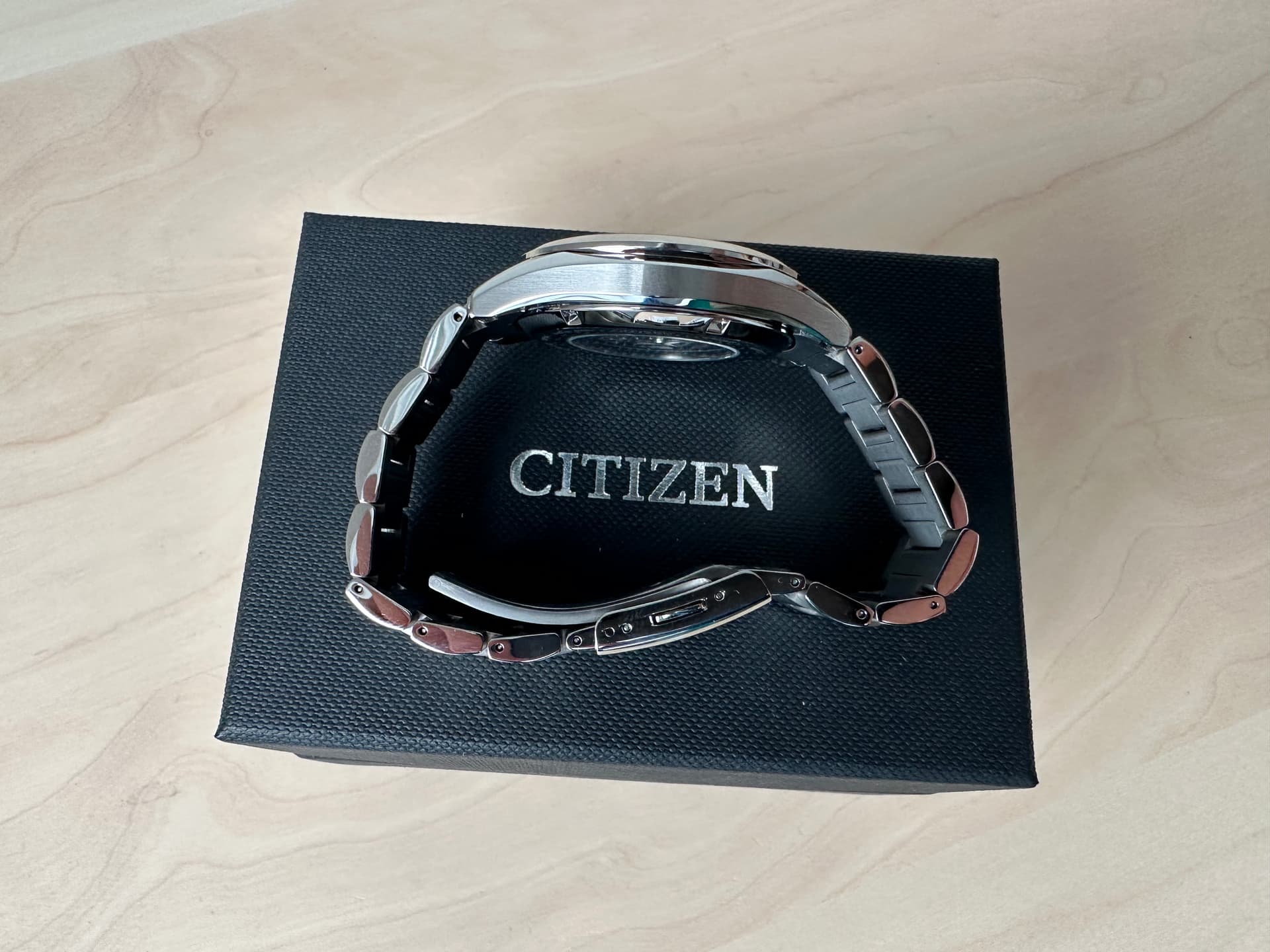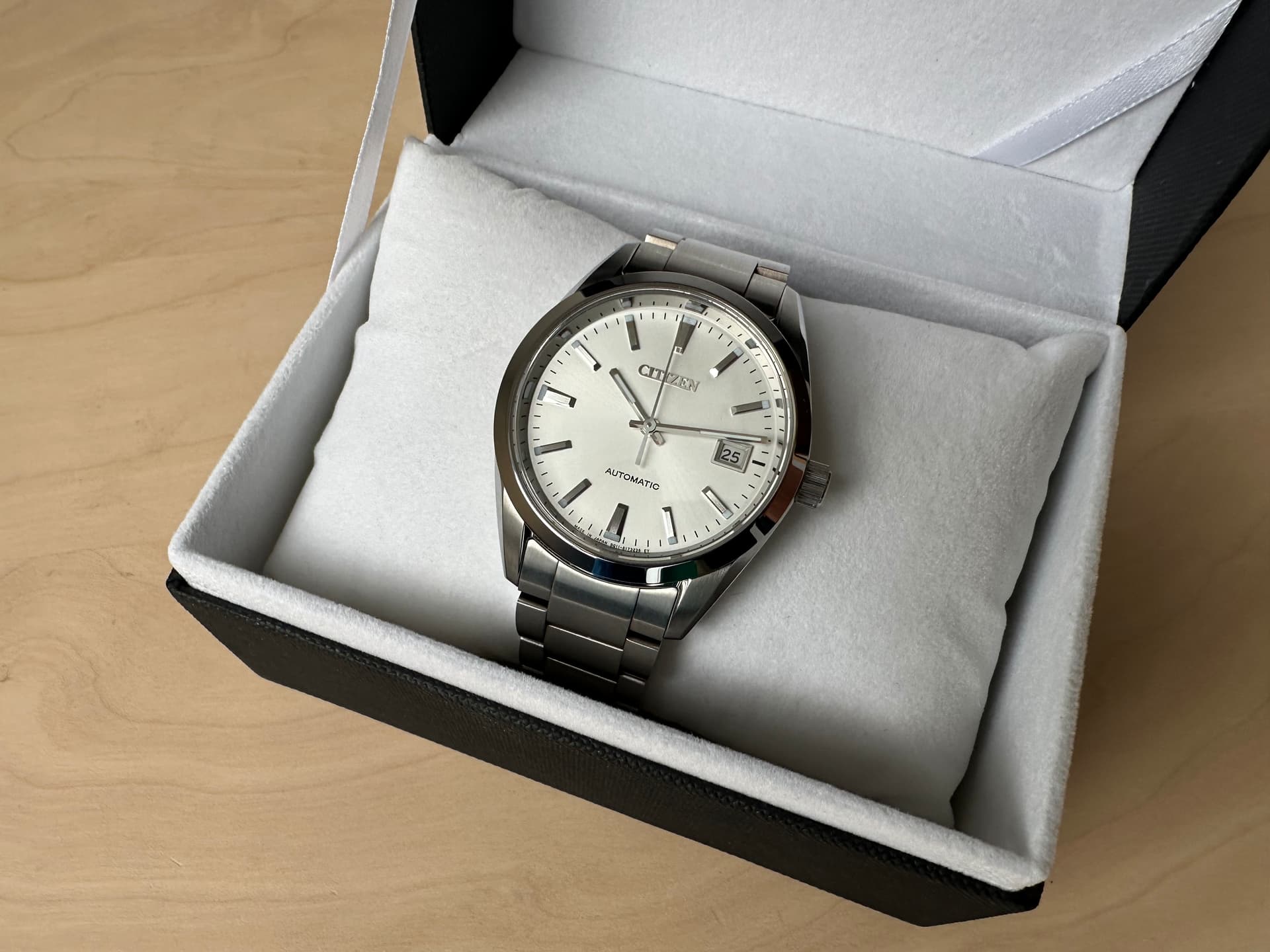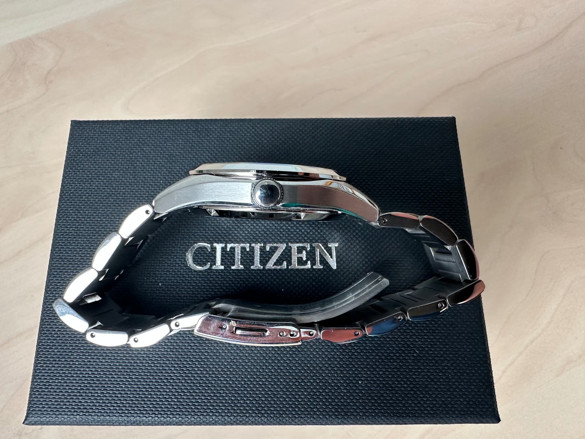 Aangezien ik vooral mijn Black Bay 58 (via het forum gekocht) draag, heb ik besloten mijn Citizen te verkopen. Ik heb het een enkele keer binnenshuis gedragen. De conditie (krassen, werking) is dus zo goed als nieuw. Afhankelijk van de lichtinval kleurt de wijzerplaat wit en/ of lichtgrijs. Hoe meer licht, hoe witter.