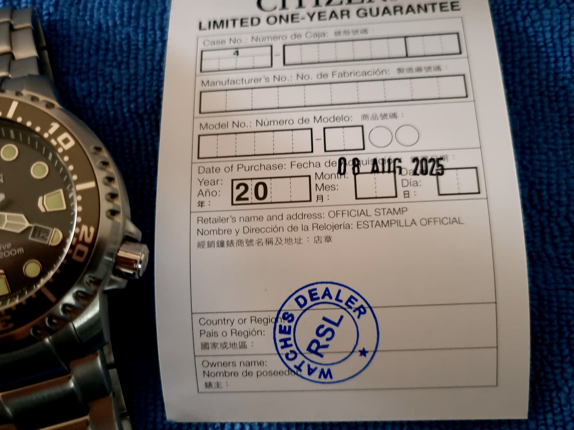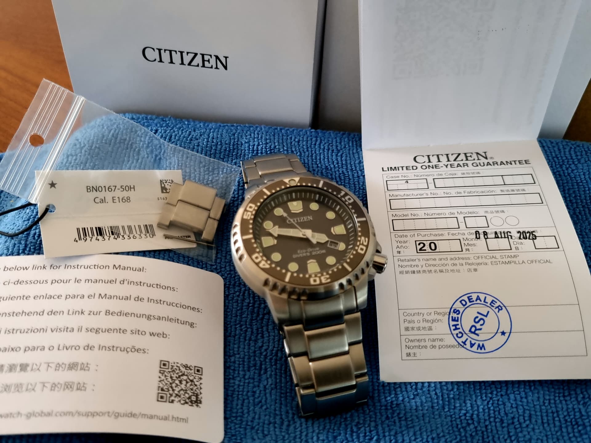 Originele doos en/of eventuele accessoires: Full set met boxes, tag en uitgenomen schakels, garantiekaartje gestempeld 8 augustus 2025
