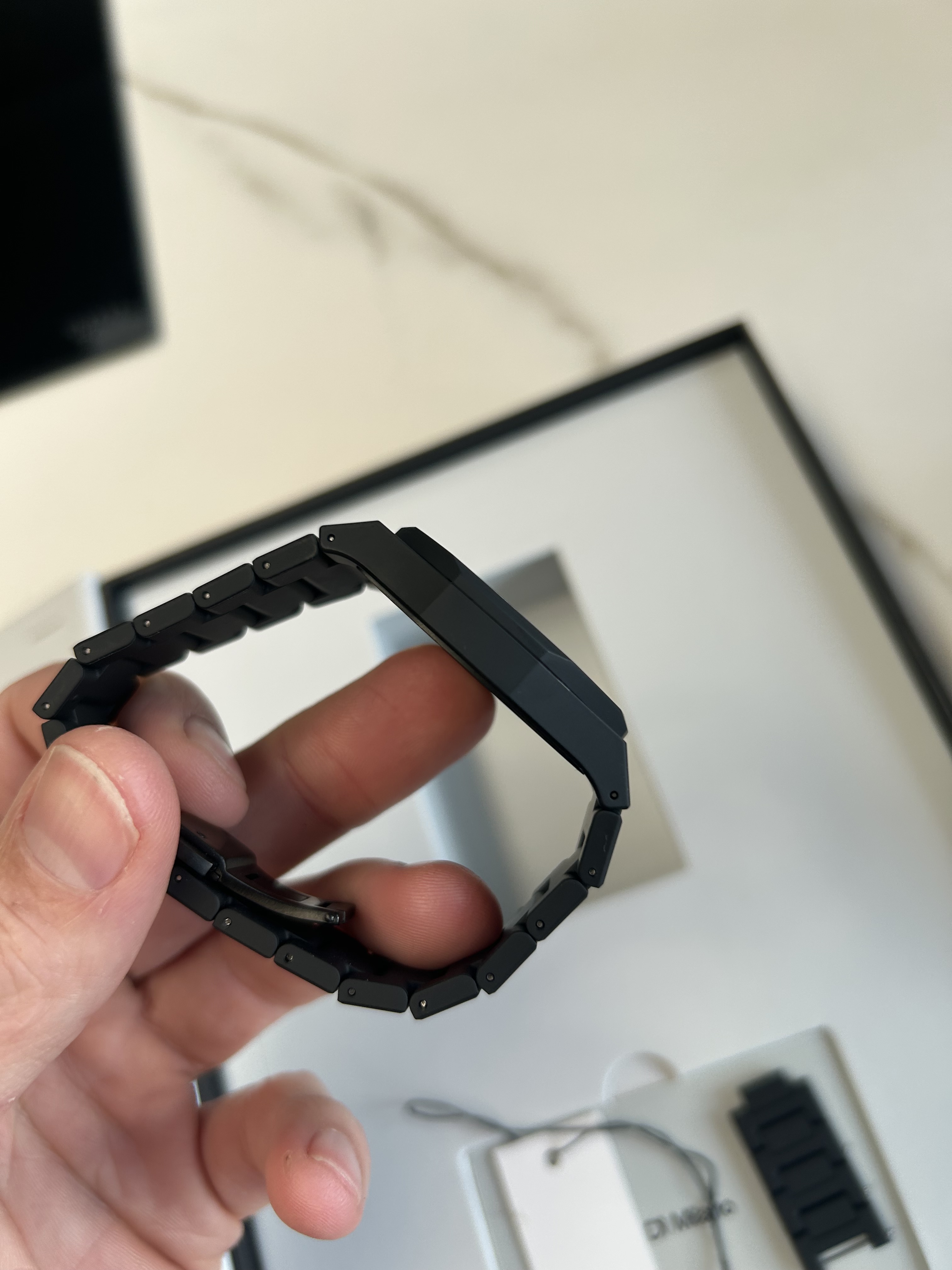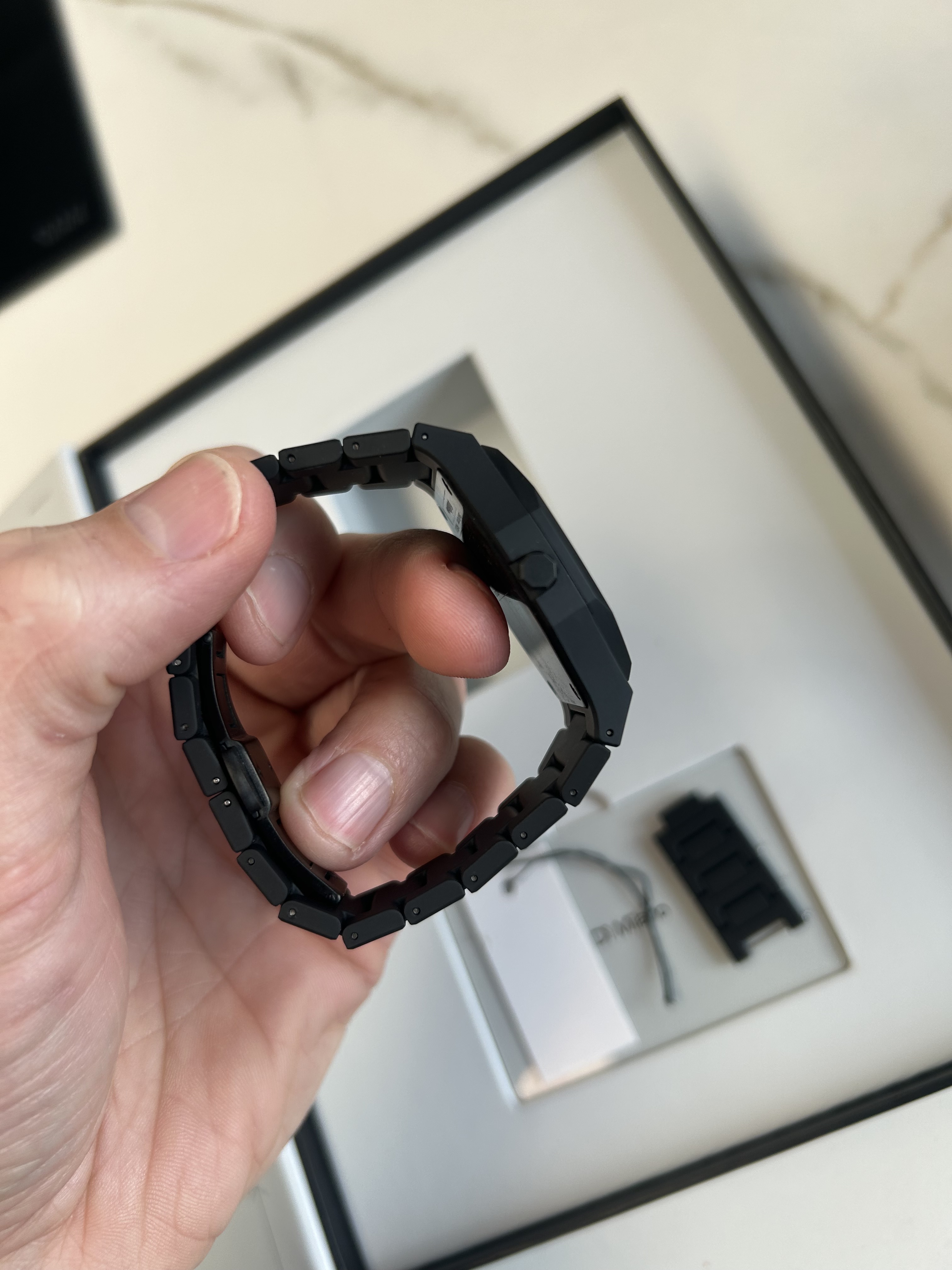 Een enkele keer gedragen. Poly Carbon kast met “soft-touch” band. Wijzerplaats is van Carbon fiber. Draag zeer licht.