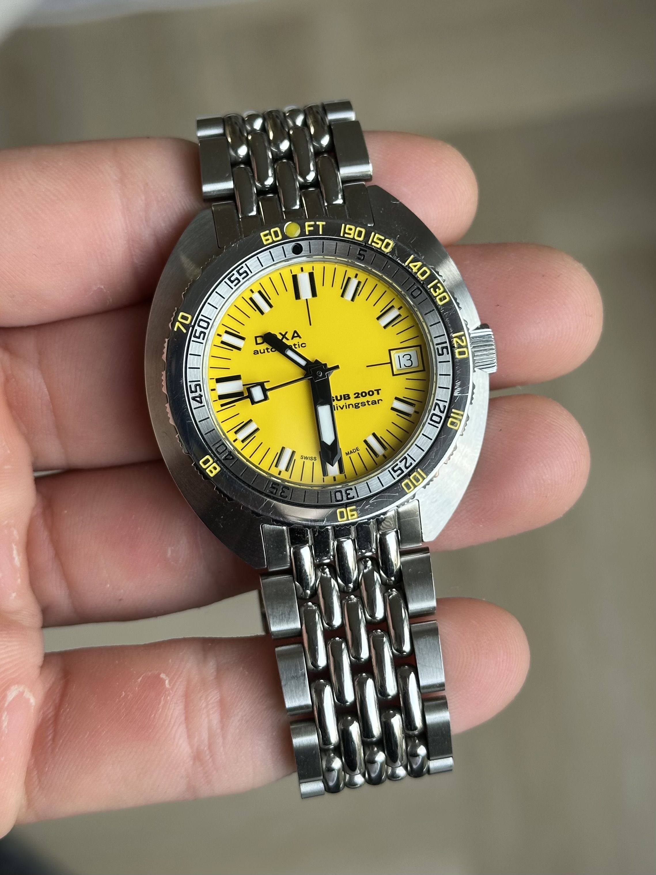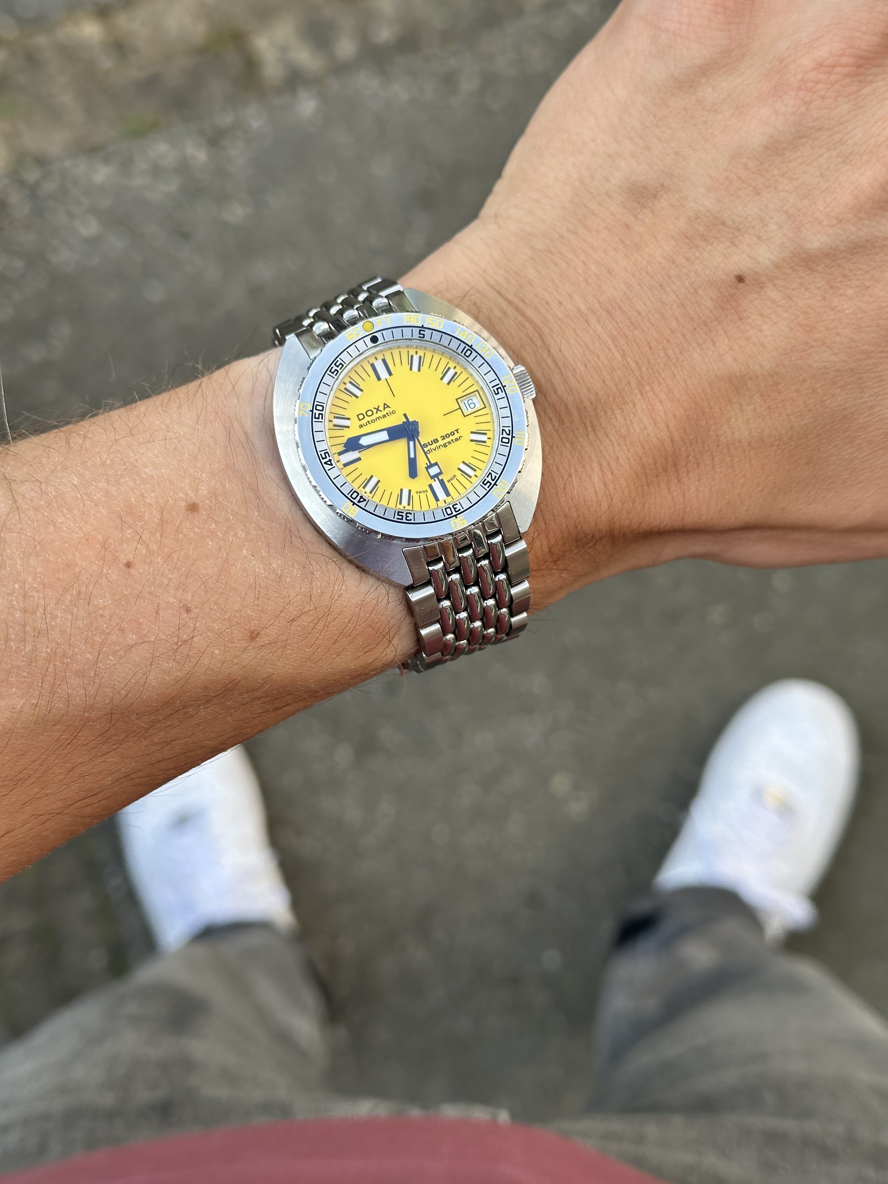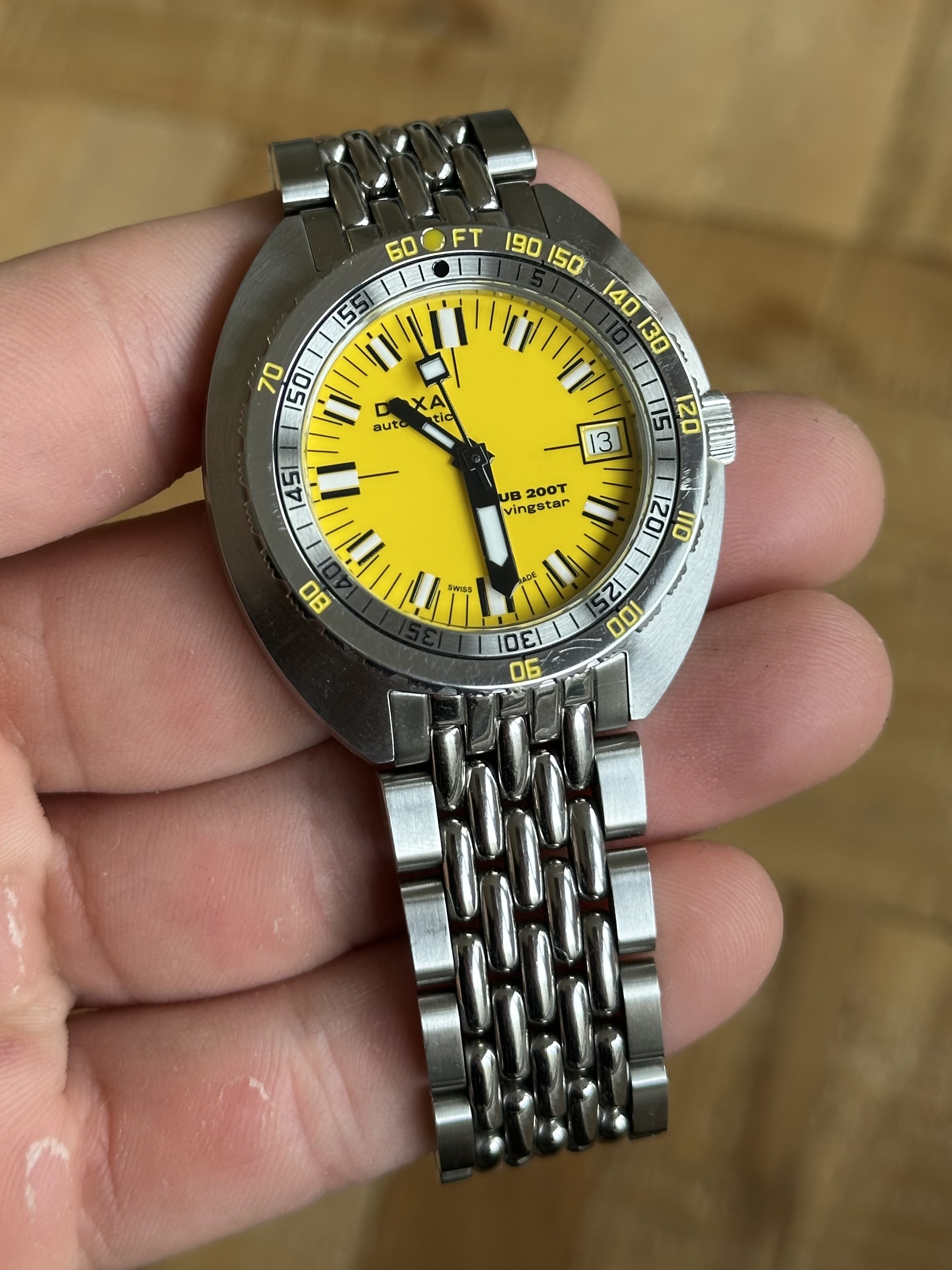 Conditie (krassen, werking etc): zie de foto’s. Verschillende sporen van gebruik, zie je vooral op de sluiting, bezel en sporen van bandwissels onderaan de kast. De prijs is er ook naar ![]()