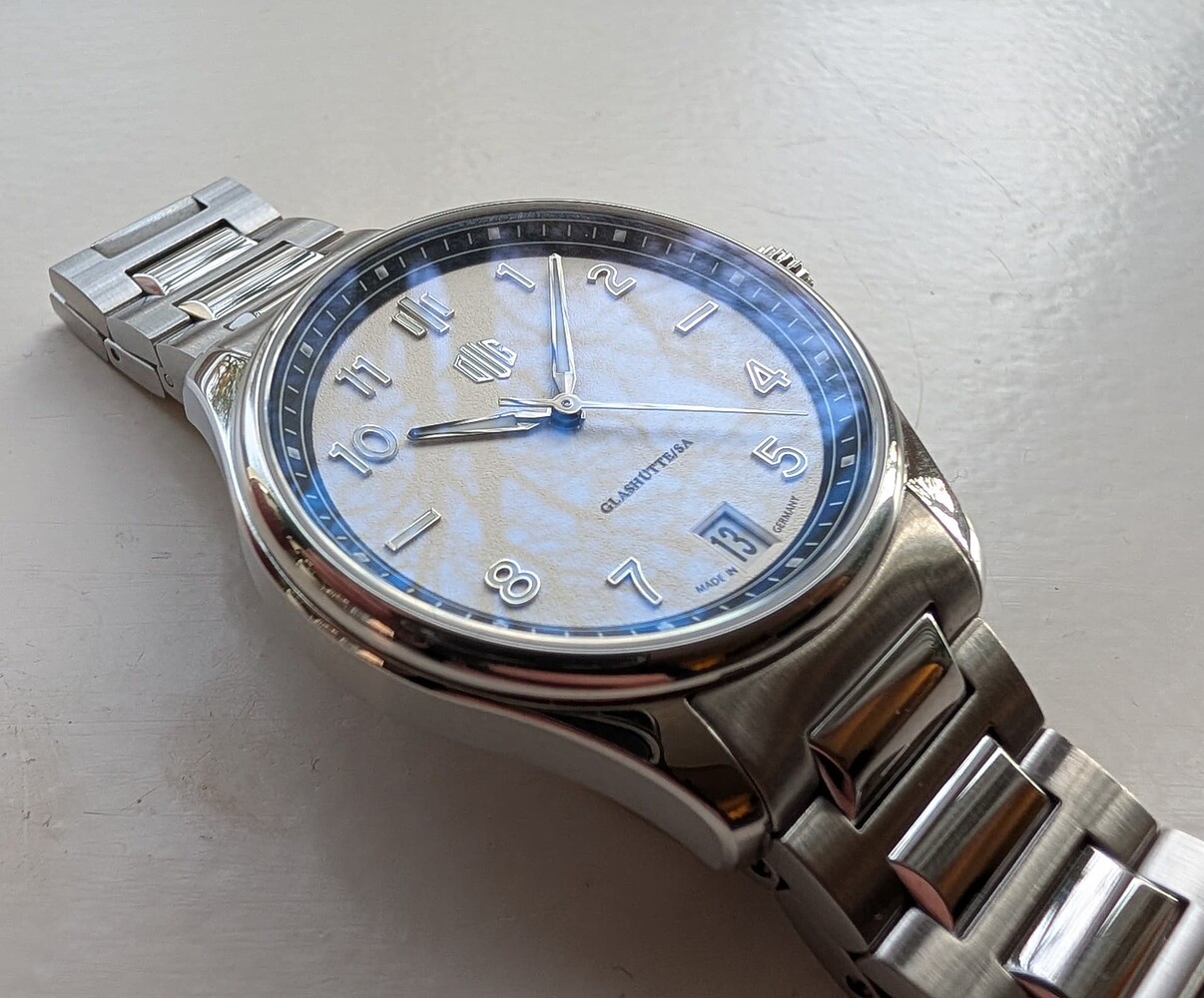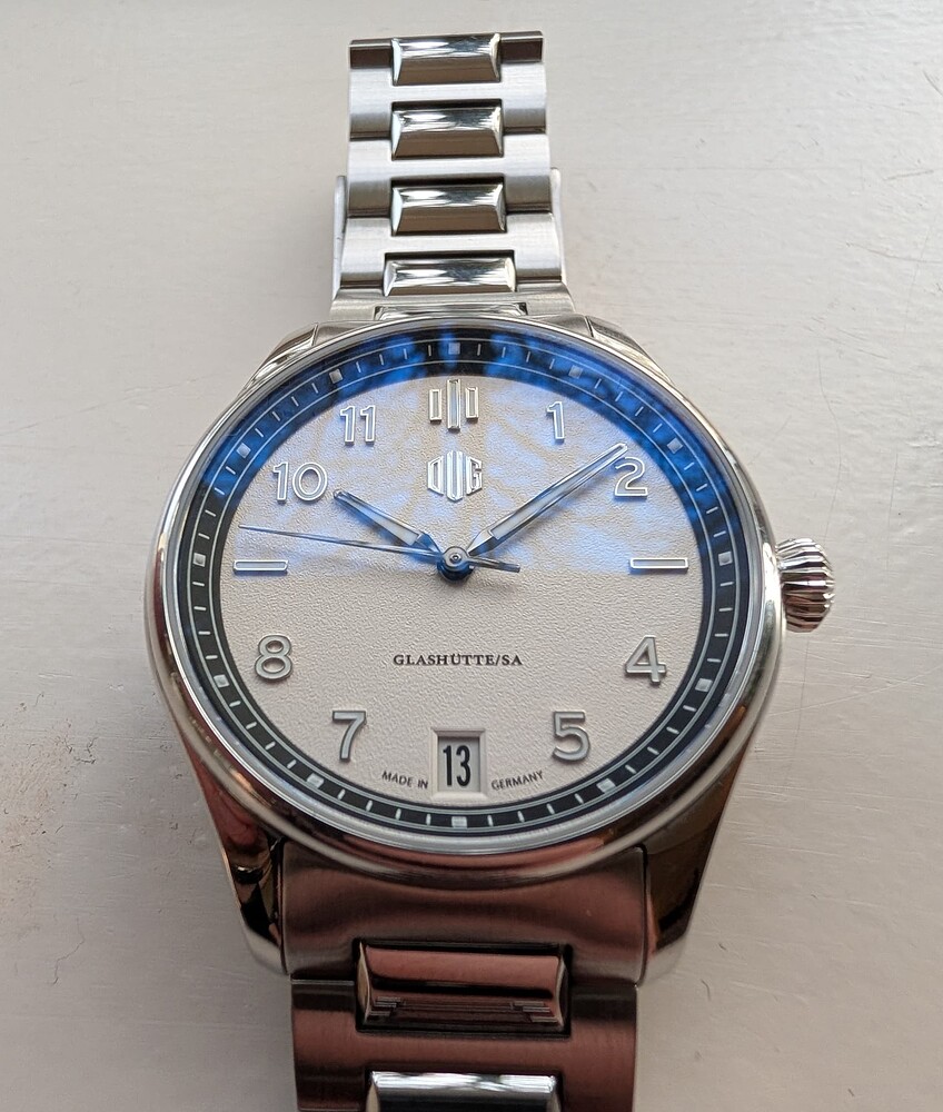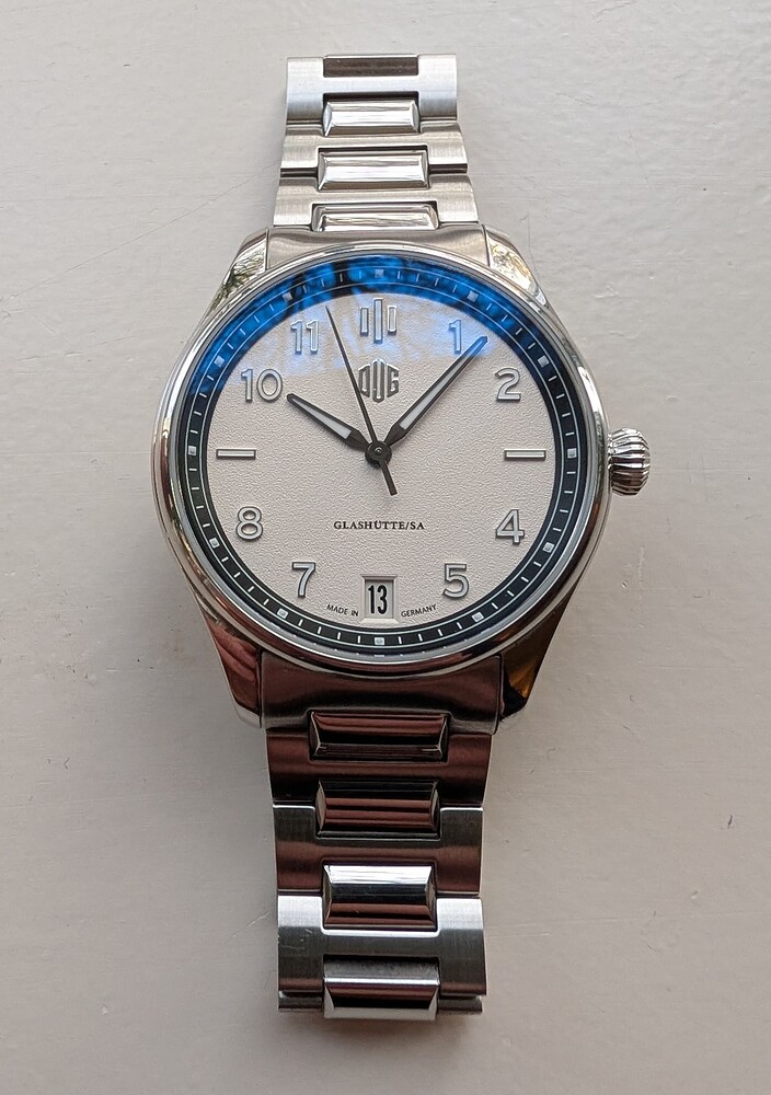 Merk en model: DUG Purist Type 2 Moon White, met datum en stalen band