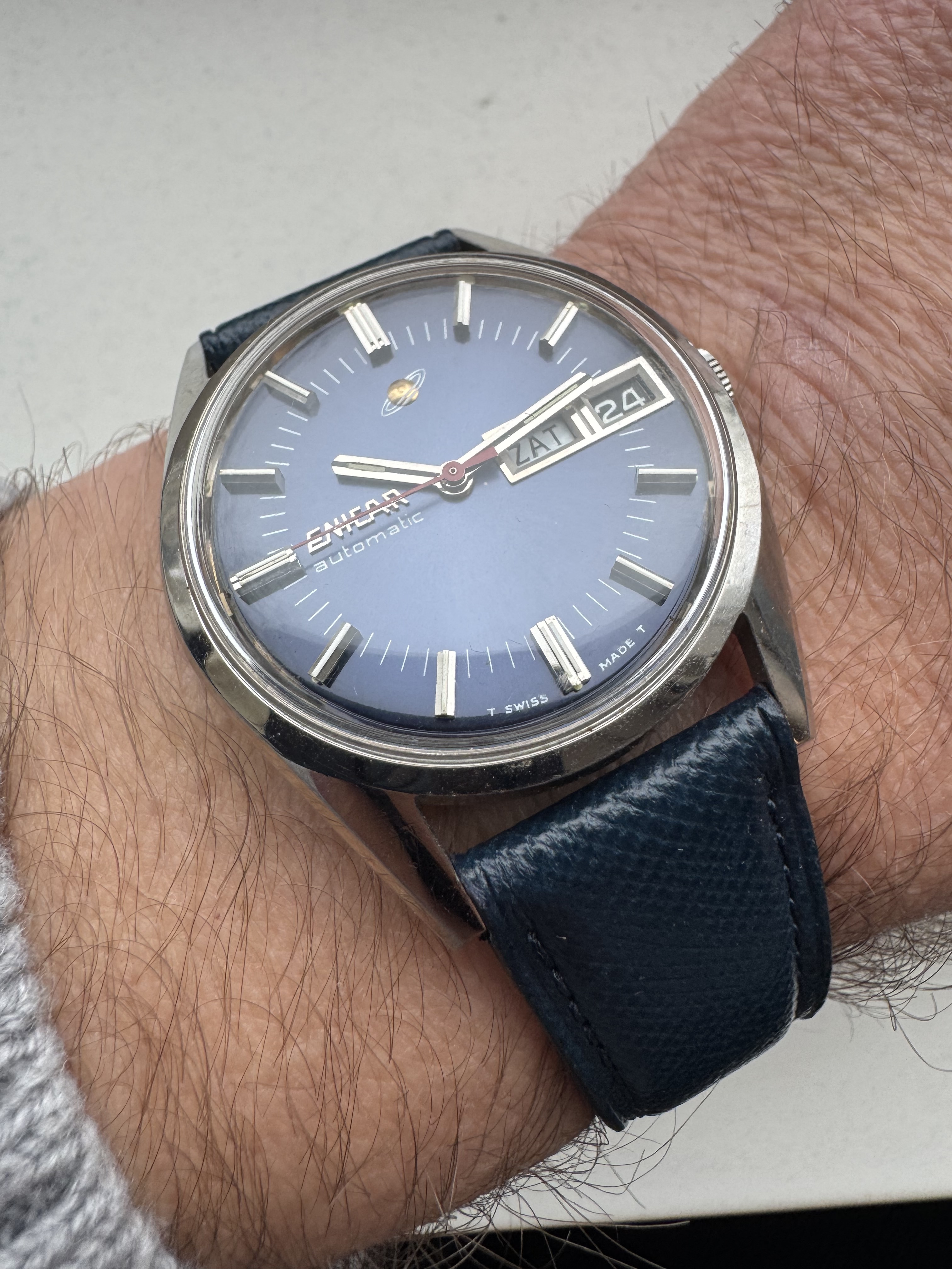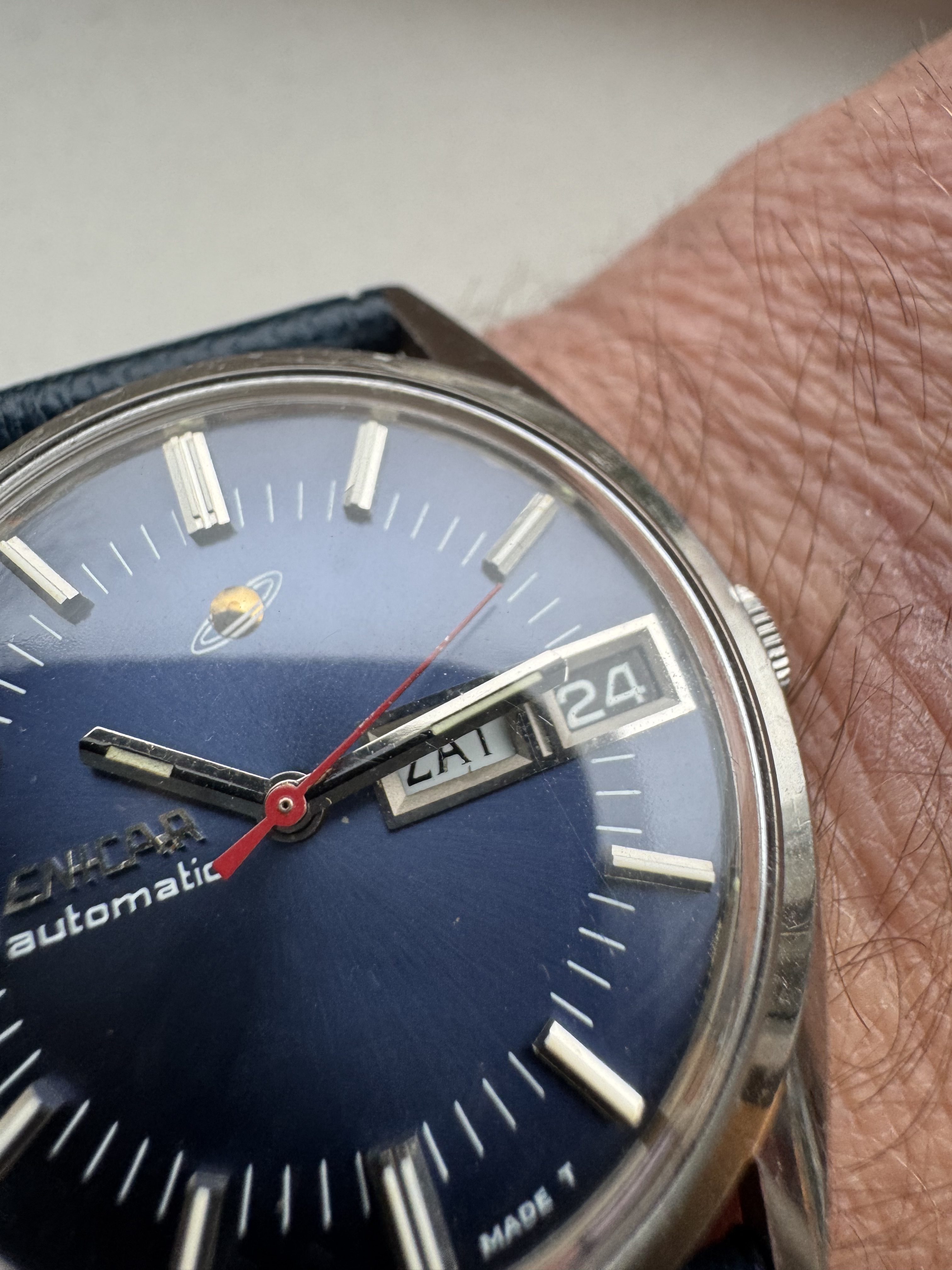 • Soort uurwerk en de werking: Enicar manufactuur kaliber AR 1147 automaat met Dag-Datum (Nederlandstalige dagschijf!). Het uurwerk loopt uitstekend en heeft in 2024 een volledige service gehad bij Clockwise.
