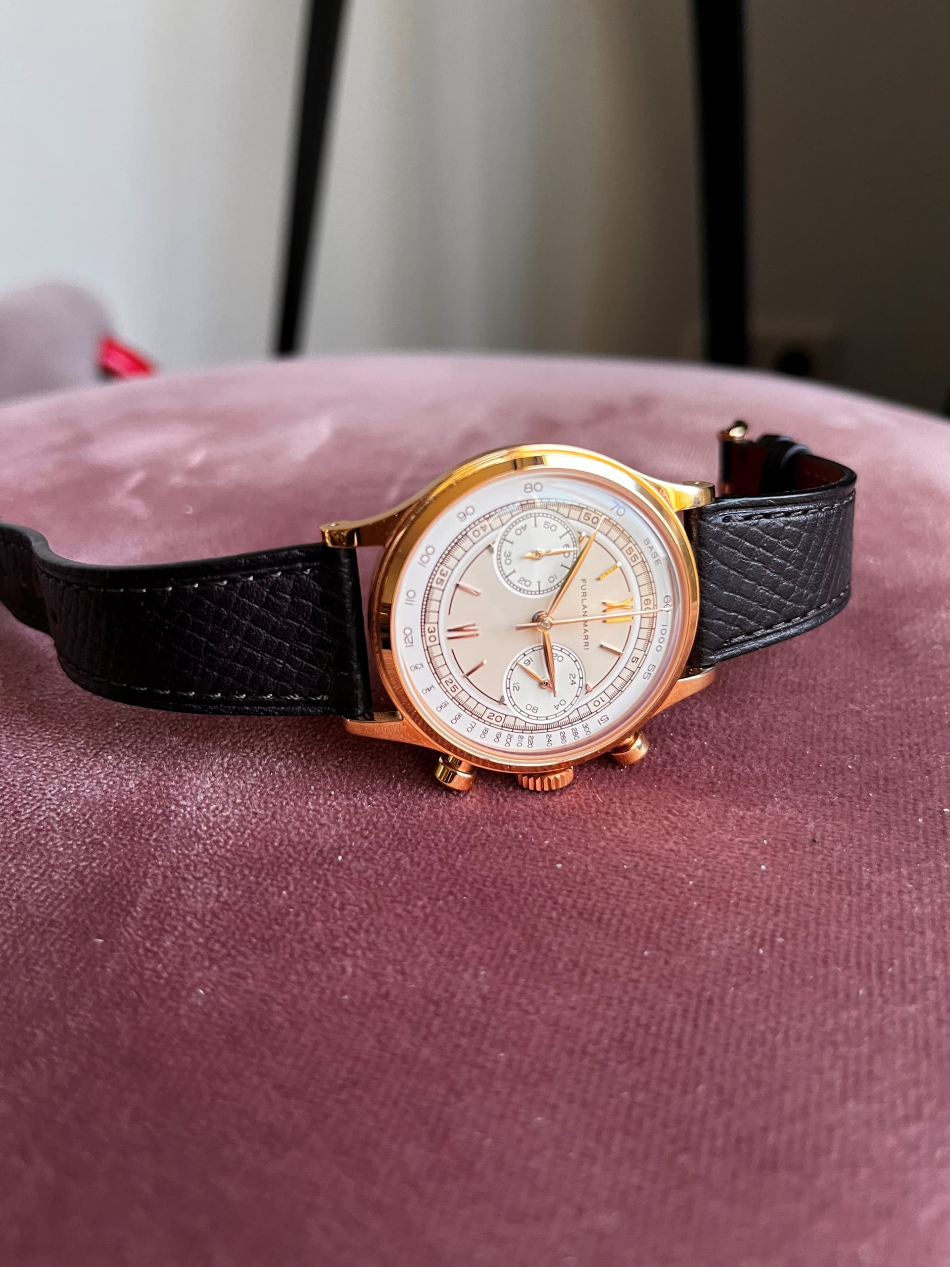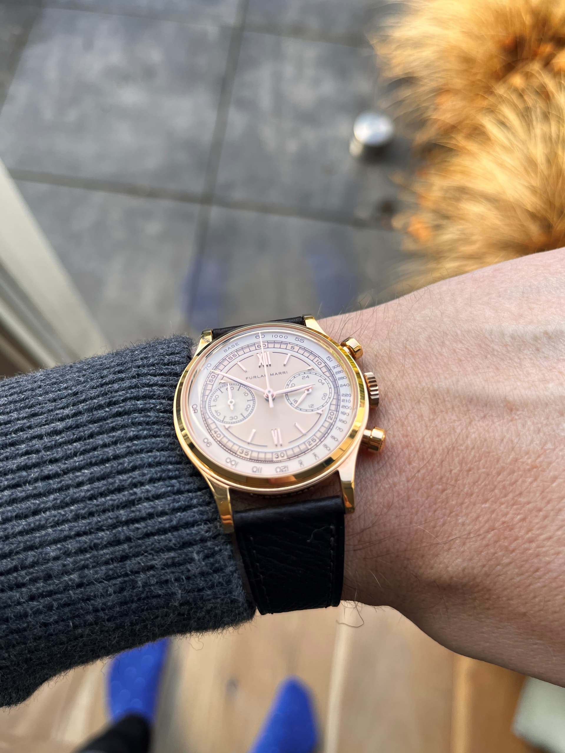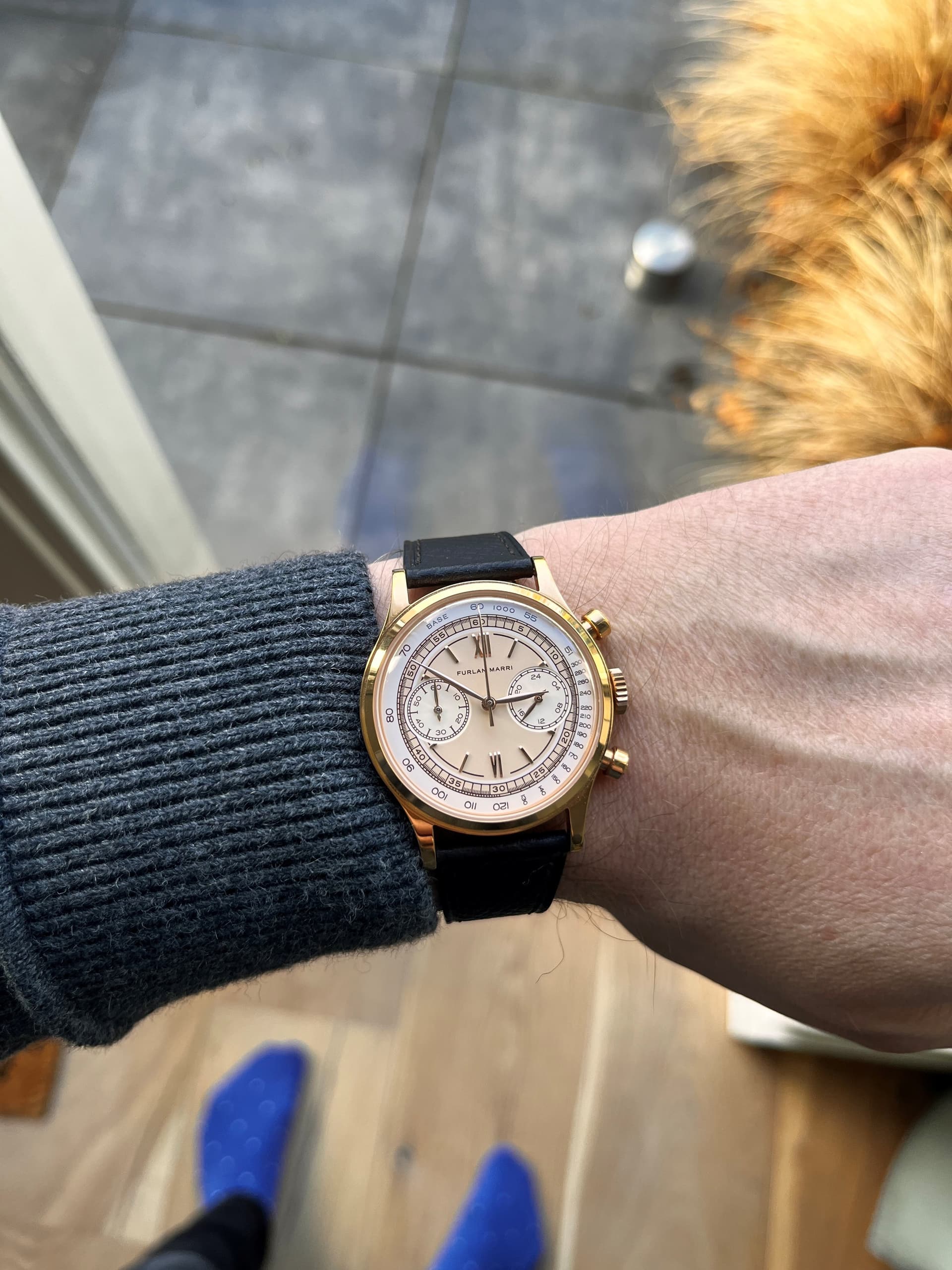 Hoewel ik weg ben van de vintage-look chronograafstijl, merk ik dat de PVD roségouden kast voor mijn persoonlijke smaak net iets te ‘shiny’ is. Hij krijgt daarom te weinig polstijd, en dat is zonde. Een buitenkans voor wie deze hippe, hoogwaardige microbrand zoekt!
