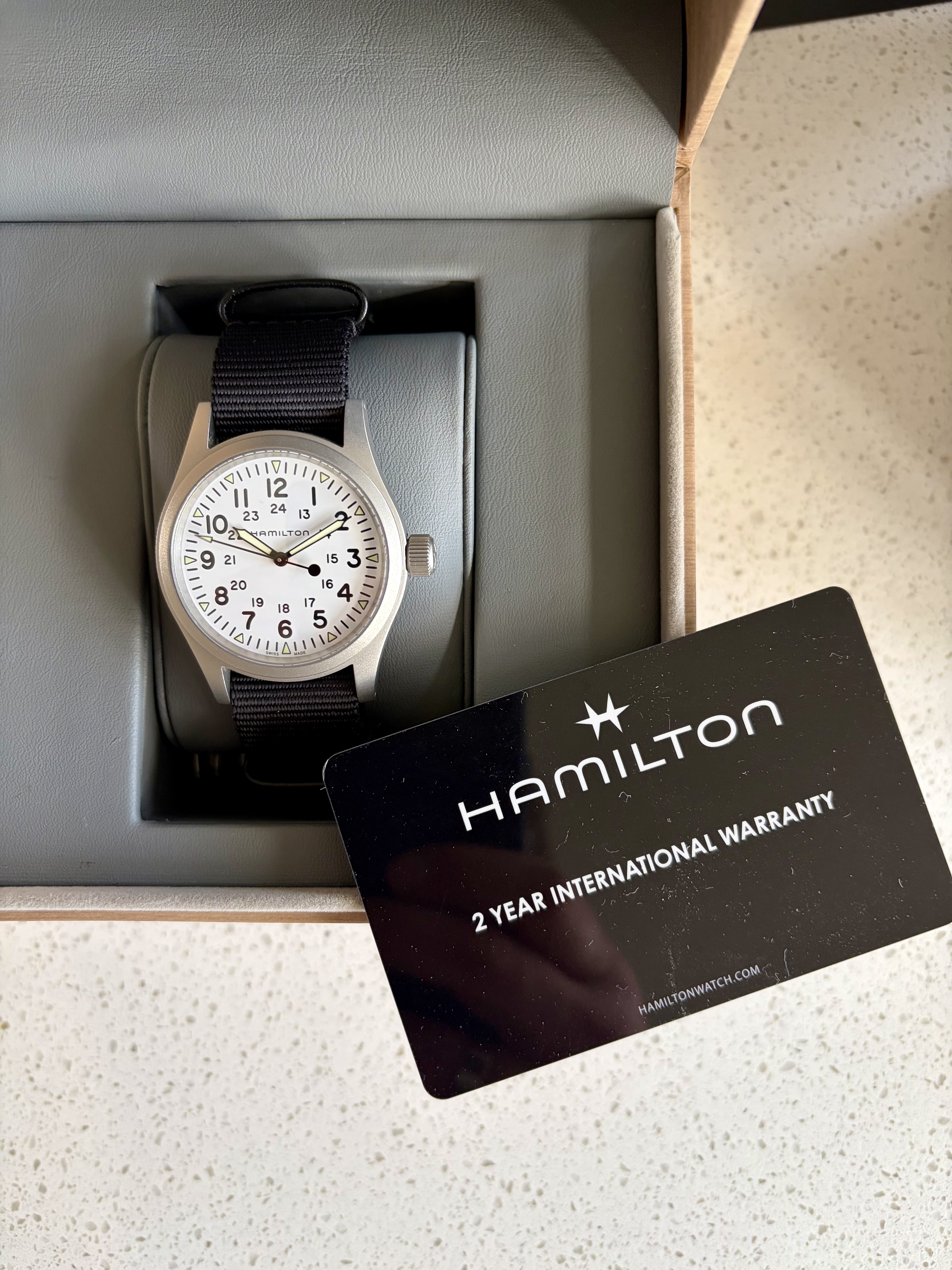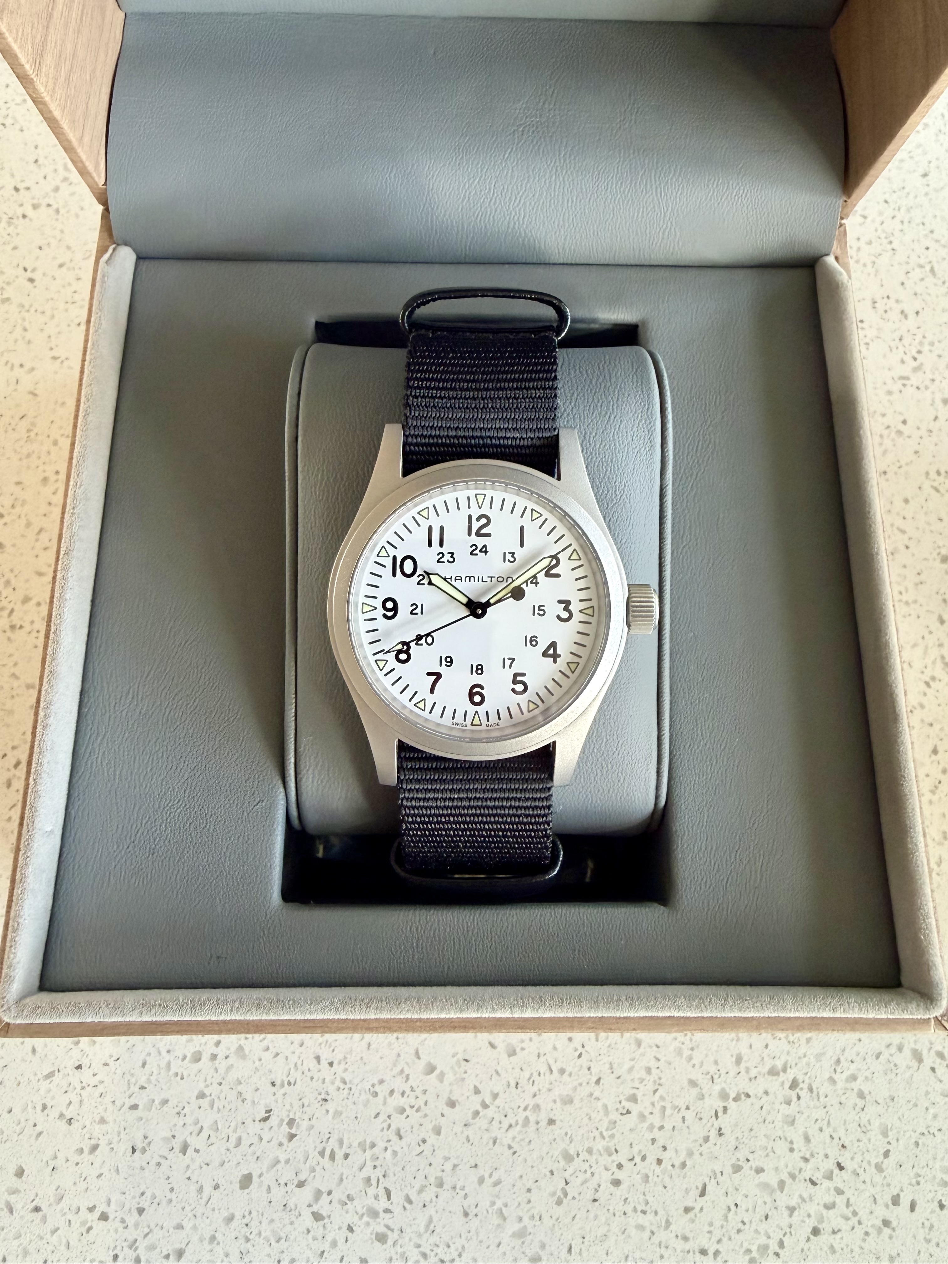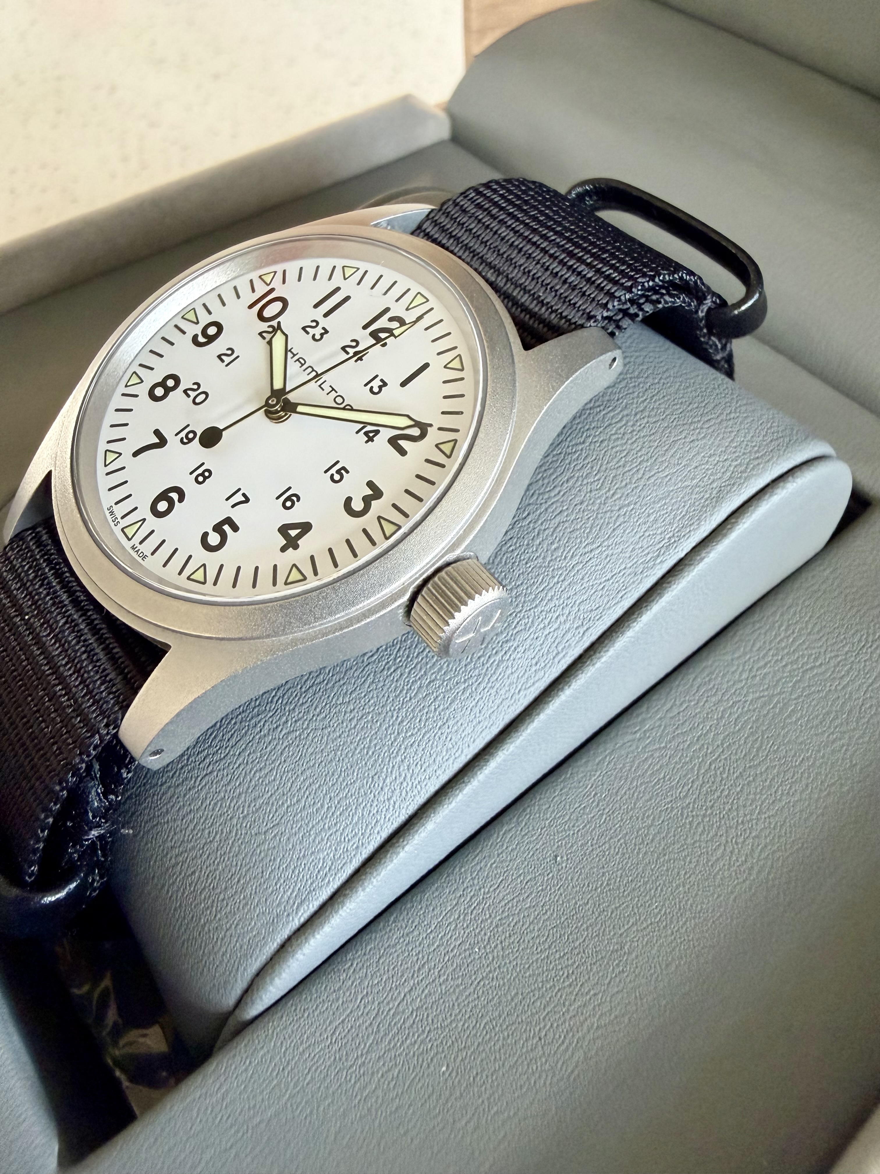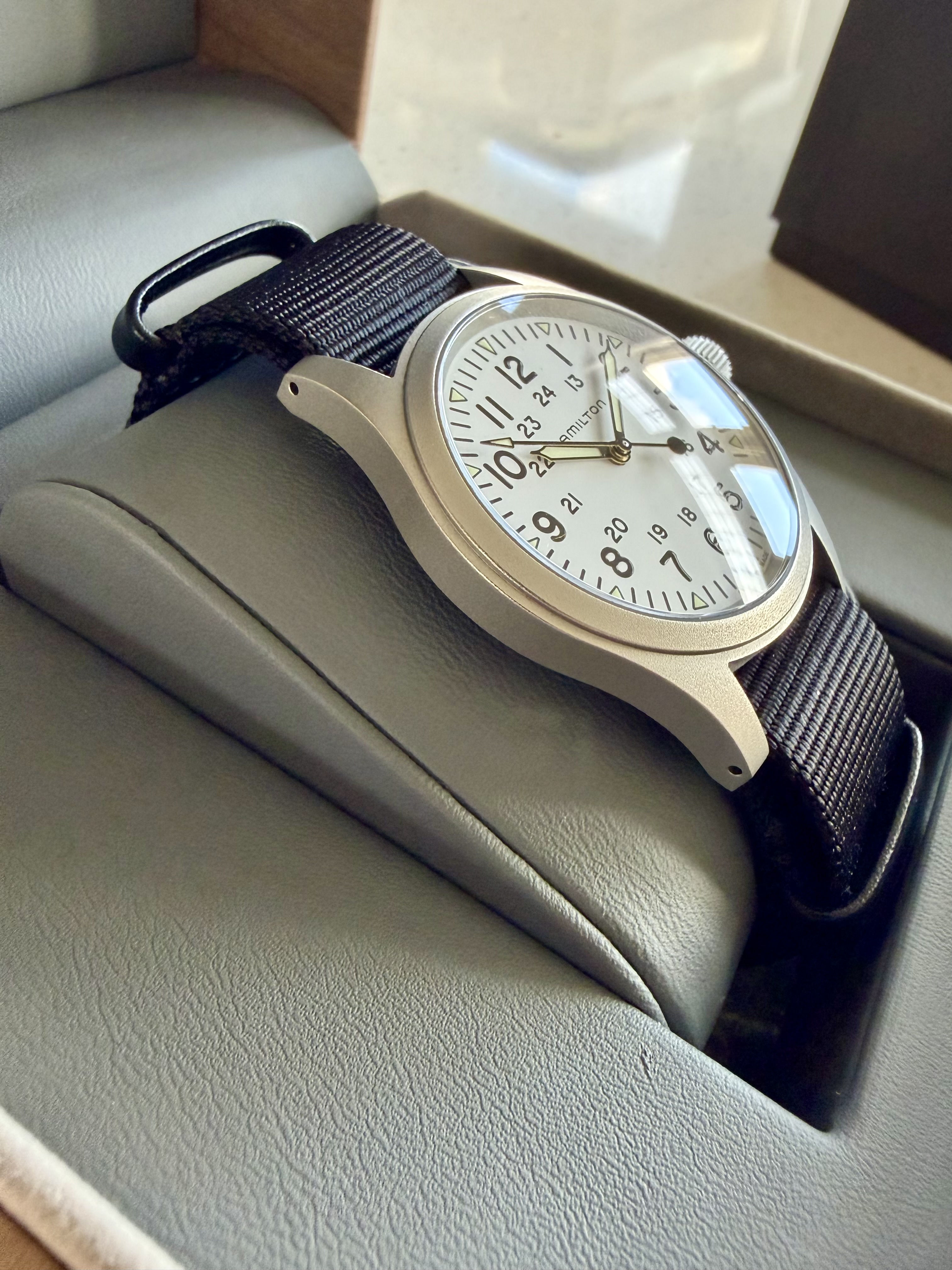 Enfin, hij is beschikbaar voor de liefhebber. Het horloge komt helemaal compleet met alle toebehoren en garantiekaart. Ik heb deze Khaki aandachtig bestudeerd maar ik kan helemaal niks vinden, in absolute nieuwstaat dus. De originele NATO is ongedragen.