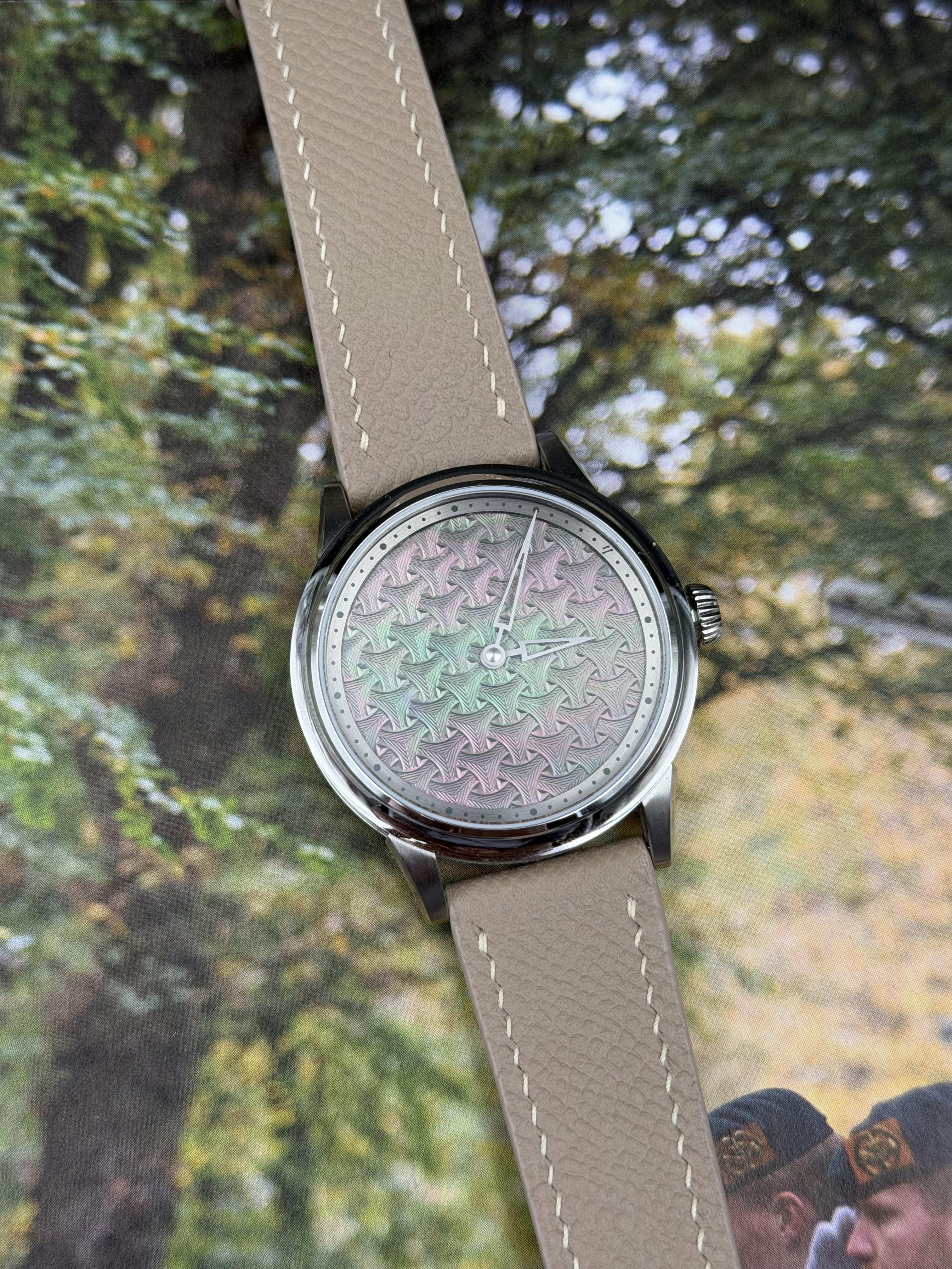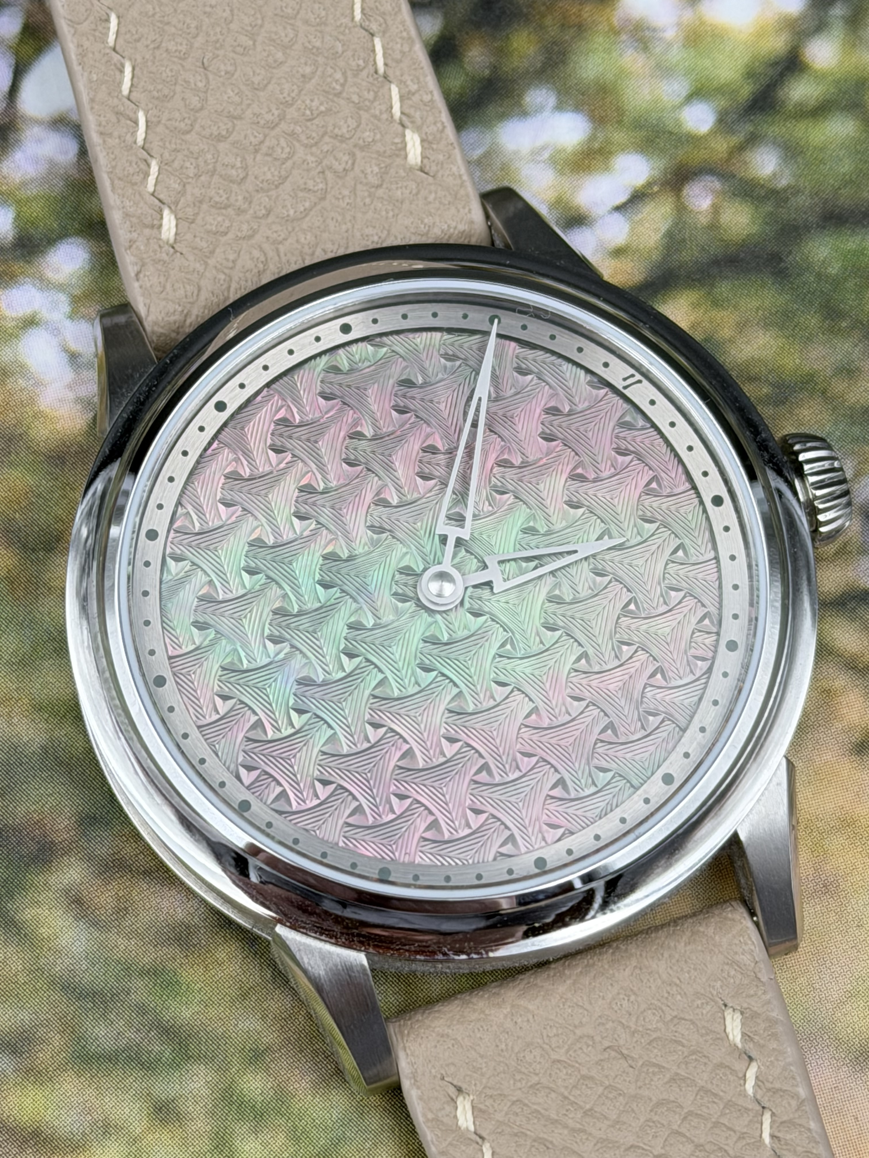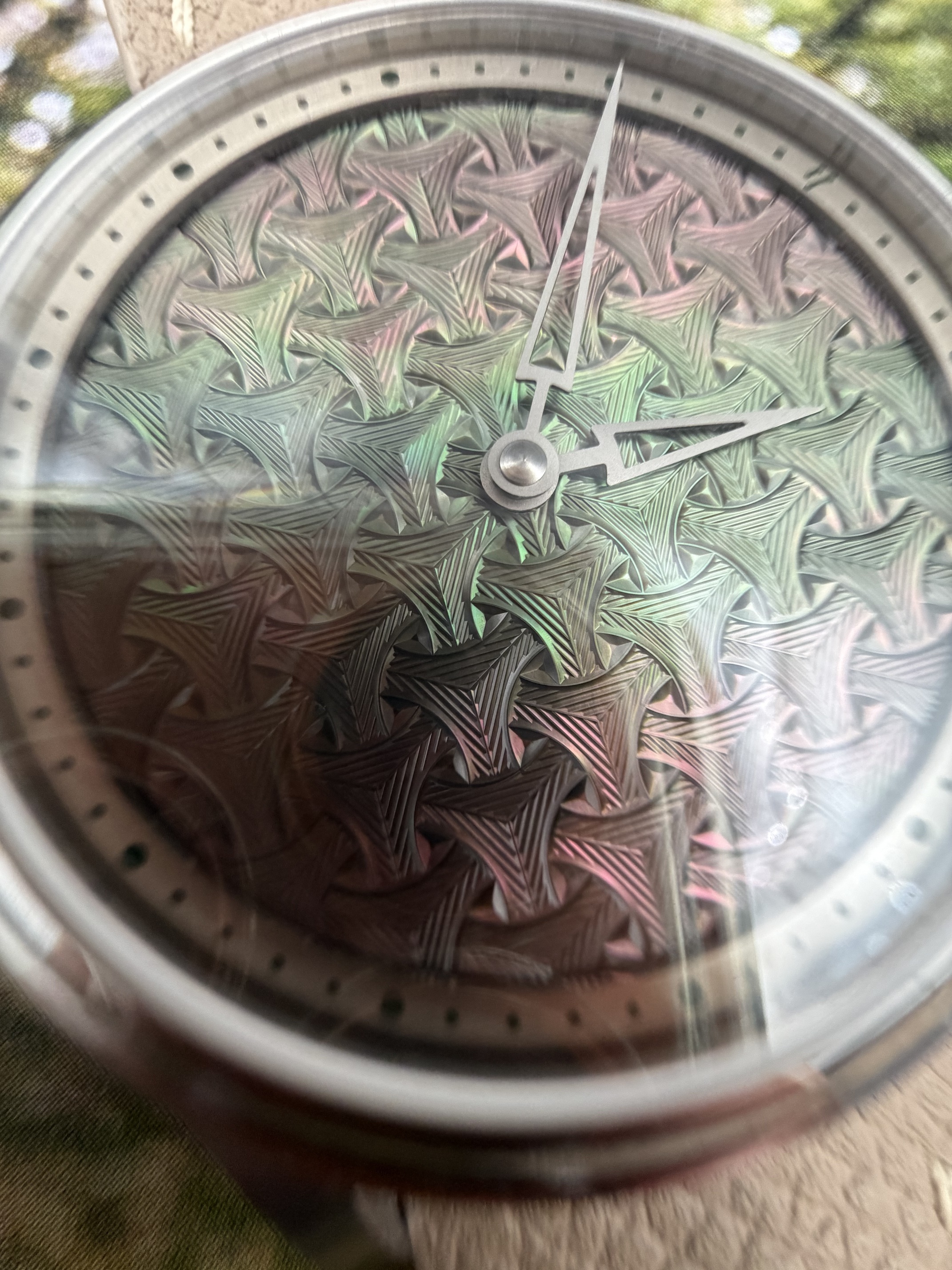 Wijzerplaat: natuurlijke zwarte Tahitiaanse parelmoer basis – CNC-gegraveerd guilloché-achtig “berg”-patroon geïnspireerd op oude Chinese wapenrusting – concentrisch kruisend cirkelmotief – opengewerkte zwaardvormige wijzers