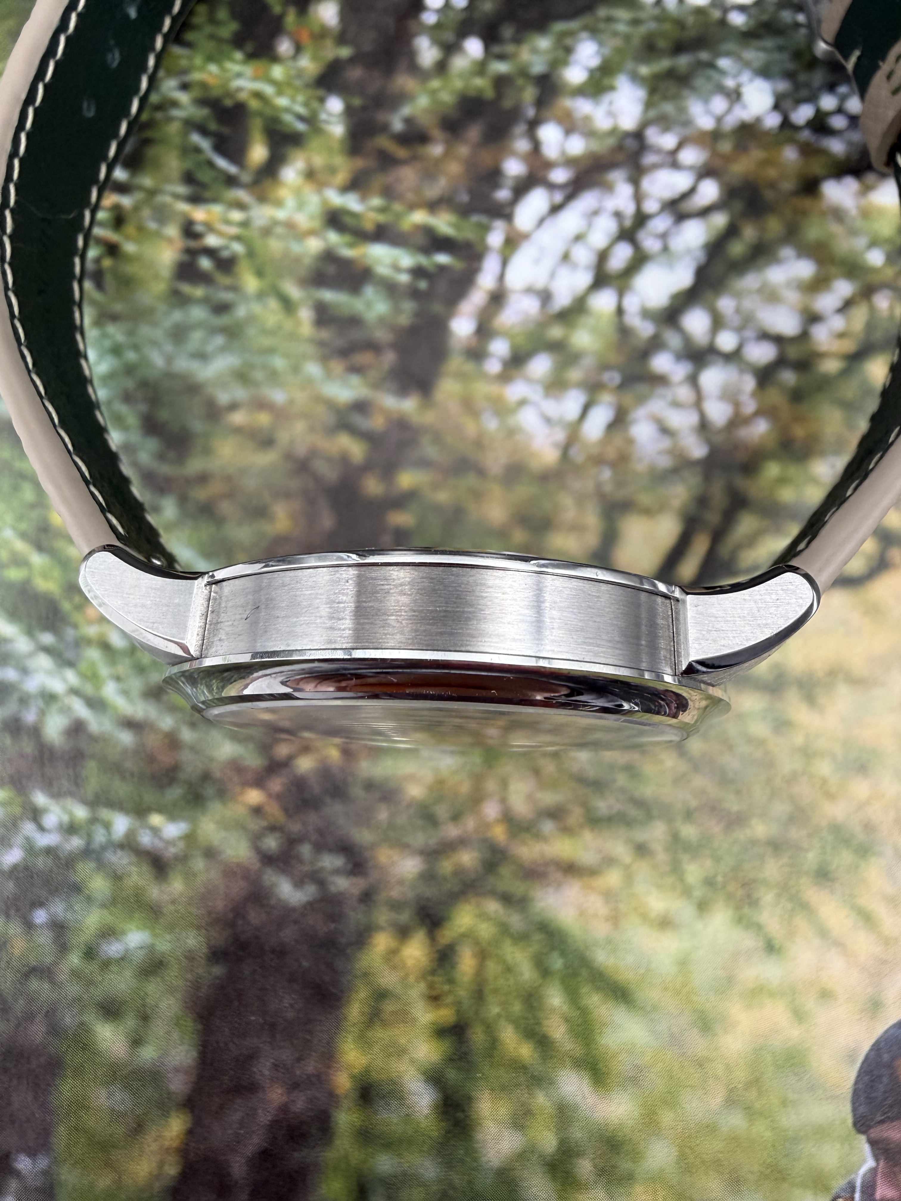 Bandje:HasNoBounds handgestikt Frans Epsom-leren bandje met groene geitenleren voering – geborstelde roestvrijstalen gesp – 20 mm bandaanzetbreedte