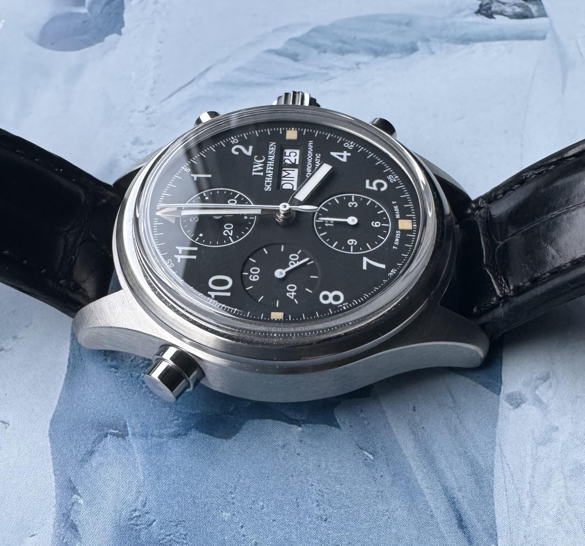 Conditie (krassen, werking etc): uitstekend. Na een full service door IWC zeer spaarzaam gedragen. Schitterende brushing op de kast. Subtiele bevel op de overgang van de lugs. De wijzers zijn door IWC vervangen (geen tritium meer). Het bandje is aan vervanging toe overigens. Zie verder de foto’s.