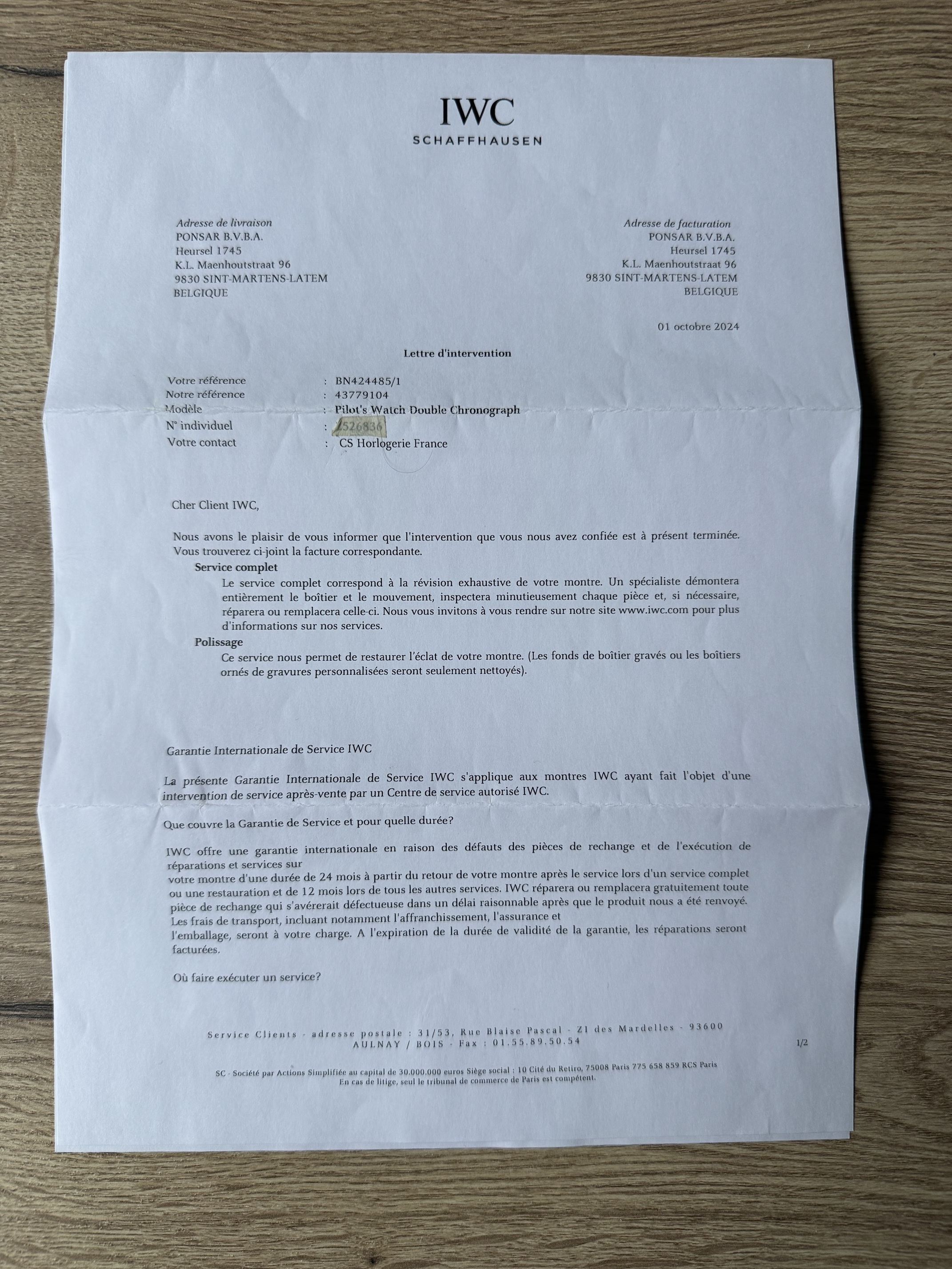 Factuur en/of certificaat: ja, maar niet ingevuld. Hiernaast een servicefactuur van IWC (eind 2024).