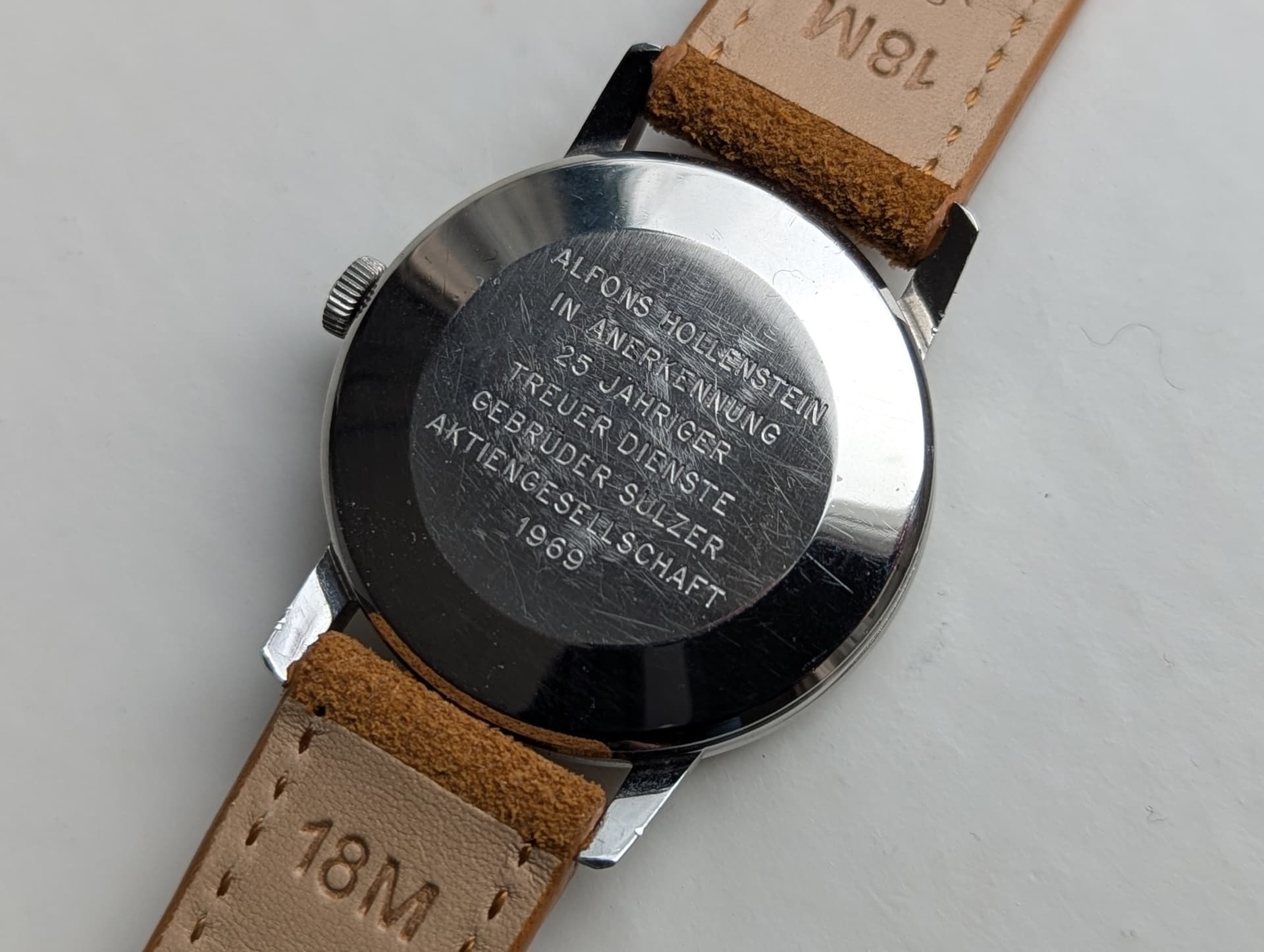 Conditie (krassen, werking etc): Mooie vintage conditie, strakke kast, zeer nette wijzerplaat. Uurwerk heeft in december 2022 onderhoud gekregen bij Ron Sonders. Uurwerk loopt snaarstrak, alles werkt zoals het hoort. De rotor is wat gehorig, dus daar zou je een keer naar kunnen kijken.