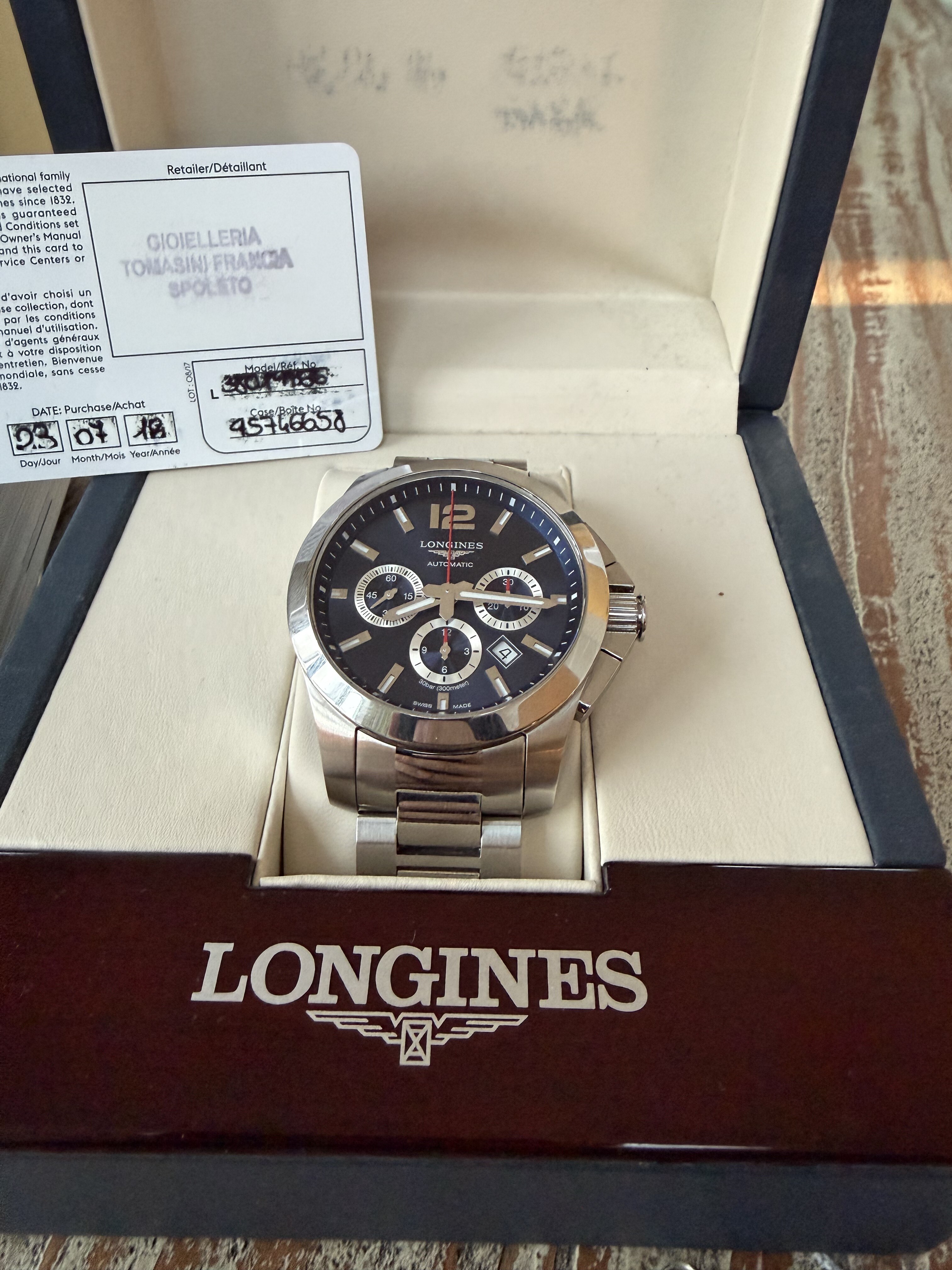 Te koop: Longines Conquest L3.801.4.96.6 automatisch chronograaf horloge. Voorzien van het Longines calibre L688 uurwerk met ca. 54 uur gangreserve, chronograaf en datumfunctie. 44 mm RVS kast, krasbestendig saffierglas, diepblauwe sunburst wijzerplaat en 300 m waterdicht. Geleverd op stalen band met Longines vlindersluiting. Alle schakels van de band zijn aanwezig. Al met al een sportief en chique Zwitsers horloge. Ik blijf hem zelf prachtig vinden maar hij is voor mij helaas toch echt een maatje te groot en blijft daarom altijd liggen.