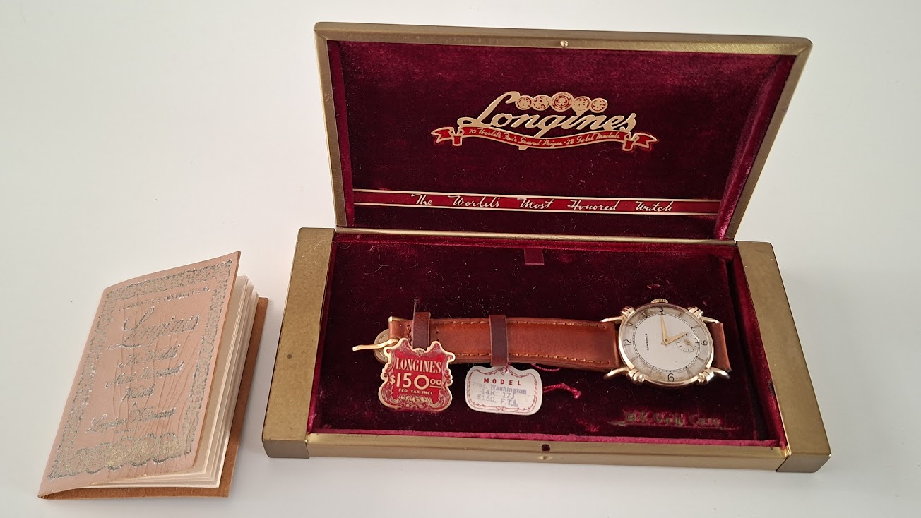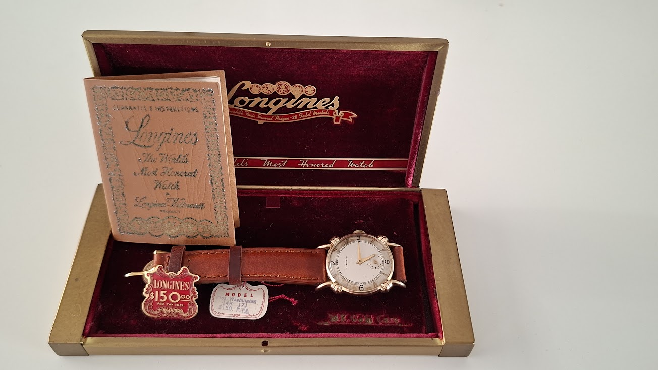 Dit is een zeer scherpe prijs voor een full set 14K Longines President washington uit 1949. Onderbieden wordt niet gewaardeerd, noch biedingen in de trant van de goudwaarde, goudwaarde bedraagt om en bij de 900 euro (ca 10 - 10,5g), slopen kan ik ook zelf.
