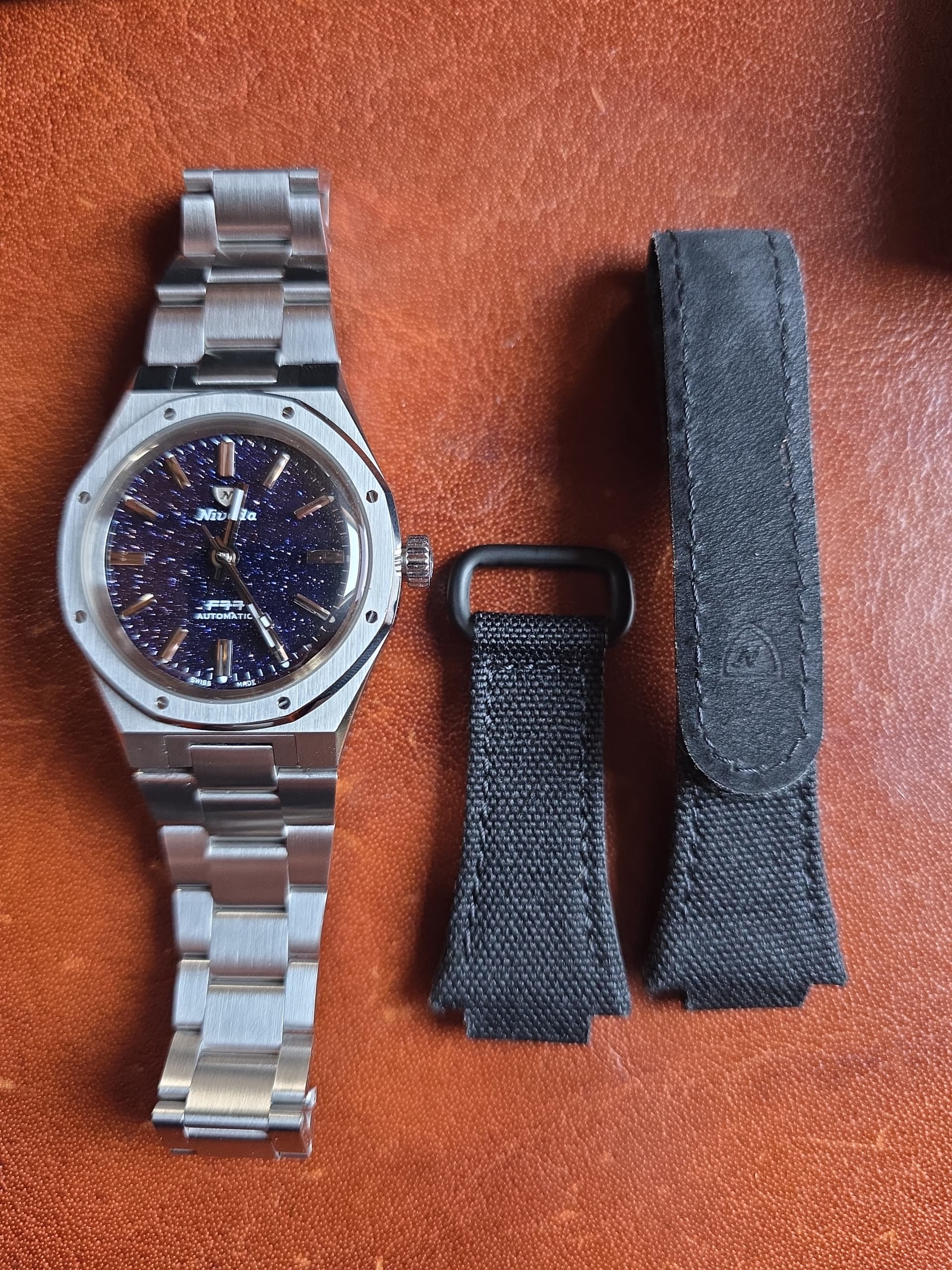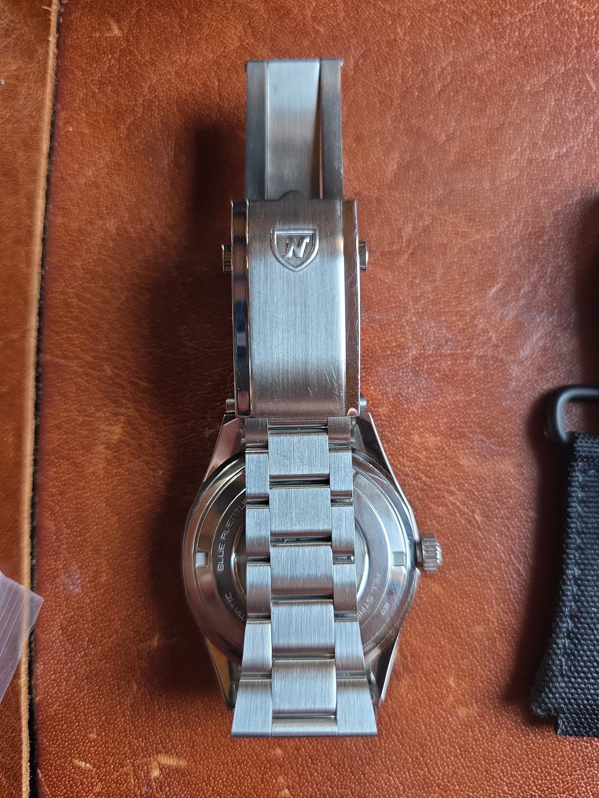 Originele doos en/of eventuele accessoires: full set (doos, omdoos, tag, badge) band is op maat van 17.5cm pols met extra schakel en extra Nivada canvas strap