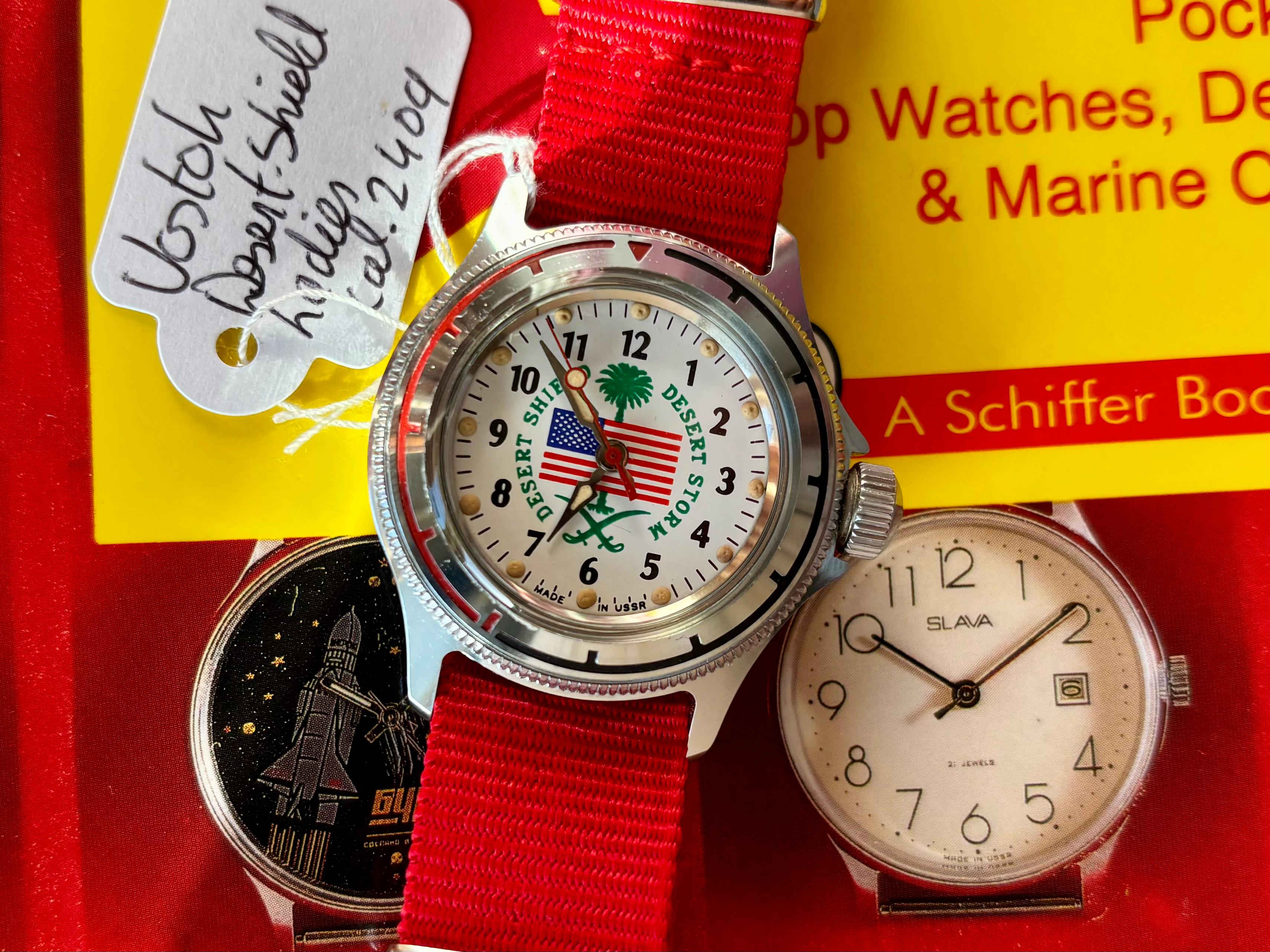 De bekende Desert Shield-Desert Storm Wijzerplaat , perfect verkleurde tritium lume dots en lume in de zilveren Dagger wijzers, kek rood secondewijzertje met lollipop, made in USSR onderaan de plaat Unidirectionele bezel.
