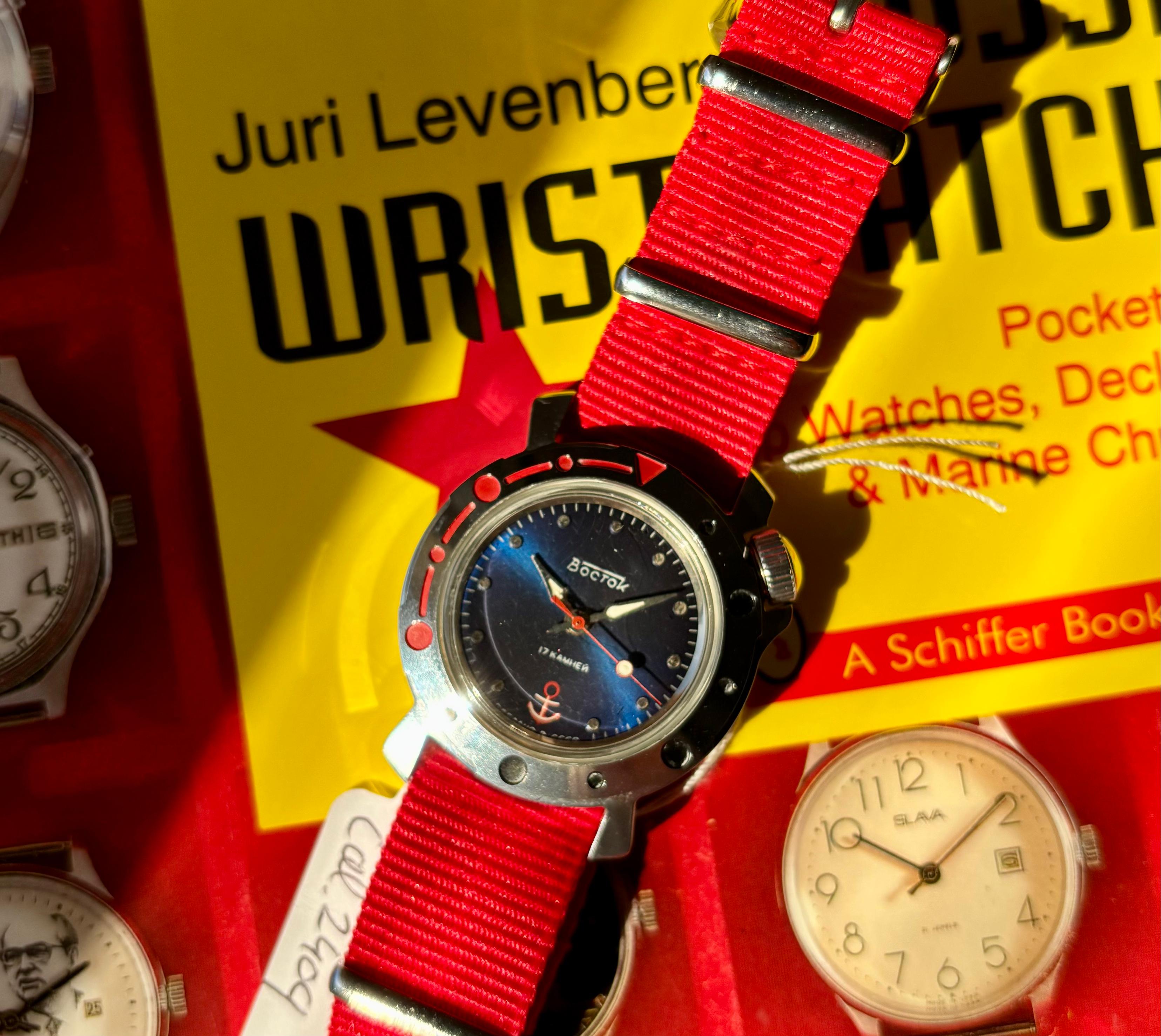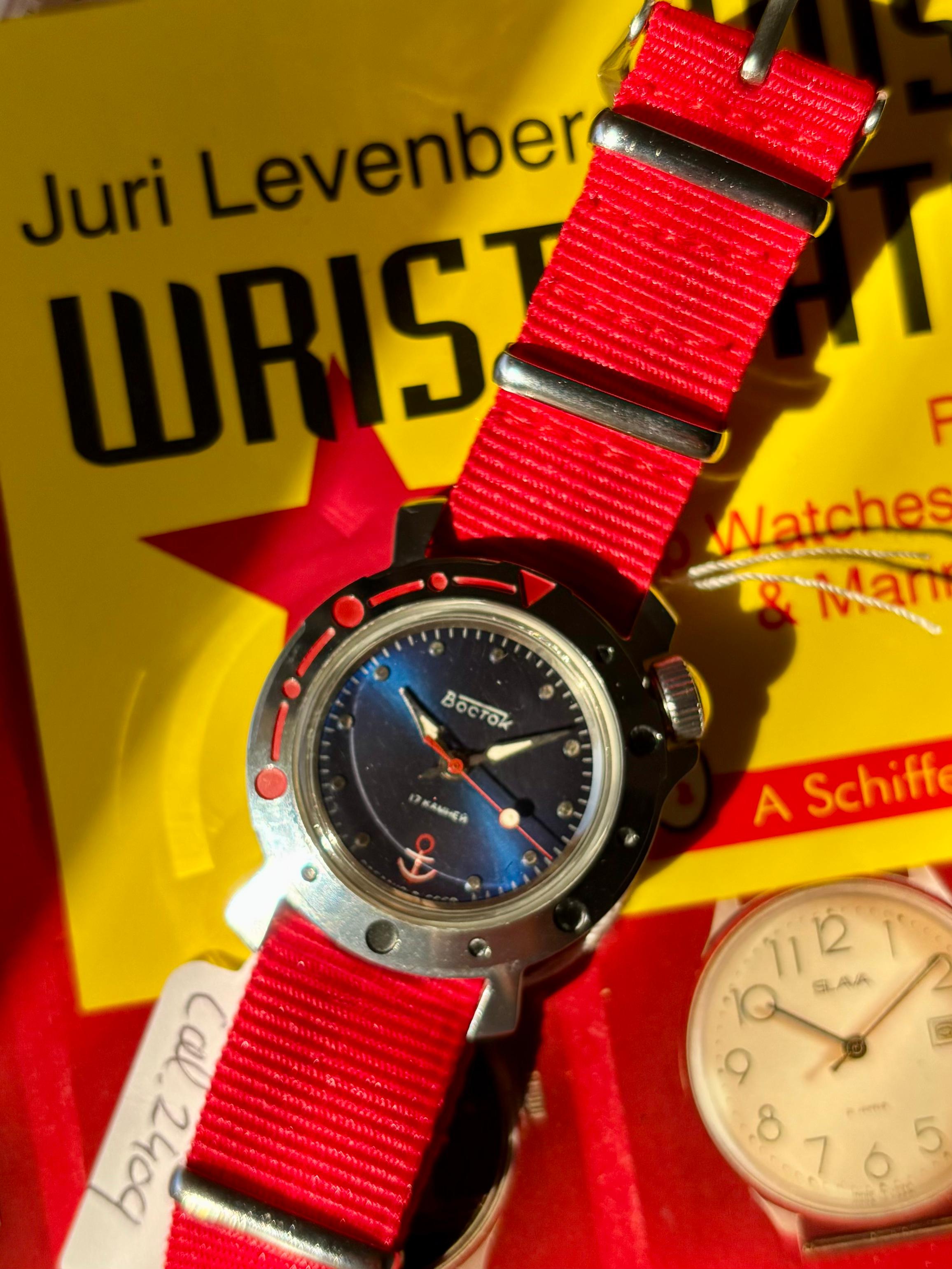 Sunburst blauwe wijzerplaat met een roodanker, zilveren Dagger wijzers met lume en een kek rood secondewijzertje met lollipop, wijzerplaat is “Сделано в СССР”signed (made in USSR