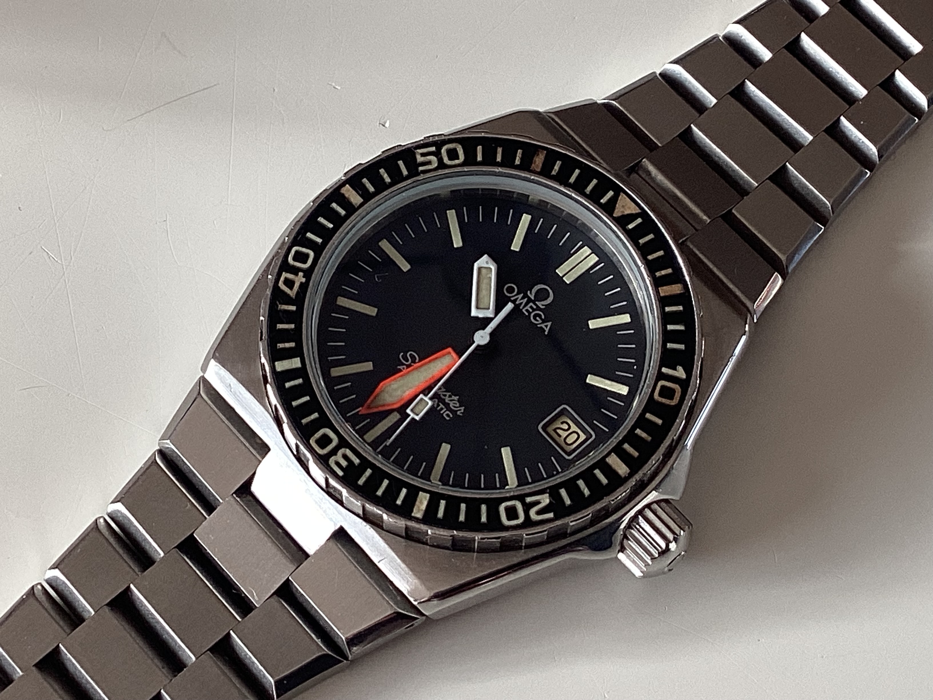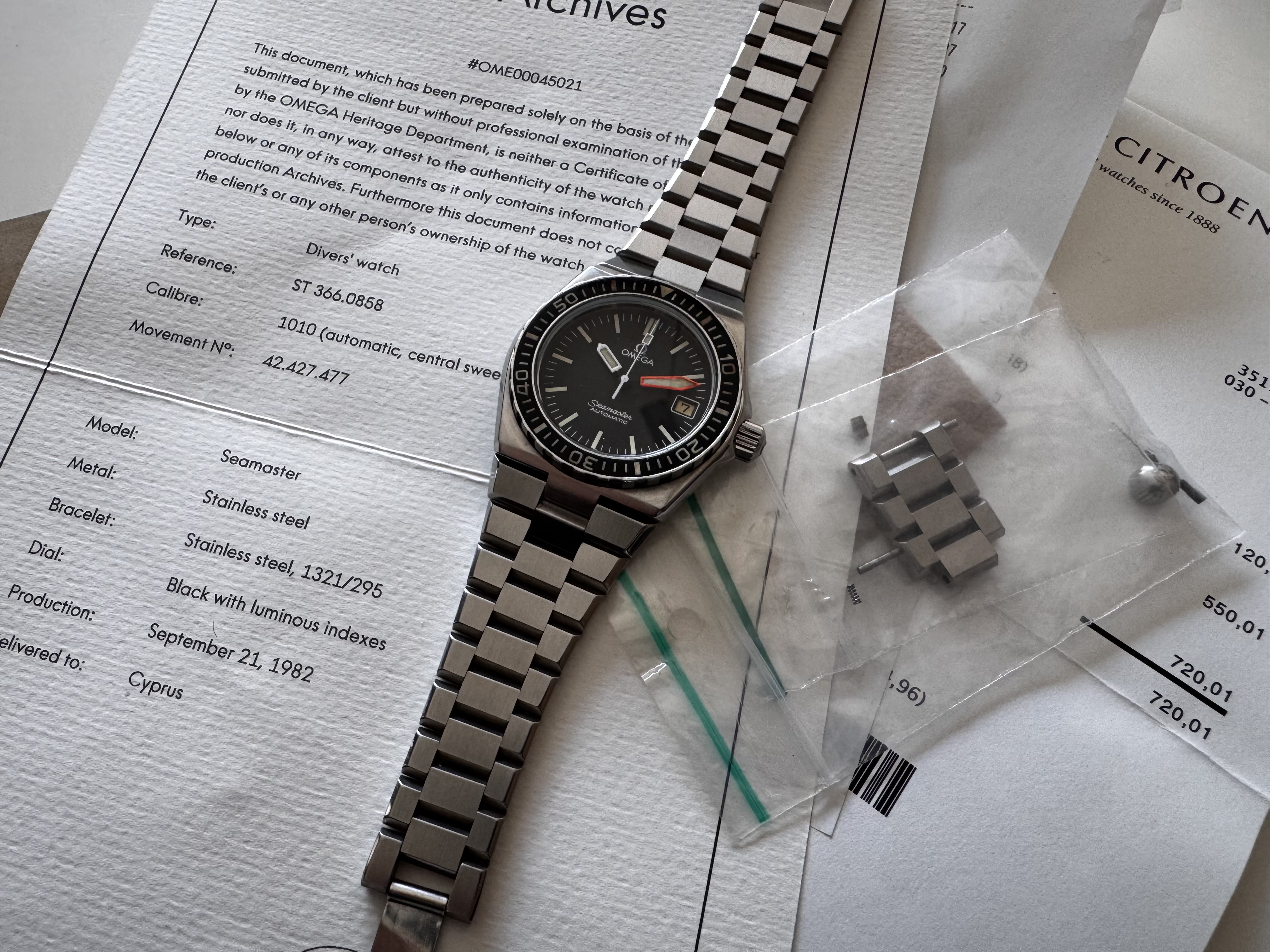 Deze Seamaster heeft een service gehad bij Omega Zwitserland in September en komt tevens met een extract uit het Omega archief, waaruit blijkt dat deze voor het eerst is afgeleverd in Cyprus (1982).