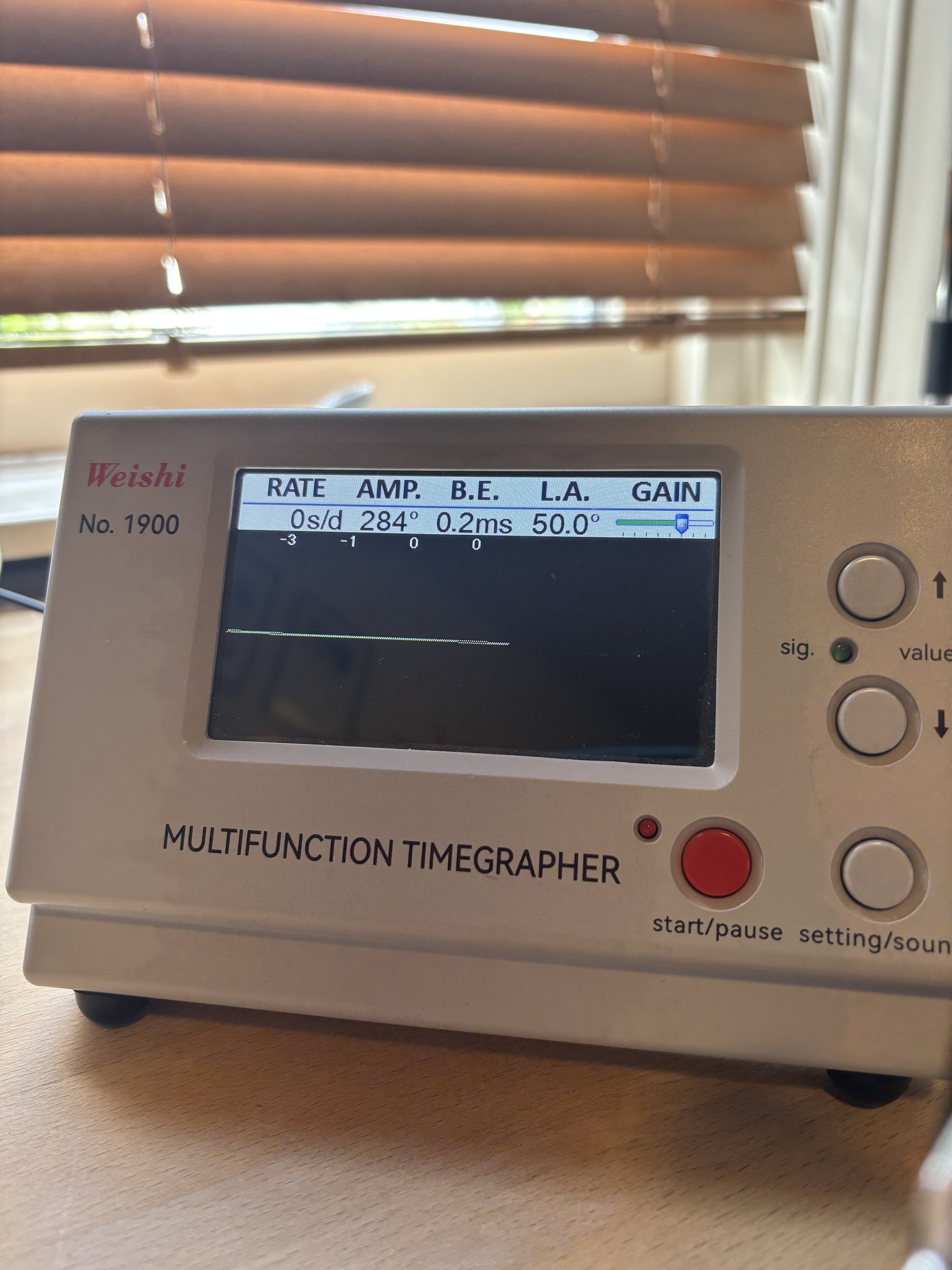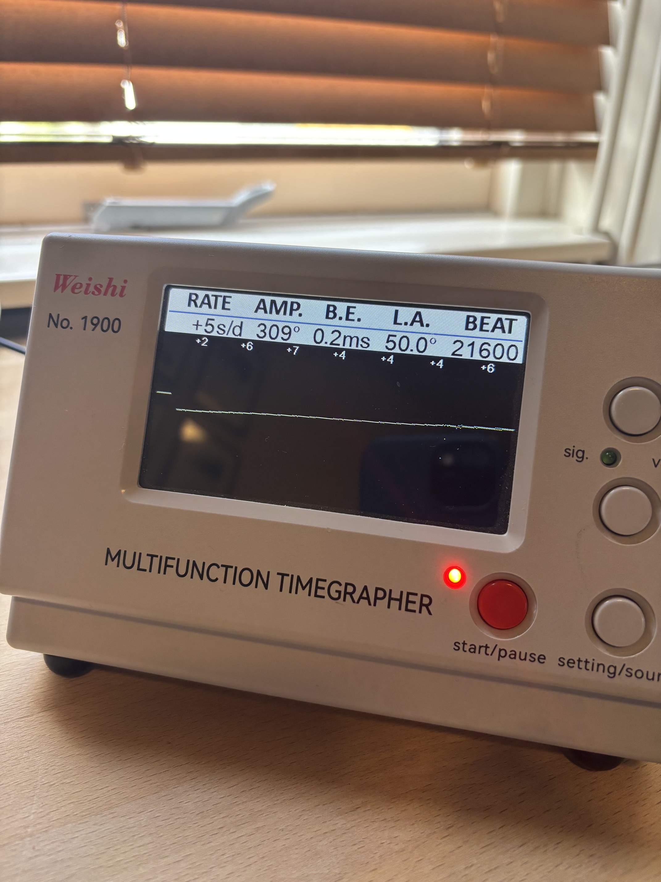 De servicehistorie is niet bekend maar hij loopt mooi, amplitude is goed ook wanneer de chronograaffunctie actief is. Ik leg hem morgen nog even op de timegrapher voor foto’s.