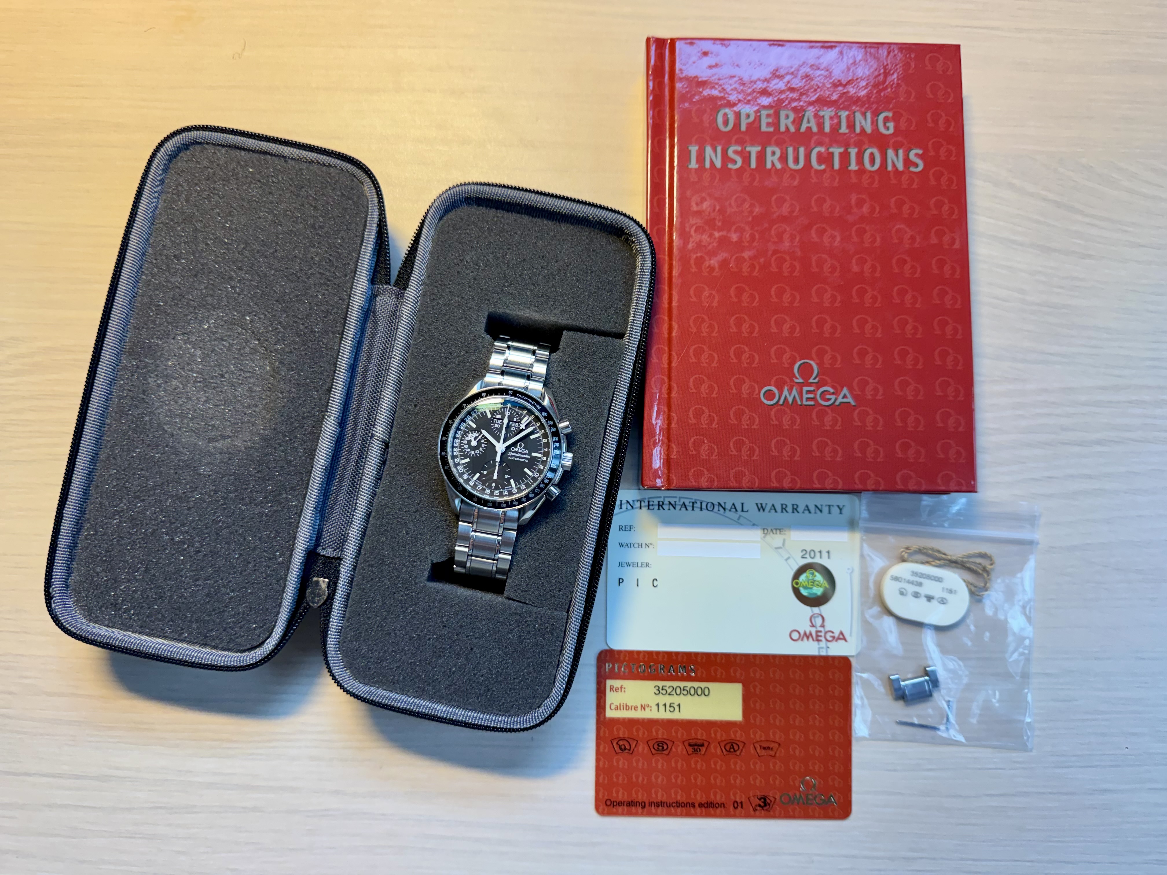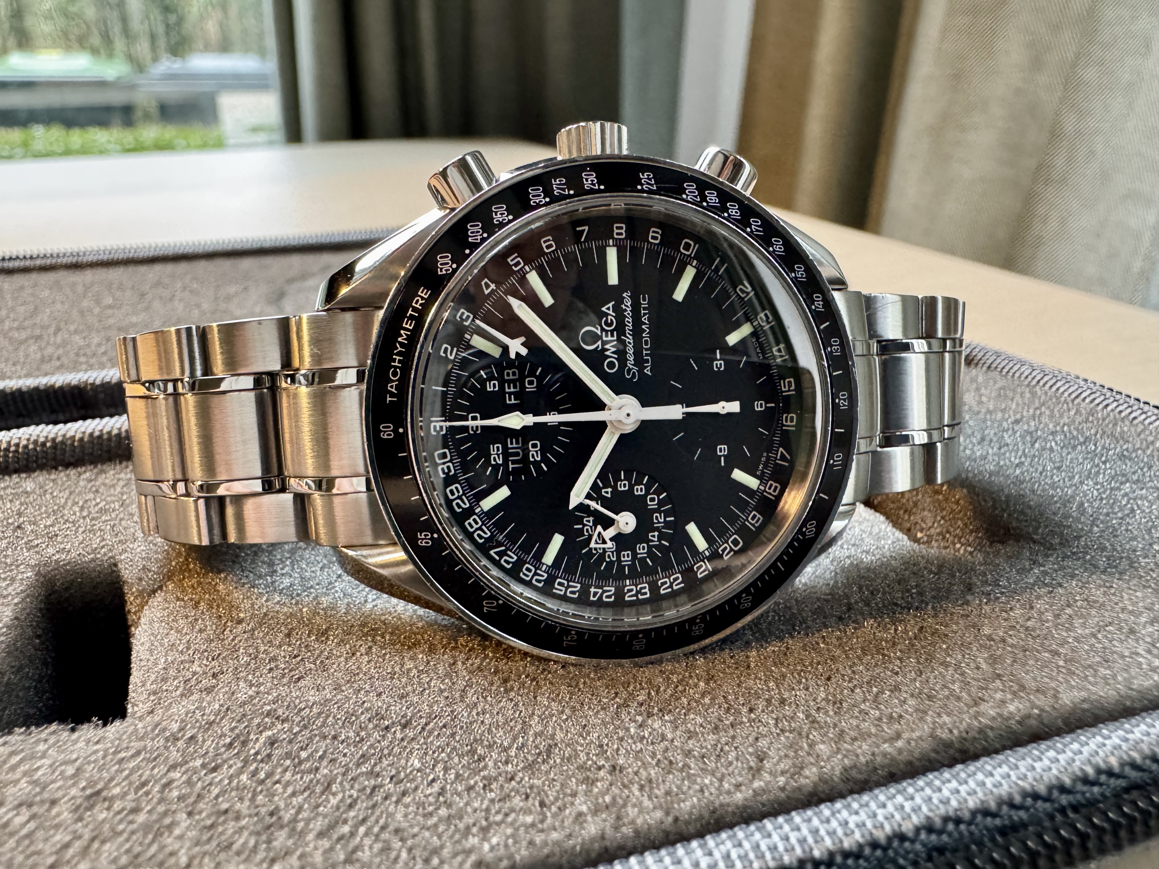 Hele mooie, recent volledig geserviced, Omega Speedmaster triple date, ref. 3250.50.00, met kalender dag/datum/maand aanduiding en chronograaf. Dit exemplaar is maar zeer weinig gedragen, de band is strak zonder enige rek en het loopt perfect.