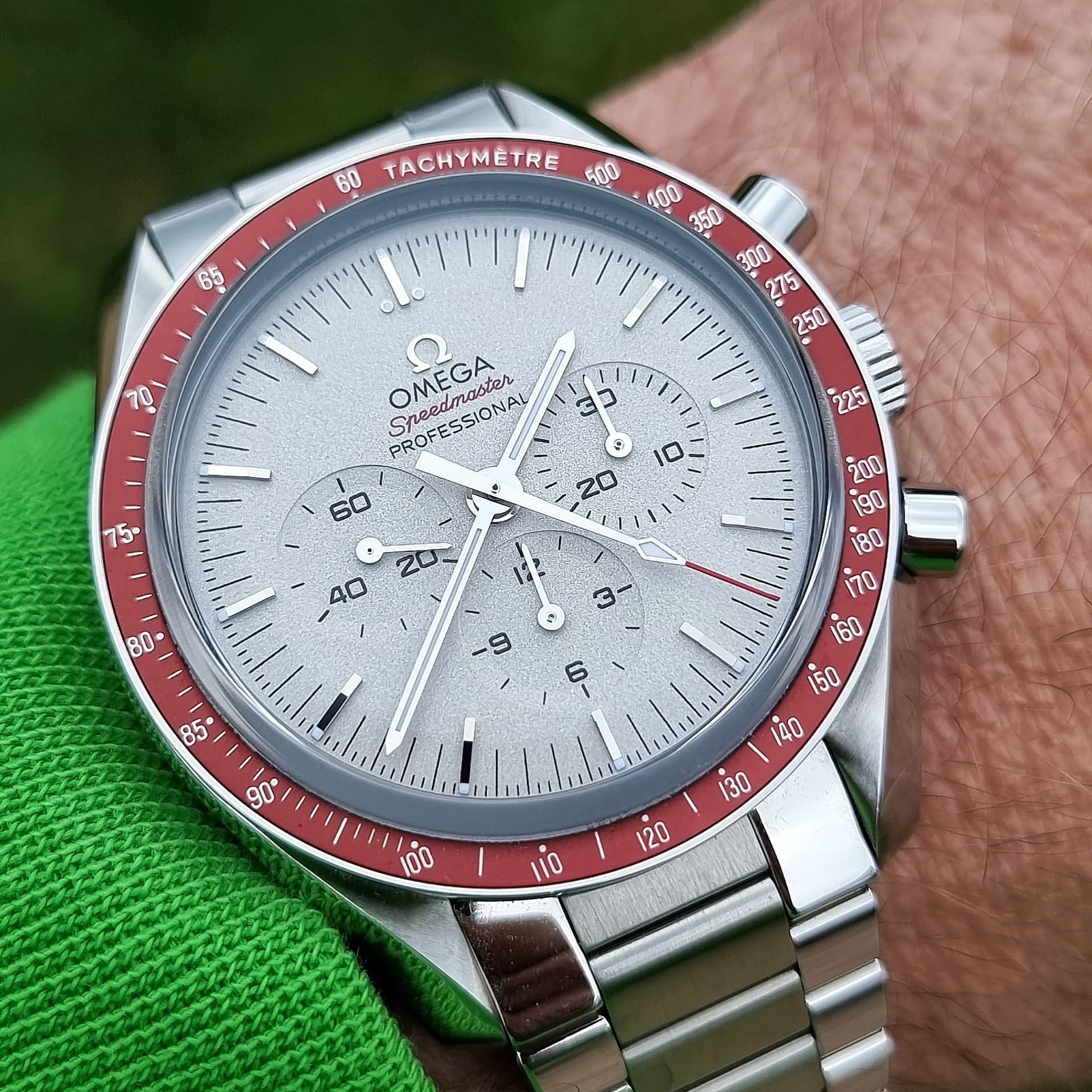 De grijs zilveren wijzerplaat en rode bezel geven het horloge een frisse, elegante look die perfect contrasteert met de klassieke Speedmaster-details. Zoals bij elke Speedmaster is ook dit model uitgerust met het betrouwbare handopwindbare chronograaf-uurwerk, rechtstreeks afgeleid van het legendarische “Moonwatch”-kaliber.
