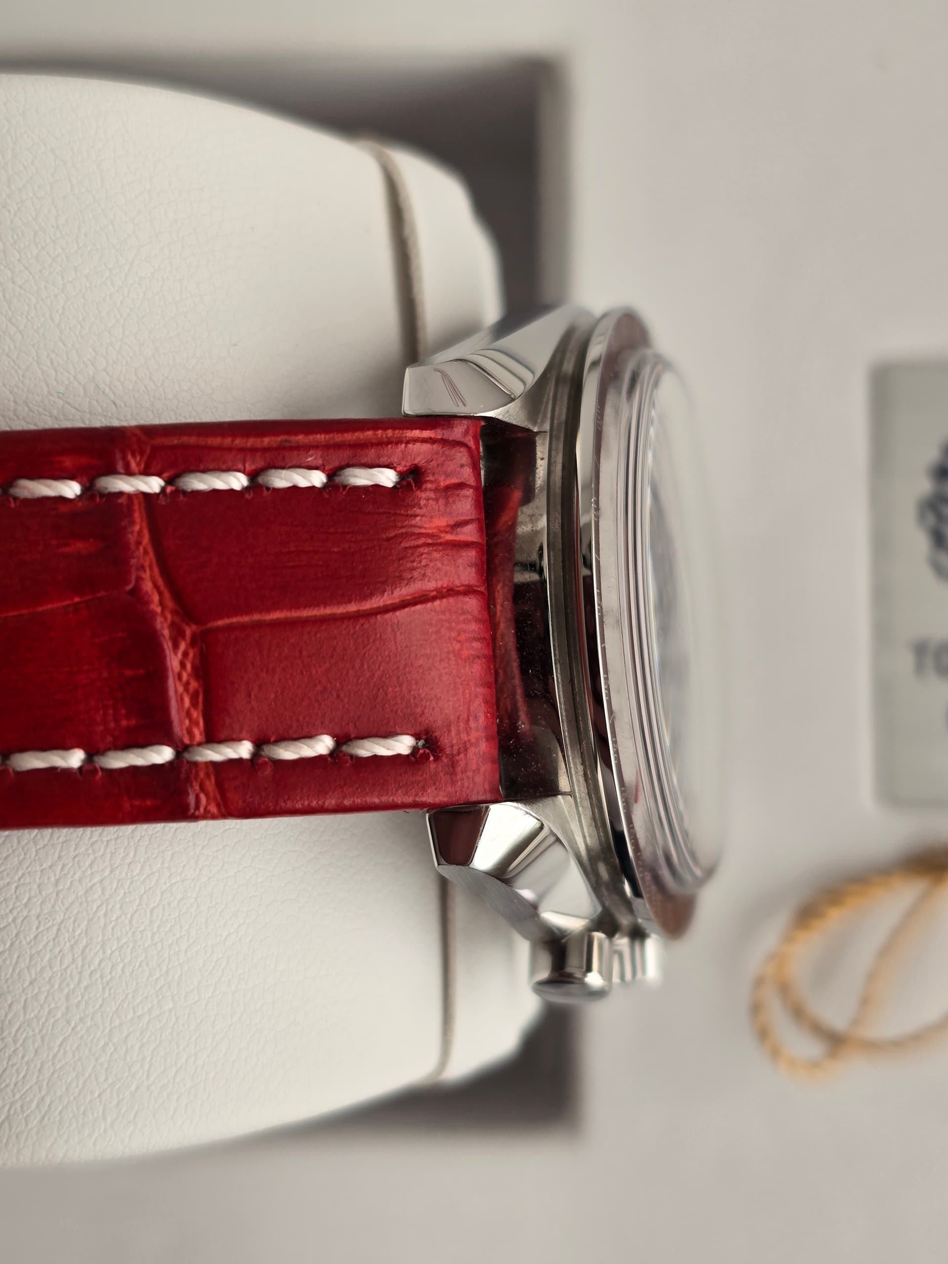De rode lederen band krijg je er ook bij.