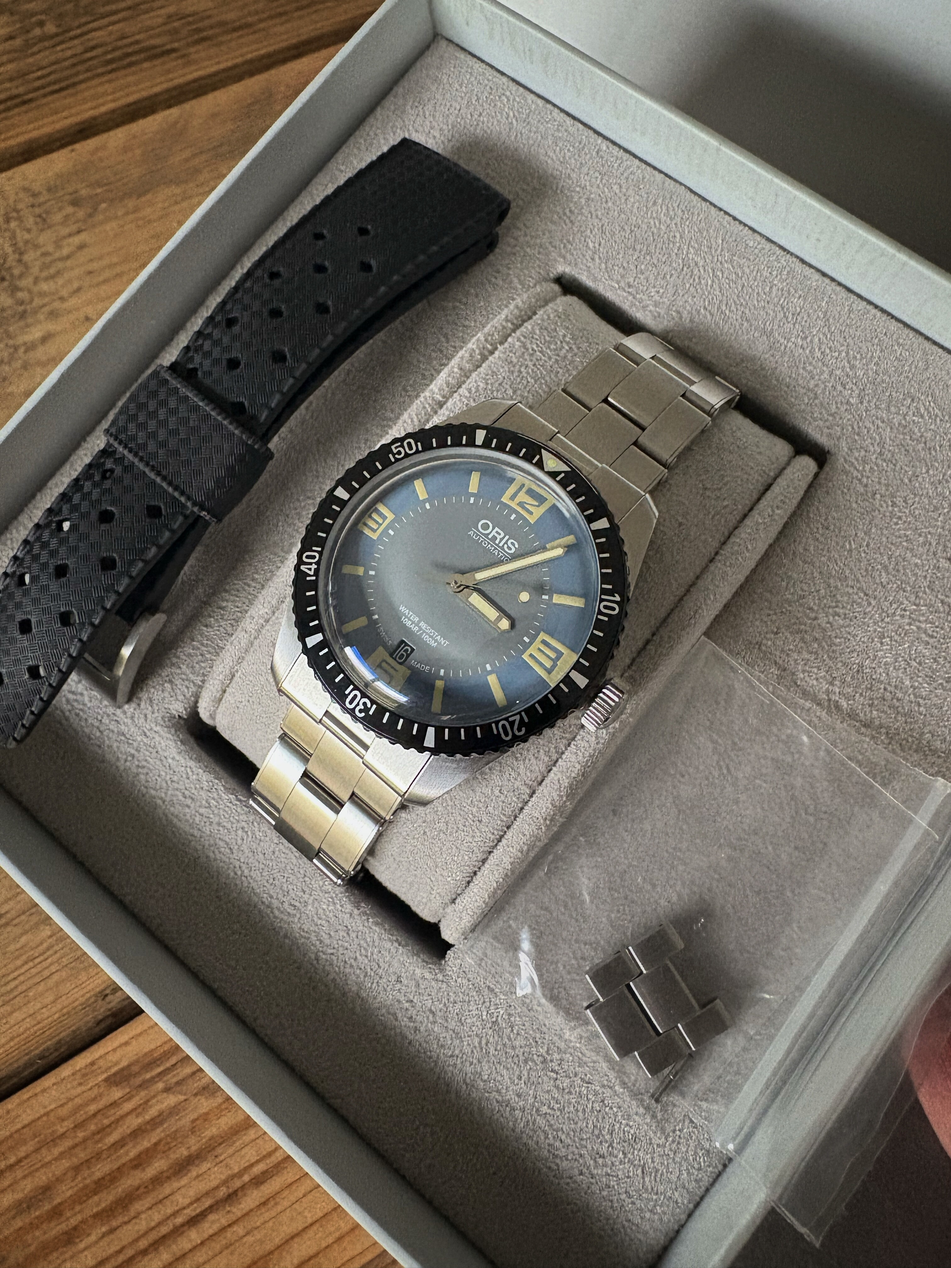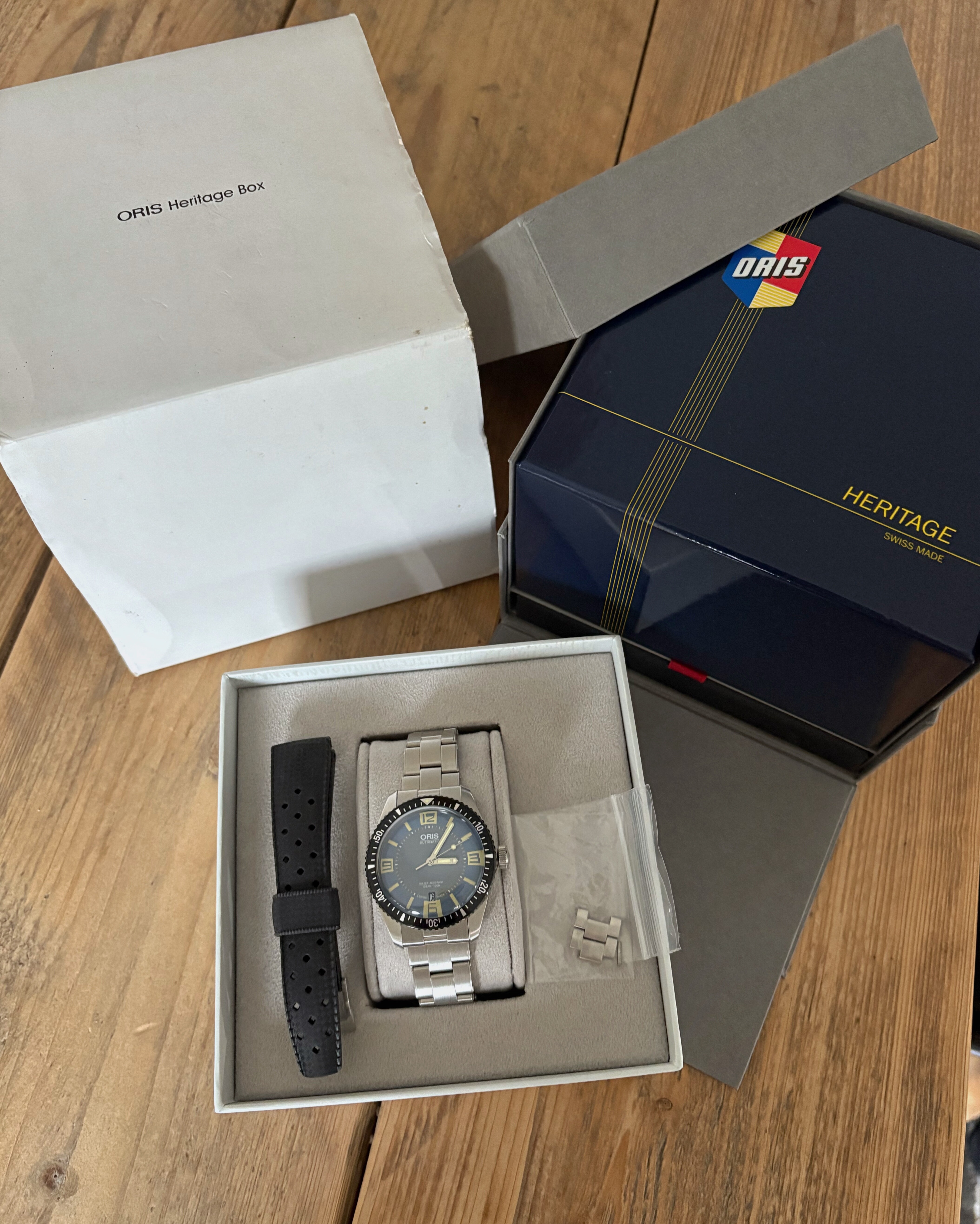 Hierbij bied ik mijn Oris Diver 65 Deauville te koop aan. Prachtig horloge maar deze blijft enkel in de kist zitten omdat andere horloges de voorkeur hebben, en dat is zonde. Daarom mag deze hoor naar iemand anders.
