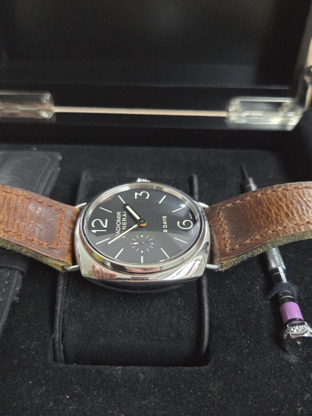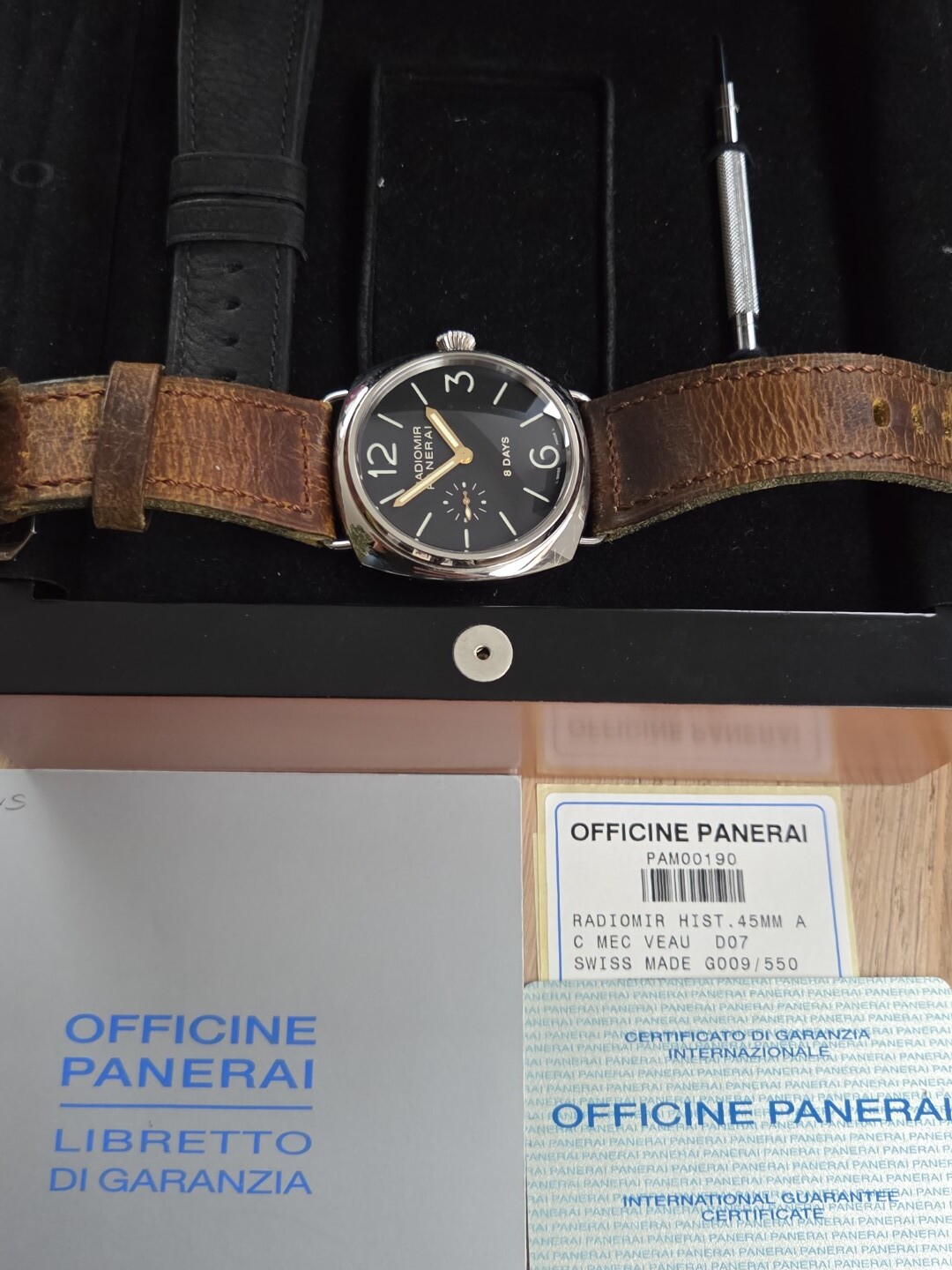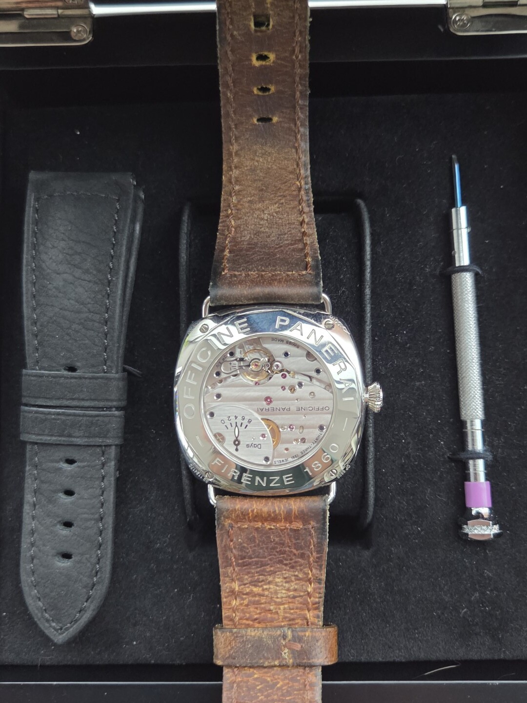 aangeboden op een zeer stoere (ammo pouch) lederen band, en een originele zwart lederen panerai band.