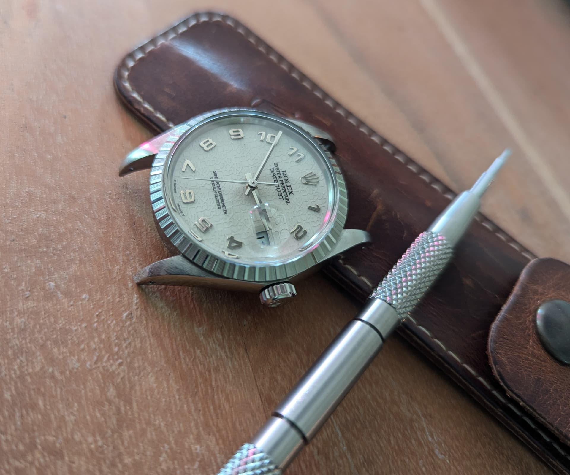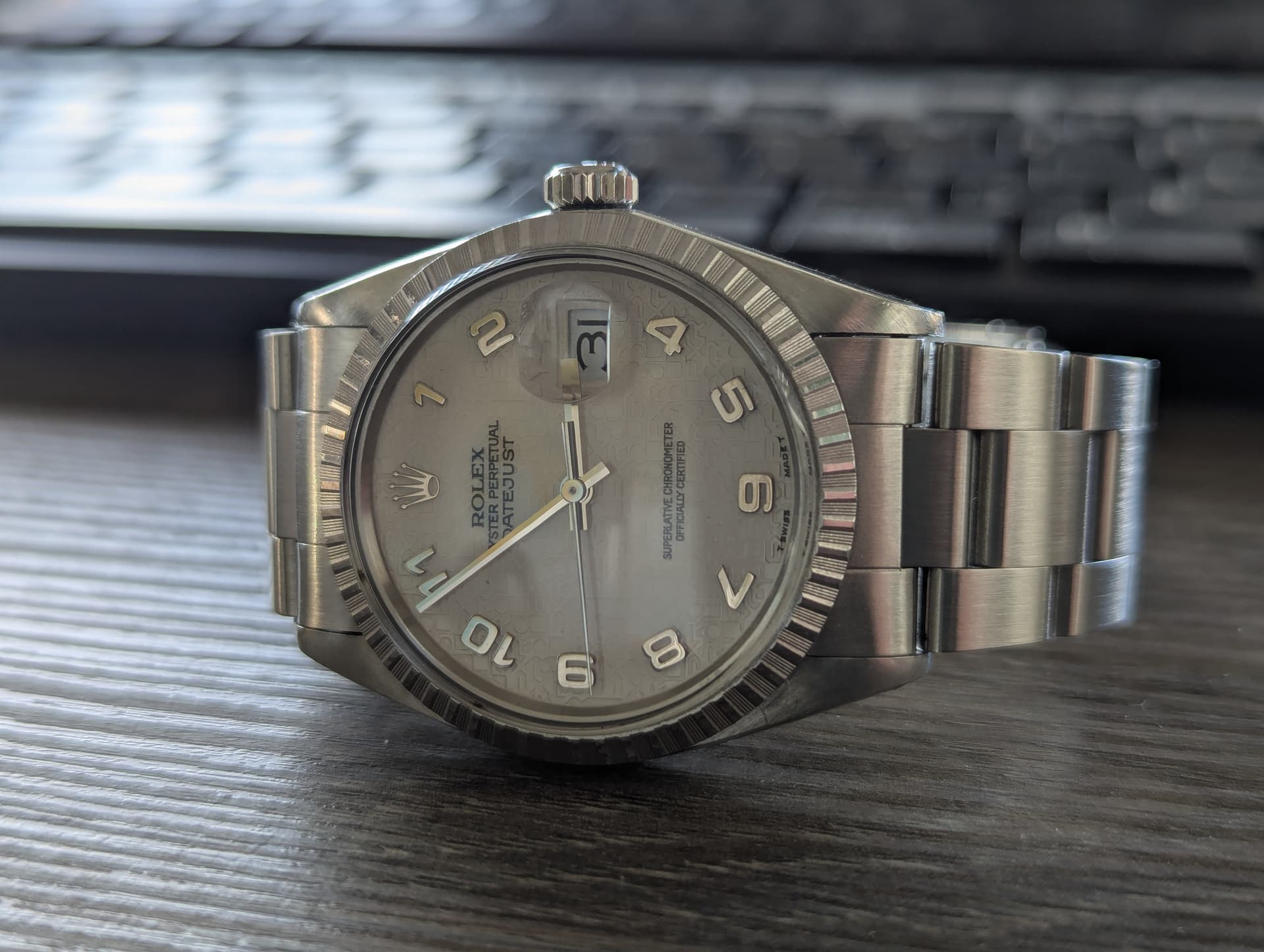 Wat deze Datejust onderscheidt, is de bijzondere combinatie van een zeldzame Jubilee wijzerplaat en strakke non-lume wijzers, wat zorgt voor een verfijnde en rustige vintage uitstraling. De kenmerkende engine turned bezel geeft het horloge daarnaast een subtiele, sportieve touch die perfect in balans is met het klassieke ontwerp.