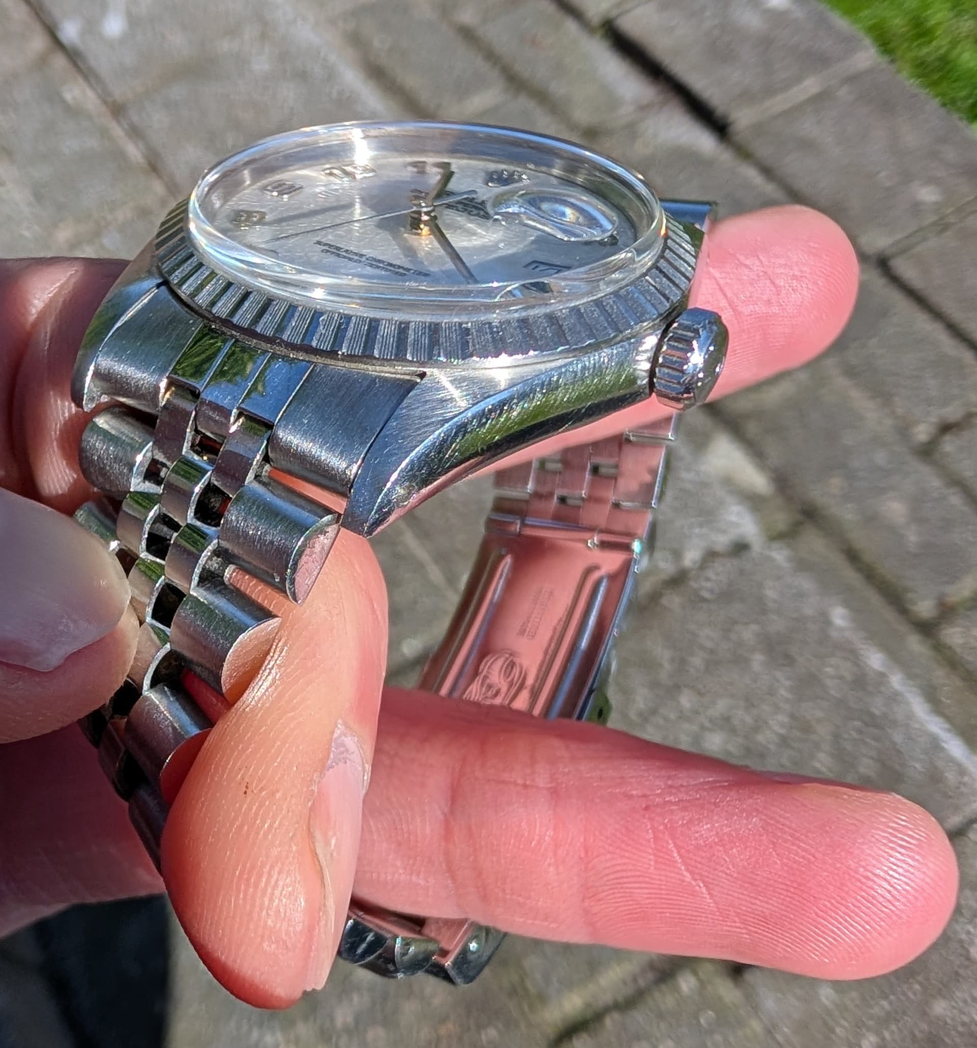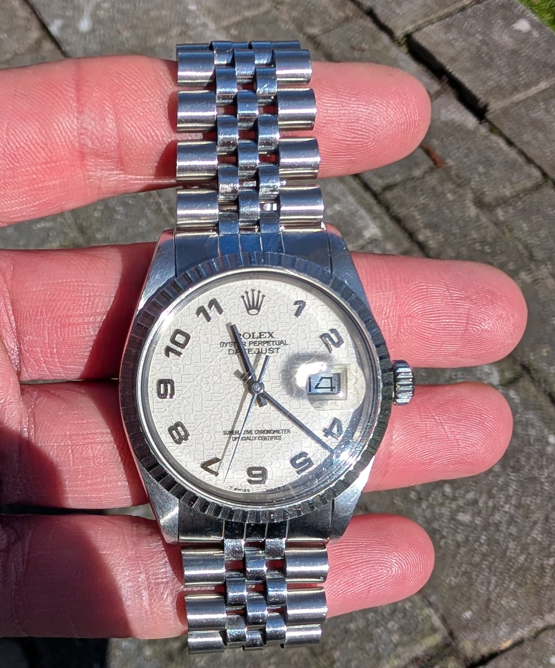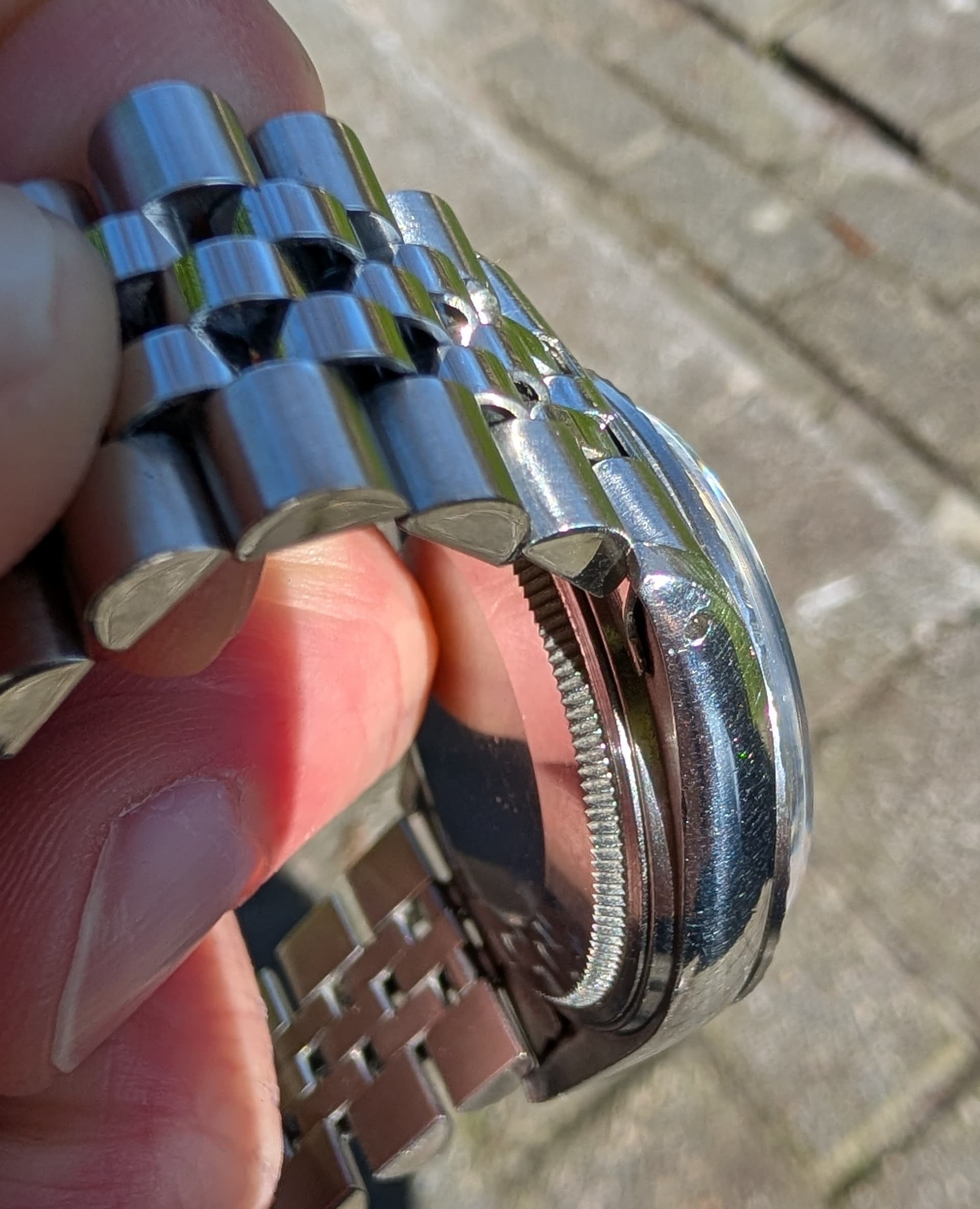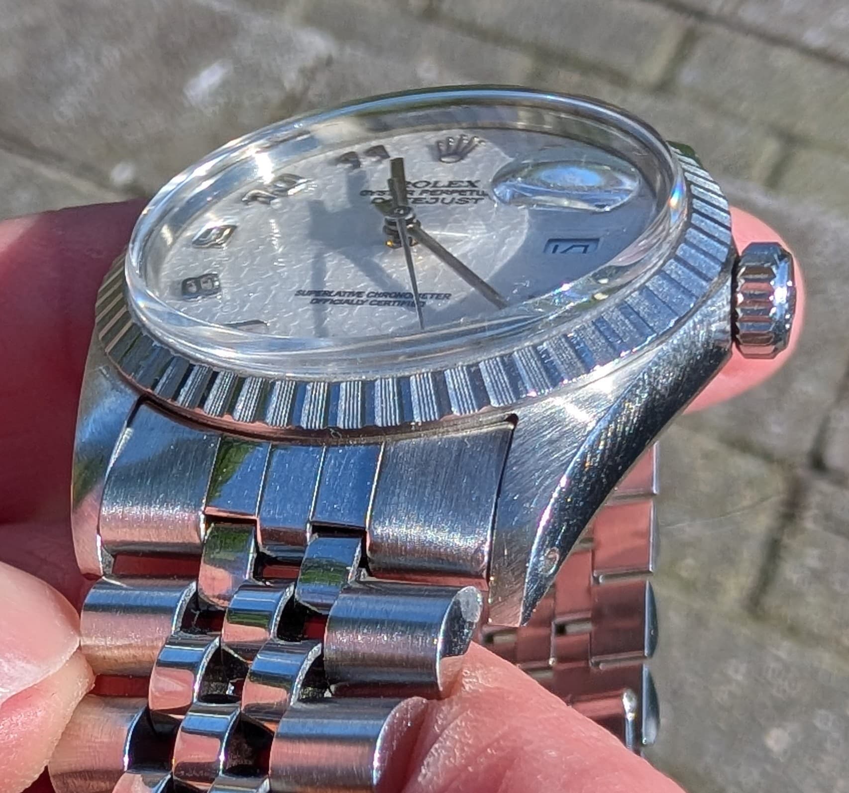 Een iconische Rolex met een eigen identiteit — ideaal voor de liefhebber die op zoek is naar een authentiek stuk met nét dat beetje extra. De foto’s zijn gemaakt op 18 maart 2026, in het onverbiddelijke zonlicht. Elk lijntje is dus zichtbaar om zo een goed mogelijk beeld te creëren. Gelukkig zijn er ook nog sfeerplaatjes.
