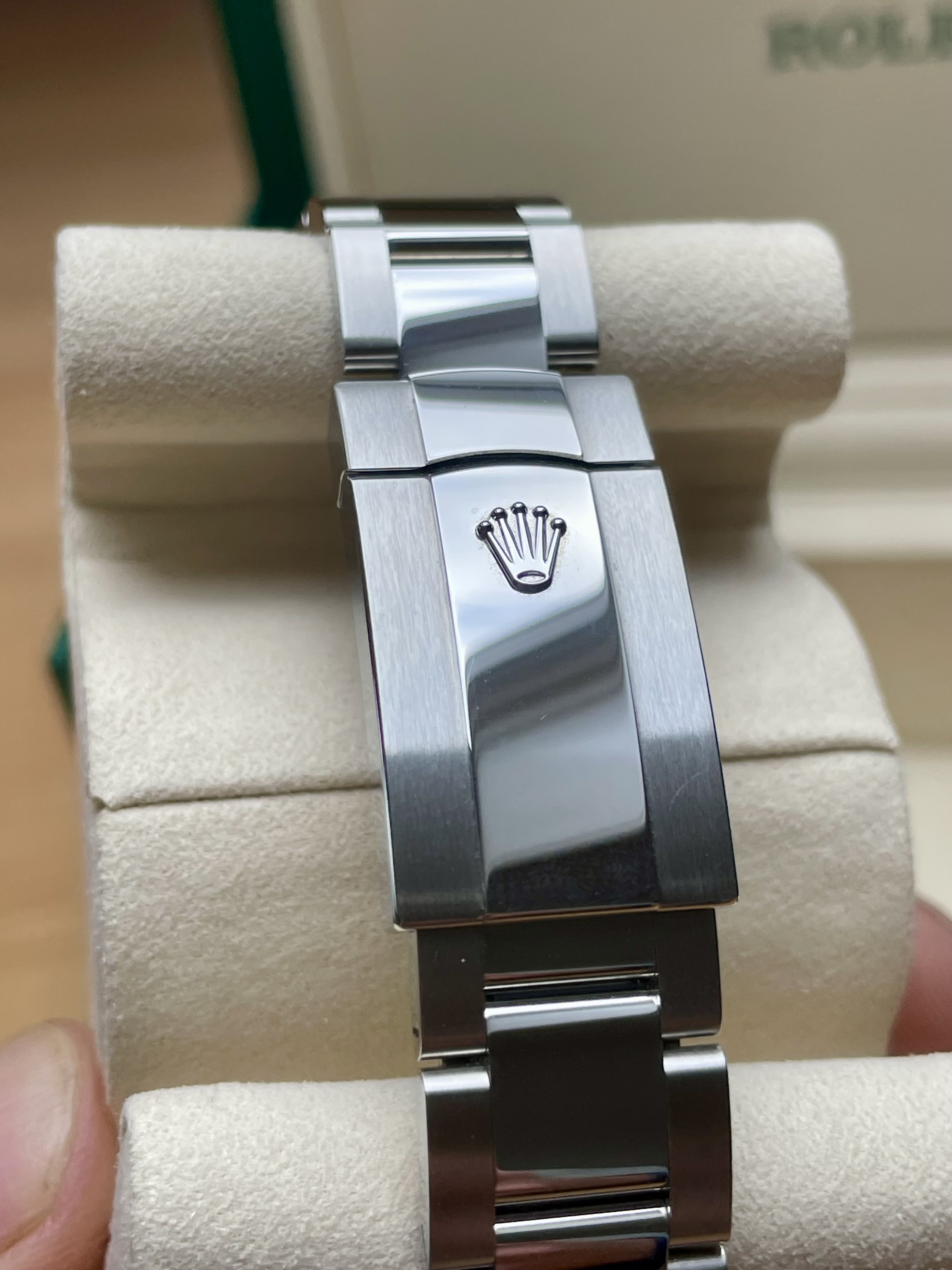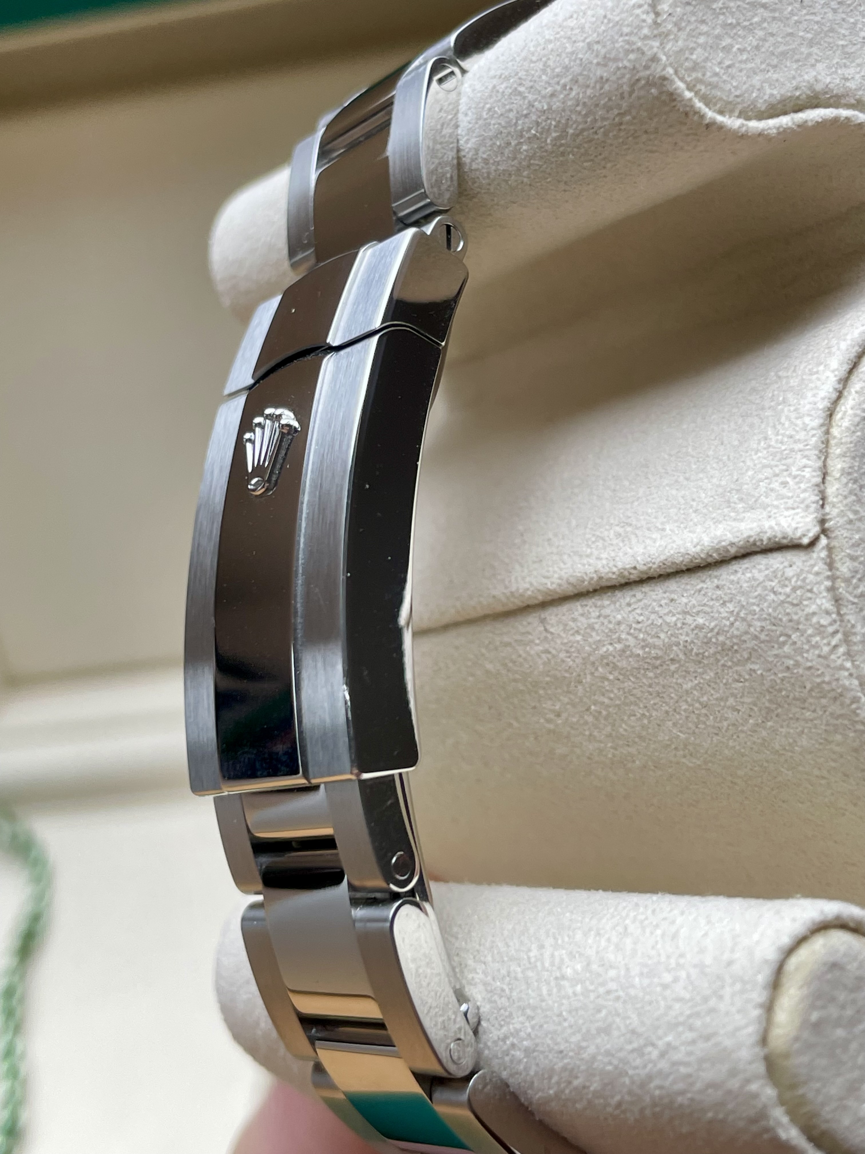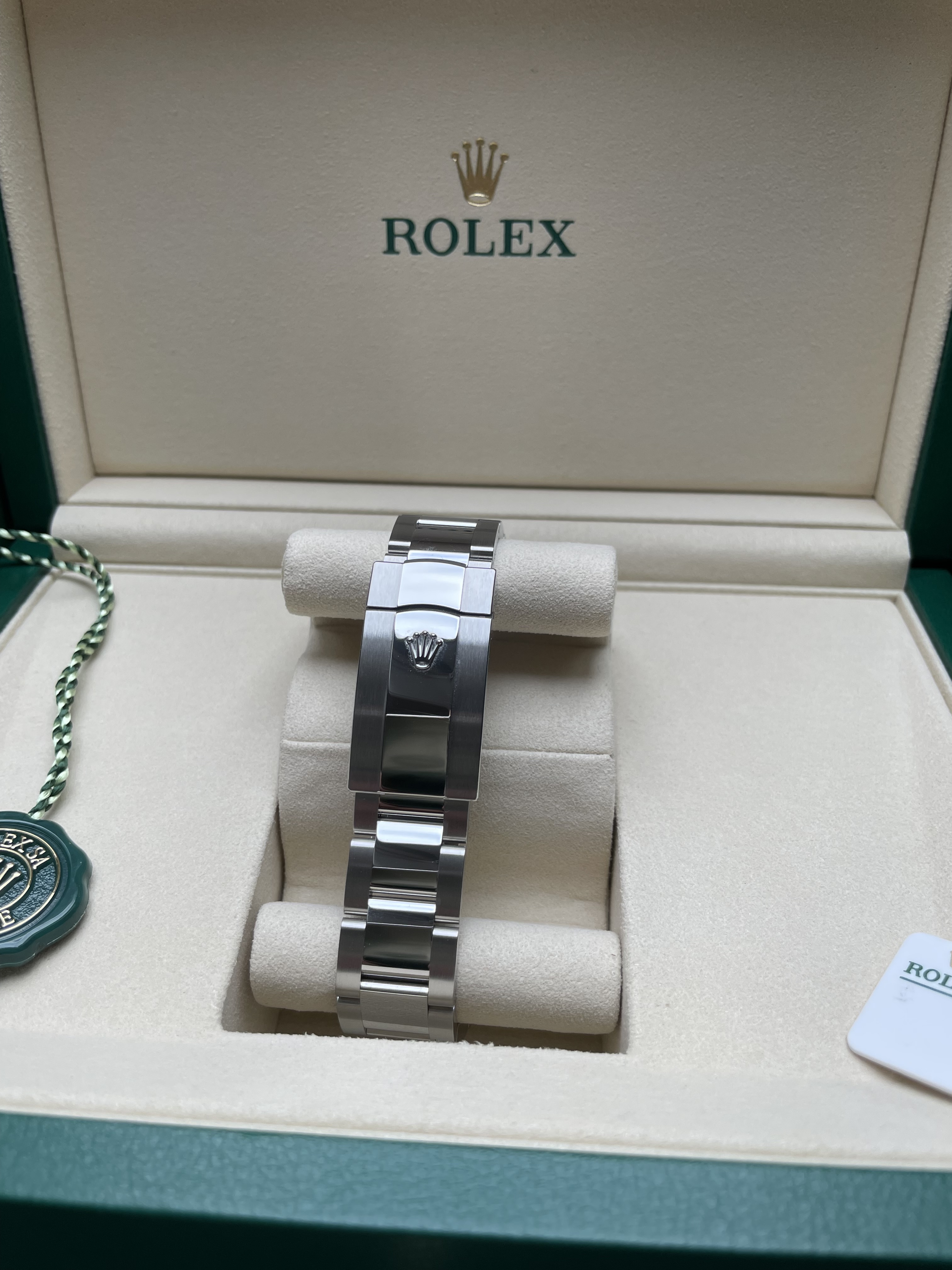 Daaronder: een Oyster-band die zit als een op maat gemaakt pak. Geen geratel, geen speling, geen compromis. Schakel voor schakel vakmanschap om je pols, afgewerkt alsof iemand er écht van hield.