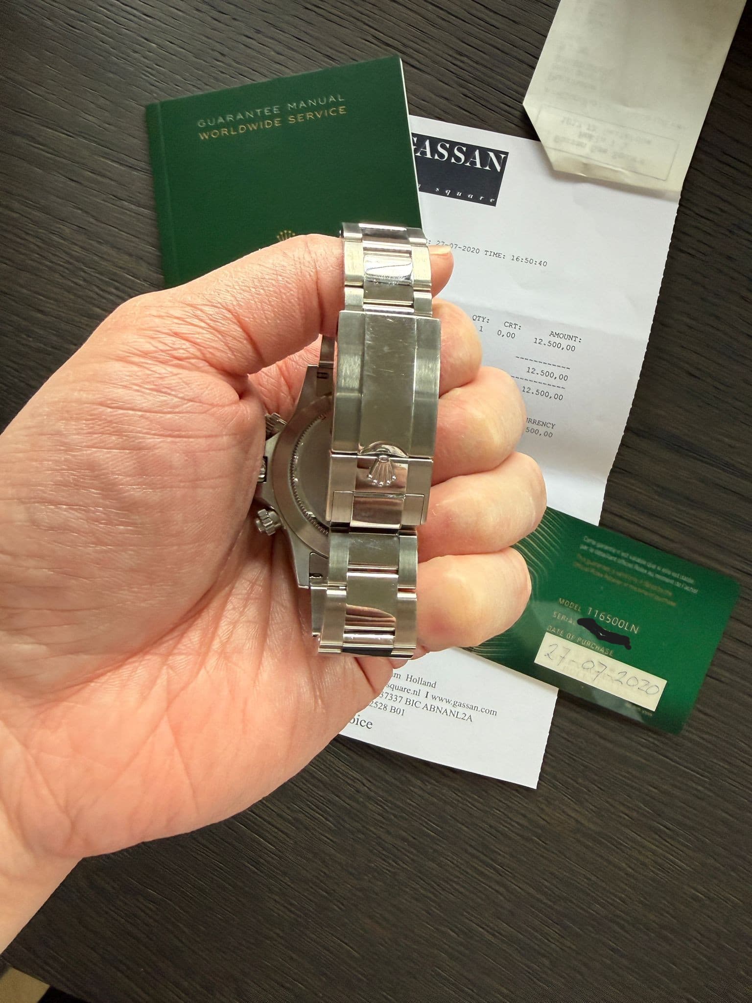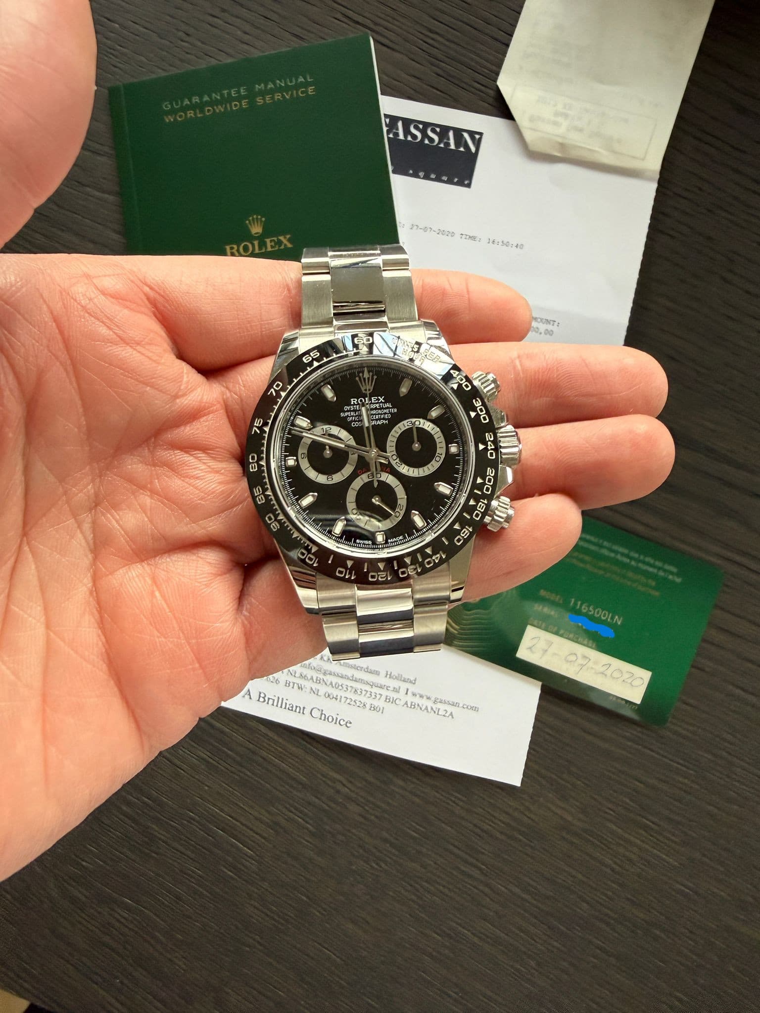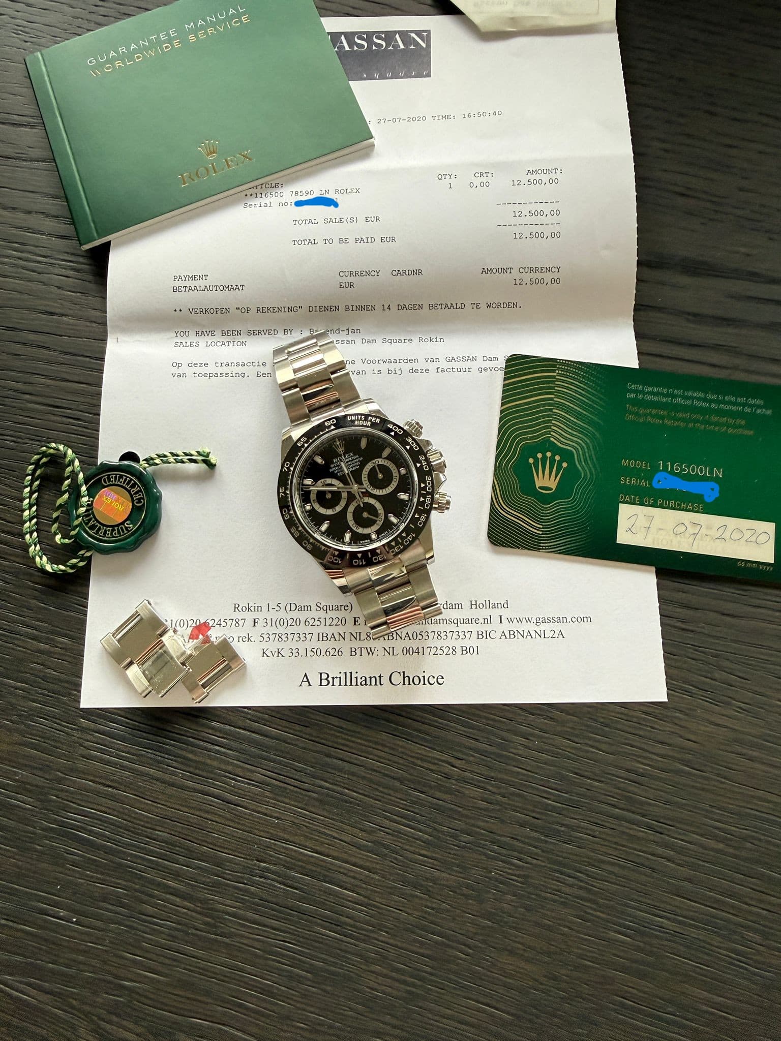 Papieren, doos en eventuele accessoires: Full set — originele Rolex doos, groene garantiekaart (27-07-2020), Gassan aankoopfactuur (€12.500), guarantee manual, Superlative Chronometer tag