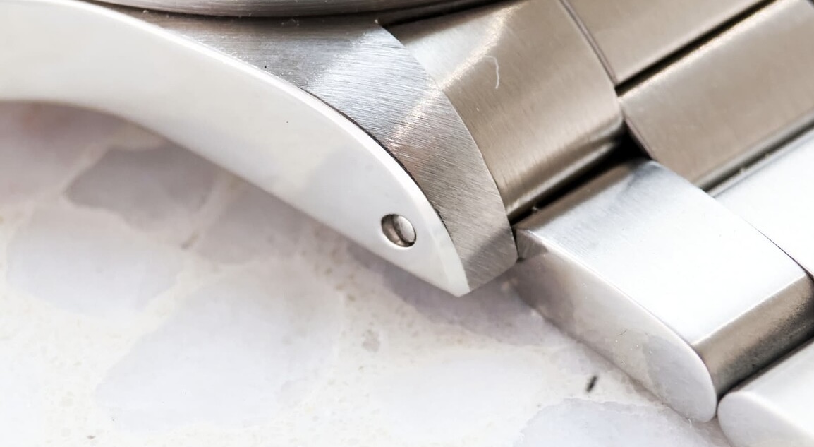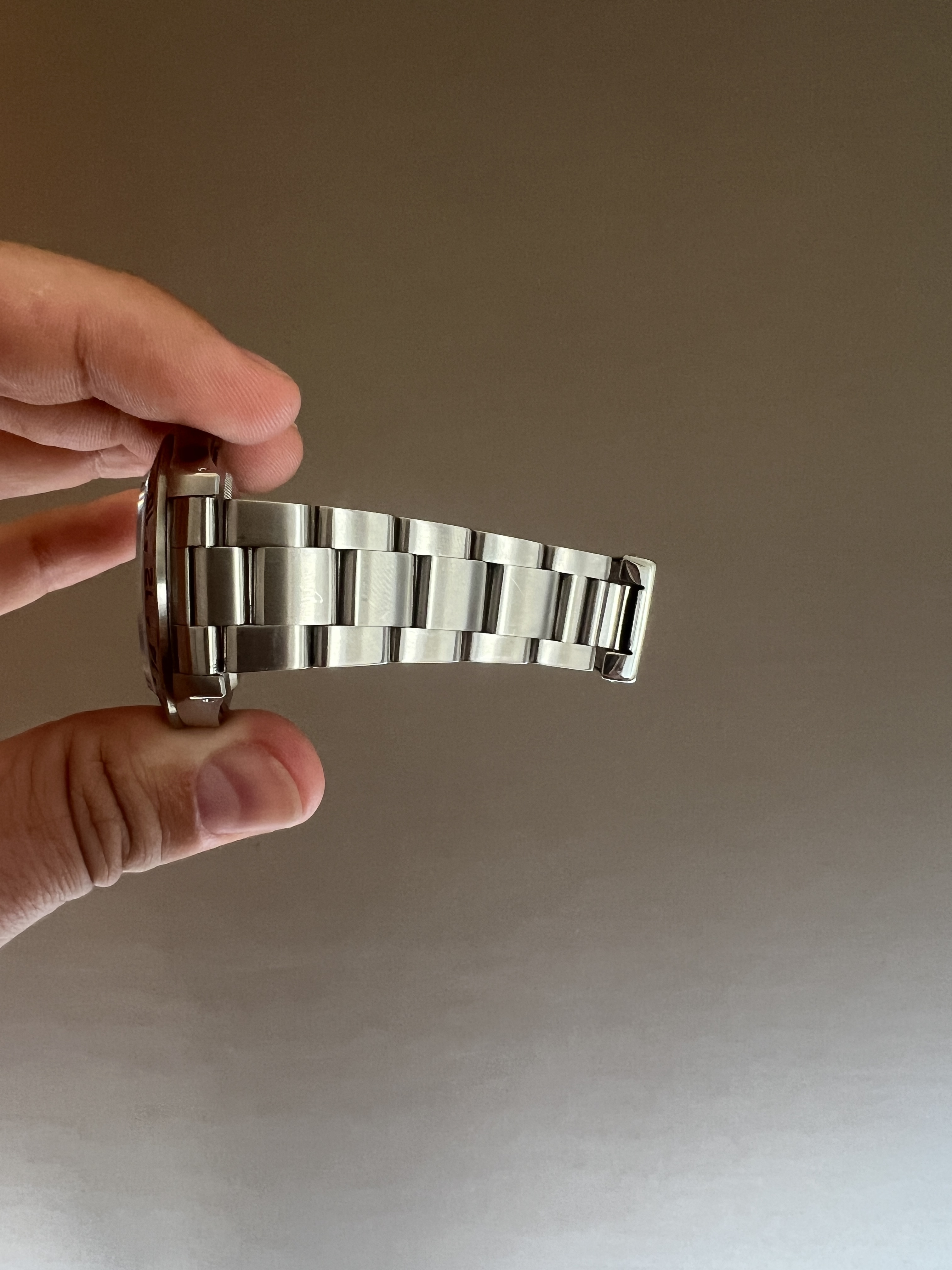 De band is een 78360 Oyster met minimale rek. Op de sluiting wat lichte gebruikssporen, maar dat hoort bij de leeftijd.