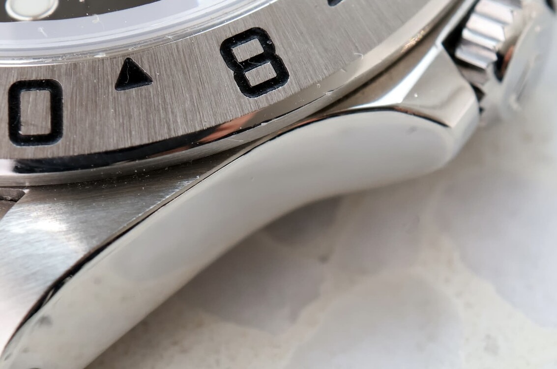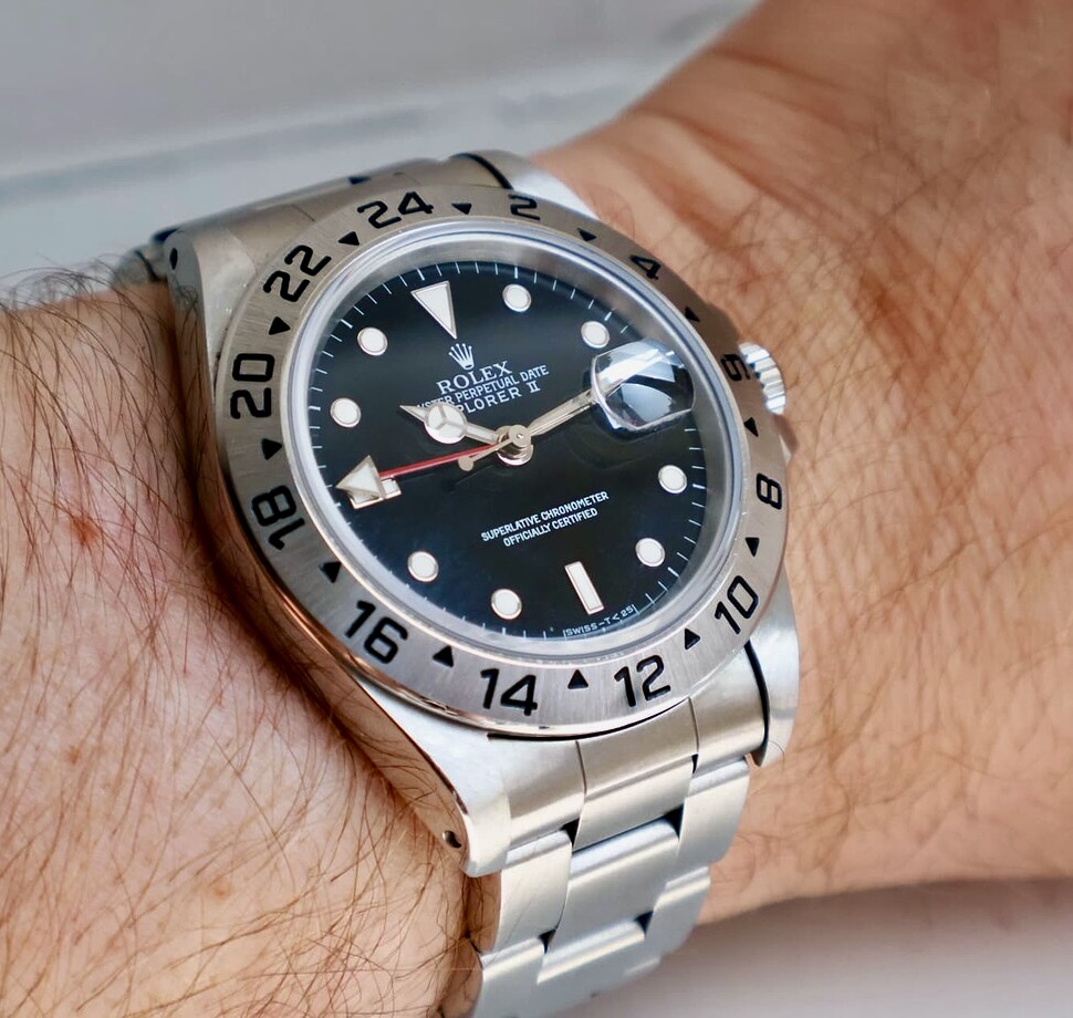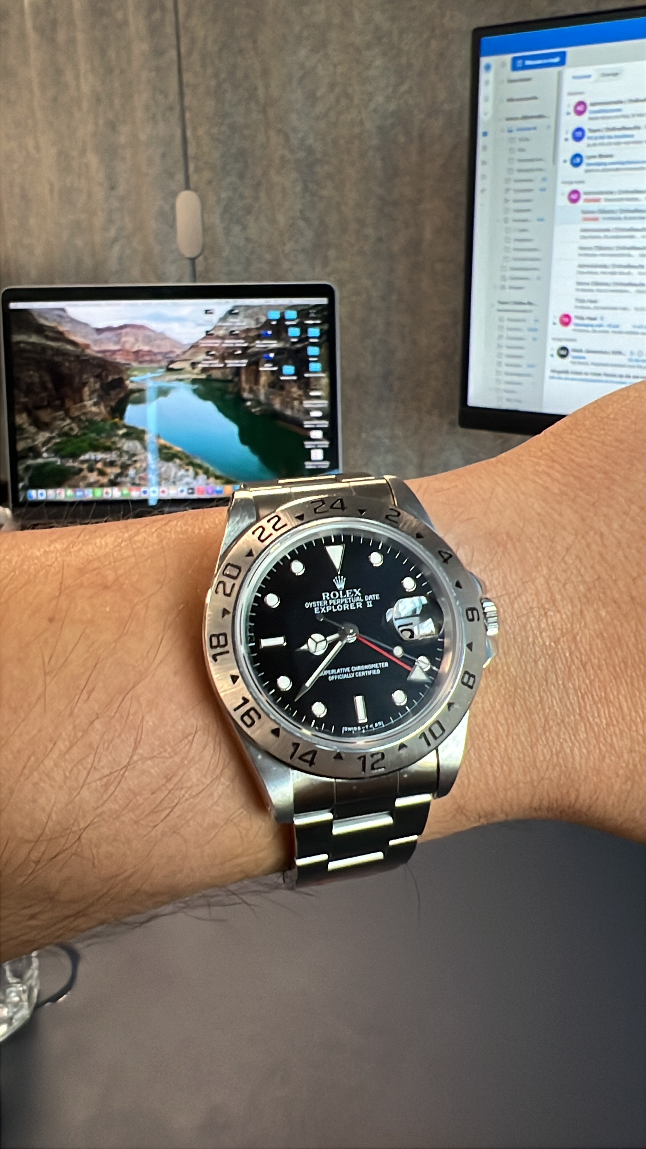 Te koop: een Rolex Explorer II ref. 16570 in uitzonderlijk mooie, originele staat. De kast is dik, met lugholes, en naar mijn idee nog nooit gepolijst. De beveled edges en brush zijn strak, dit is bijzonder is voor een bijna 30 jaar oud exemplaar. Uiteraard wat kleine plekjes her en der, maar niets noemenswaardigs.