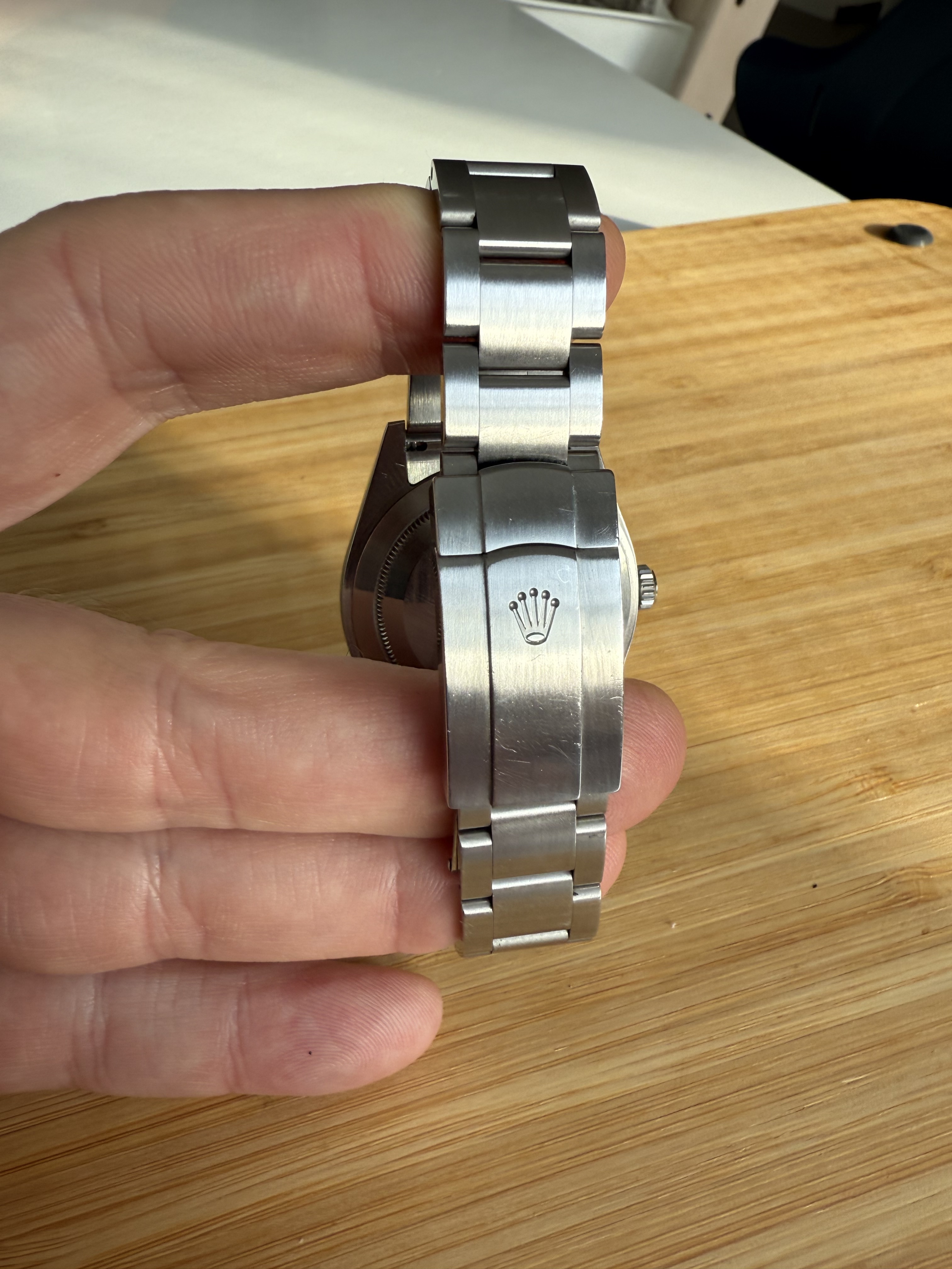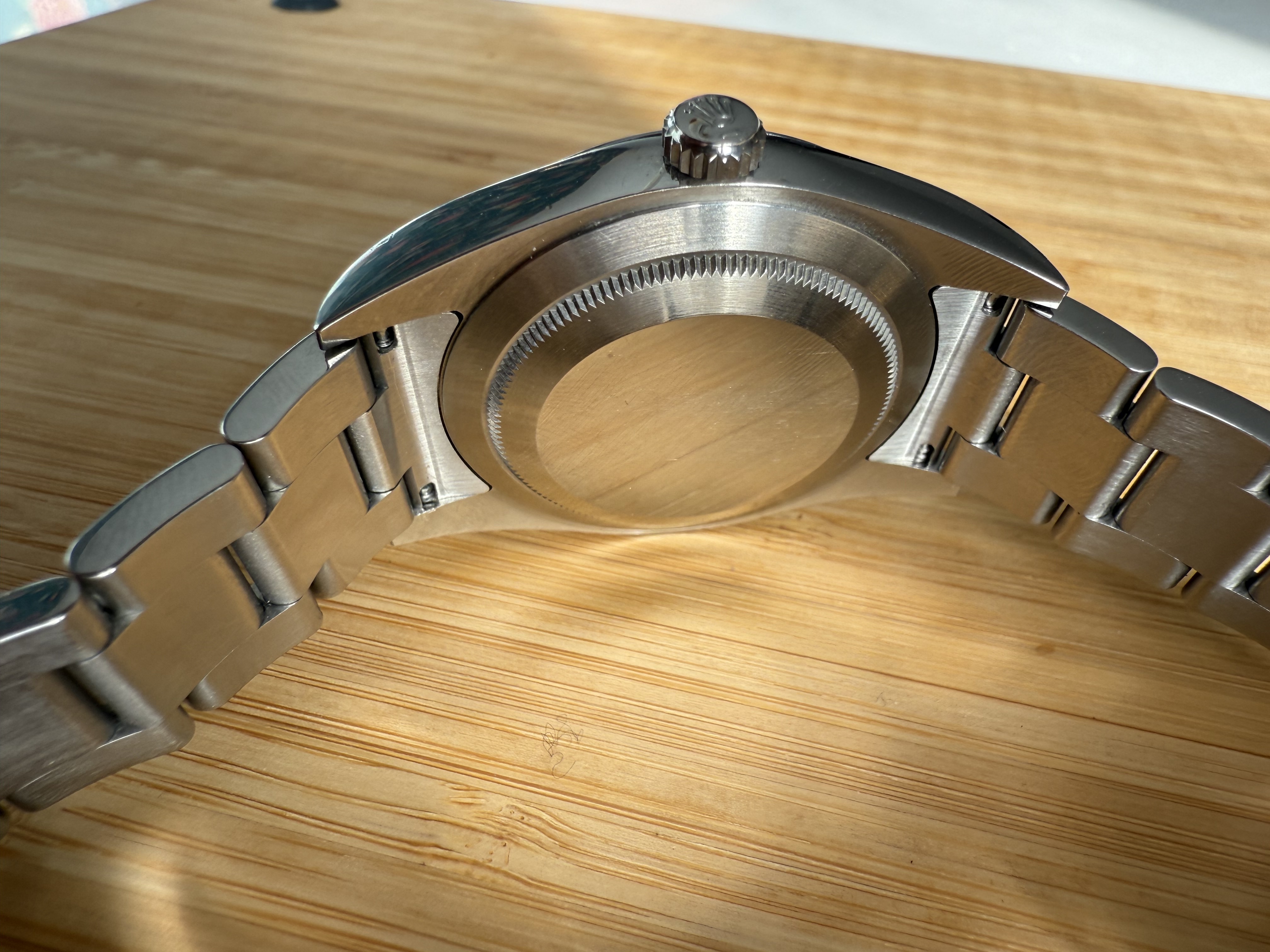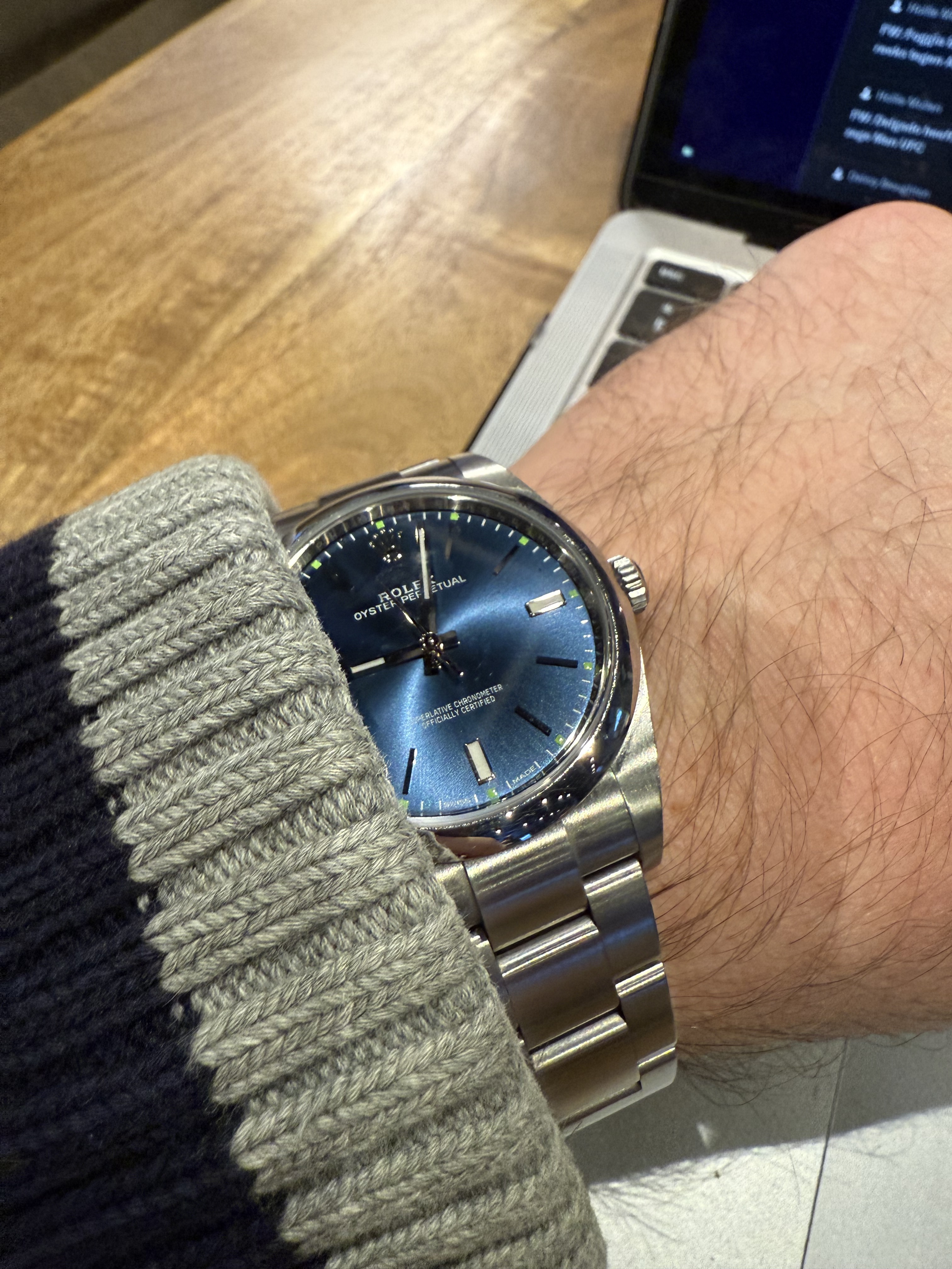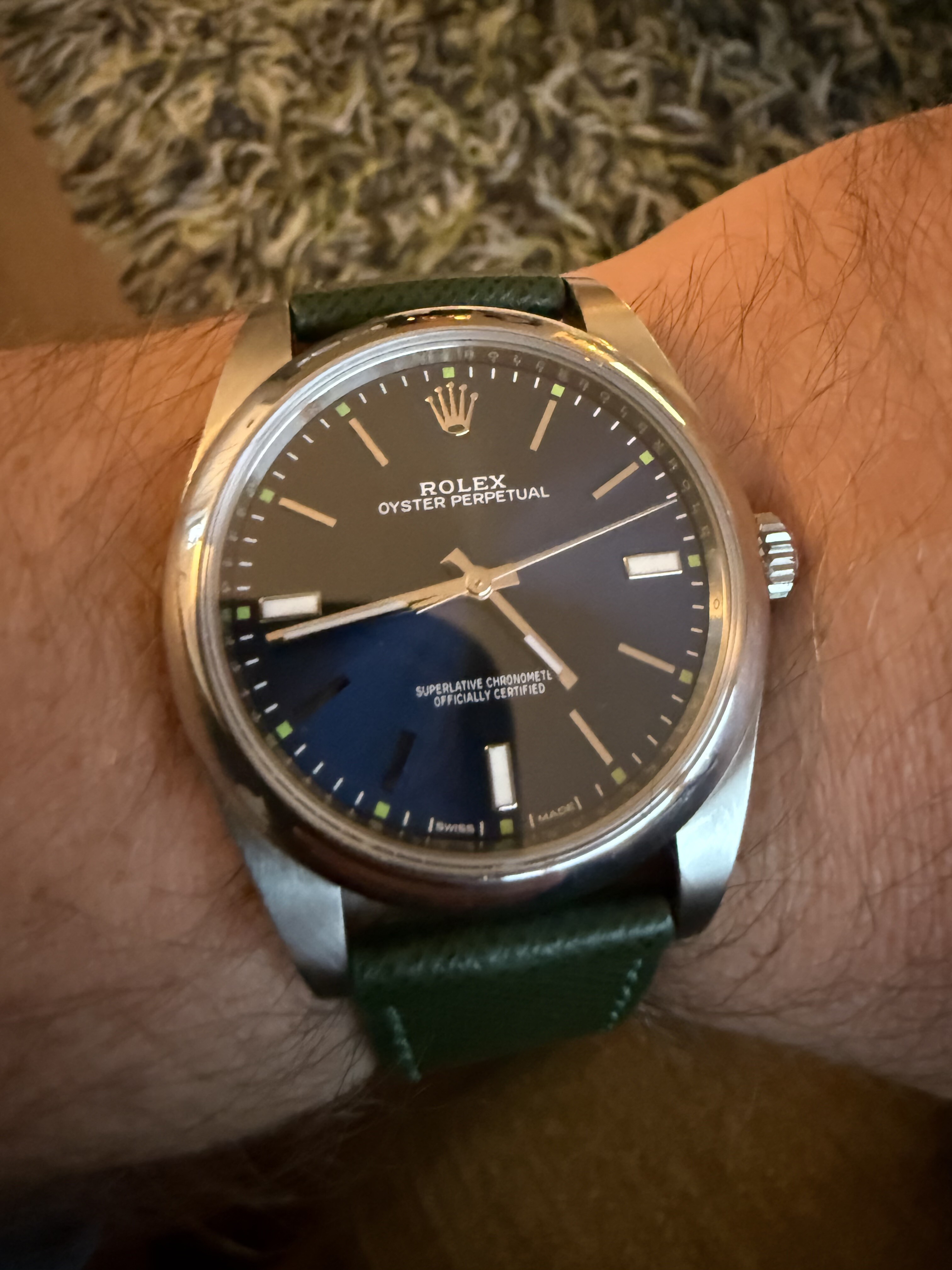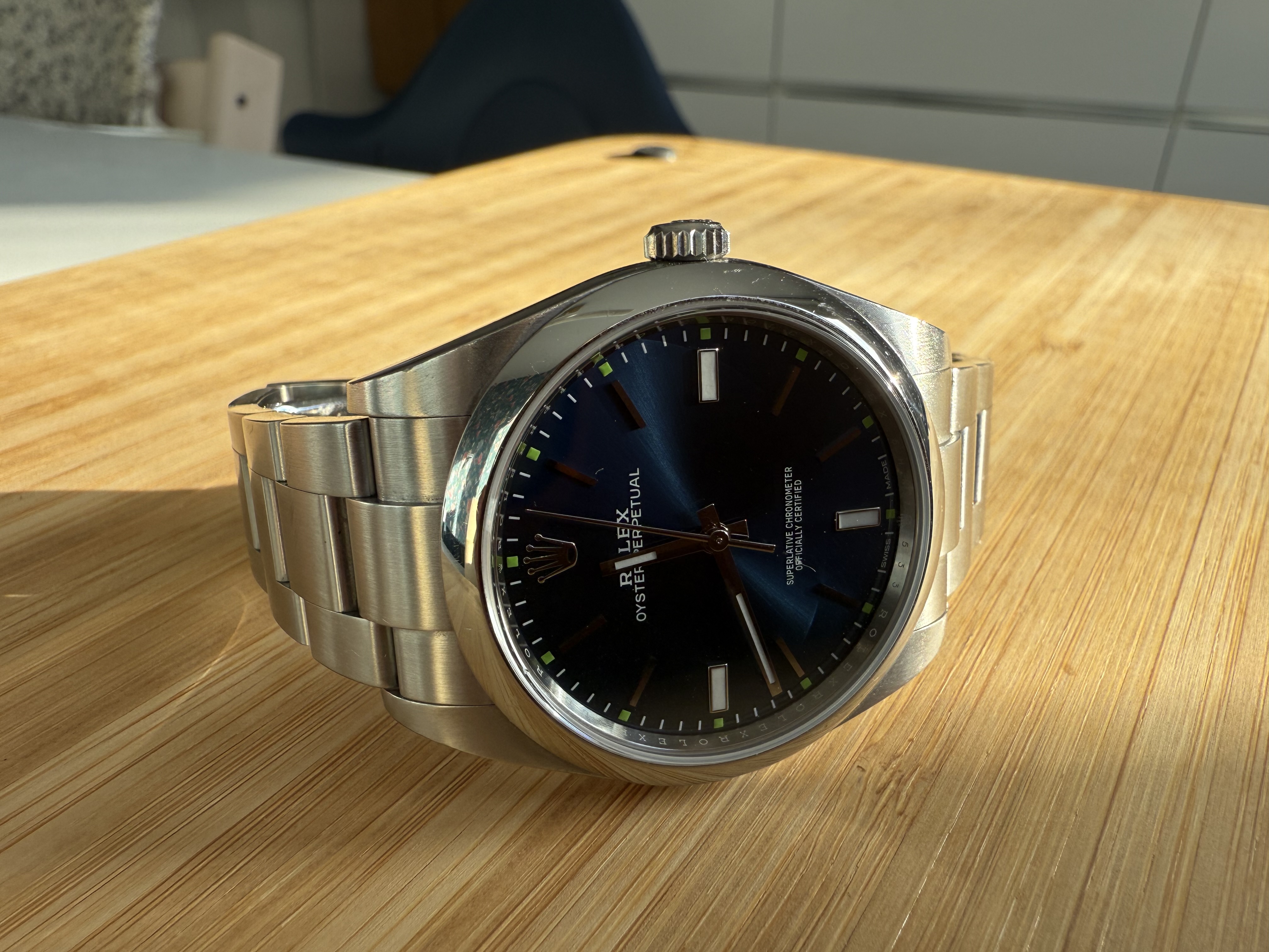 Wegens veranderde prioriteiten, is mijn prachtige Oyster Perpetual 39 met sunburst blauwe wijzerplaat beschikbaar. Fijne GADA met betoverende wijzerplaat. De groene lume dots maken ‘m net wat speelser. Formaat en dial worden niet meer gemaakt door Rolex.