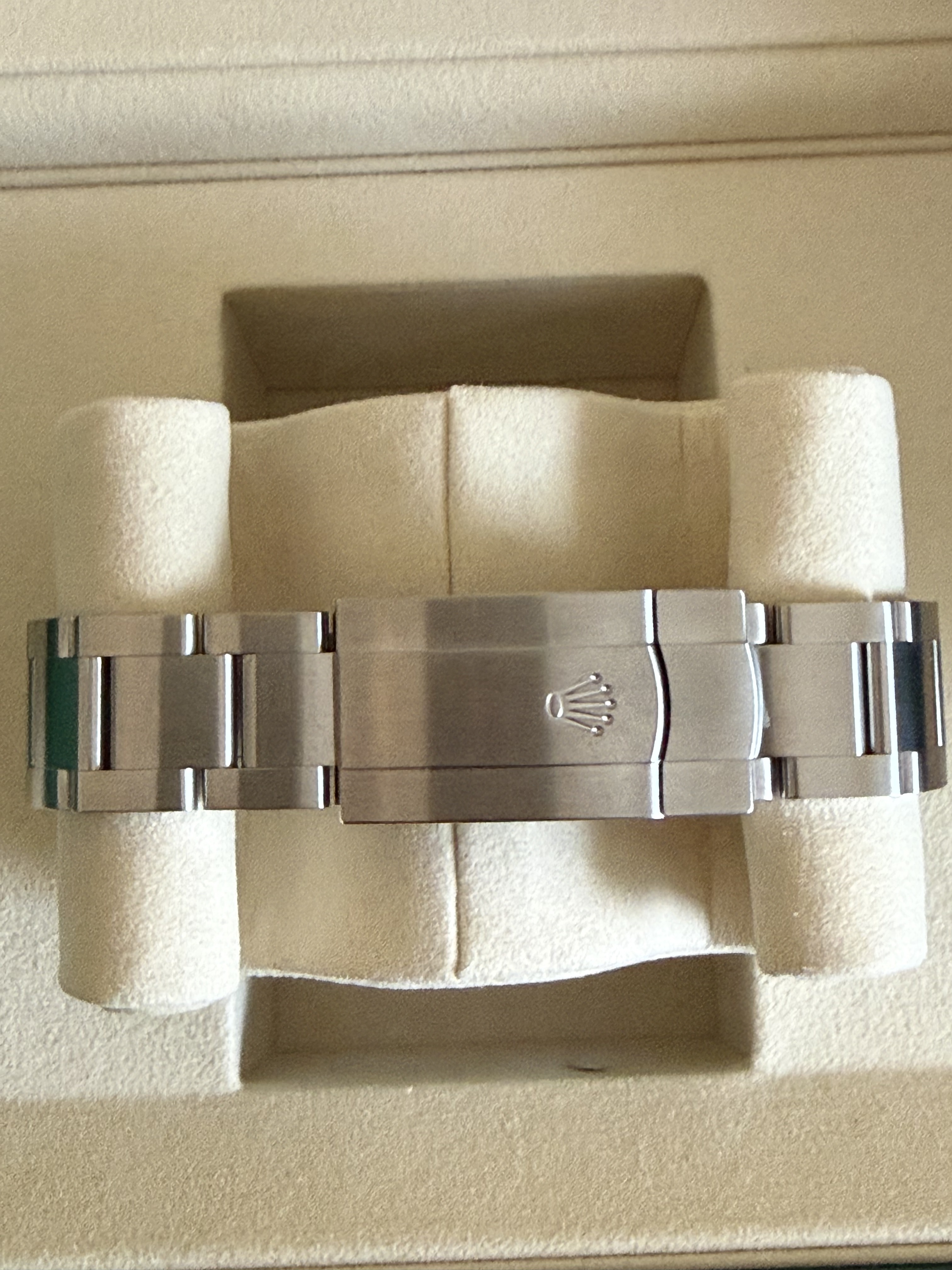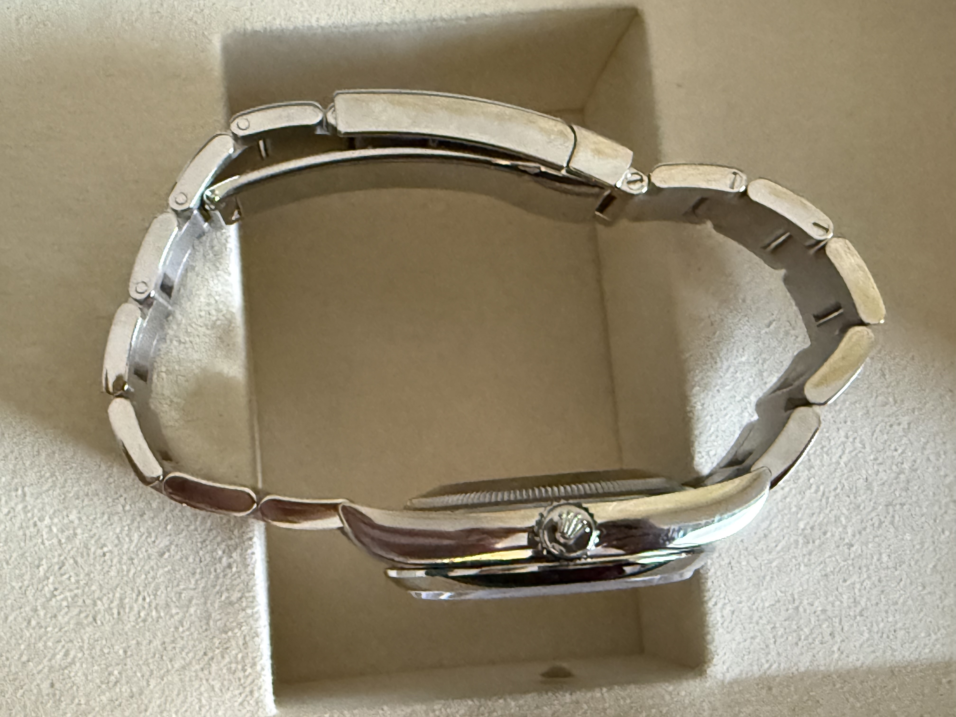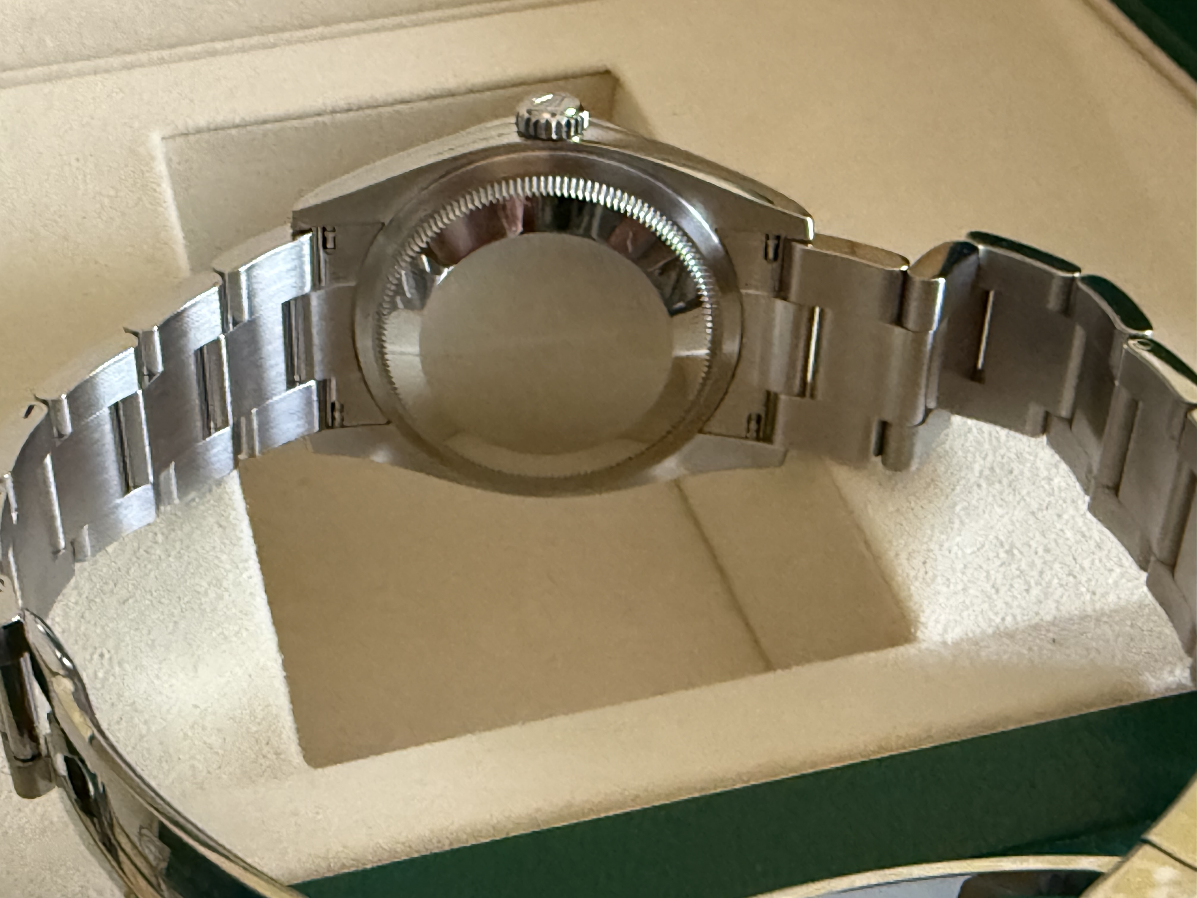 Het betreft nog de versie met de sunburst wijzerplaat, dus niet de nieuwe blauwe wijzerplaat. Dat nieuwe blauw is mooi maar naar mijn bescheiden mening veel minder tijdloos dan deze. Dus grijp je kans als je nog een nieuwe wil met die super mooie wijzerplaat.