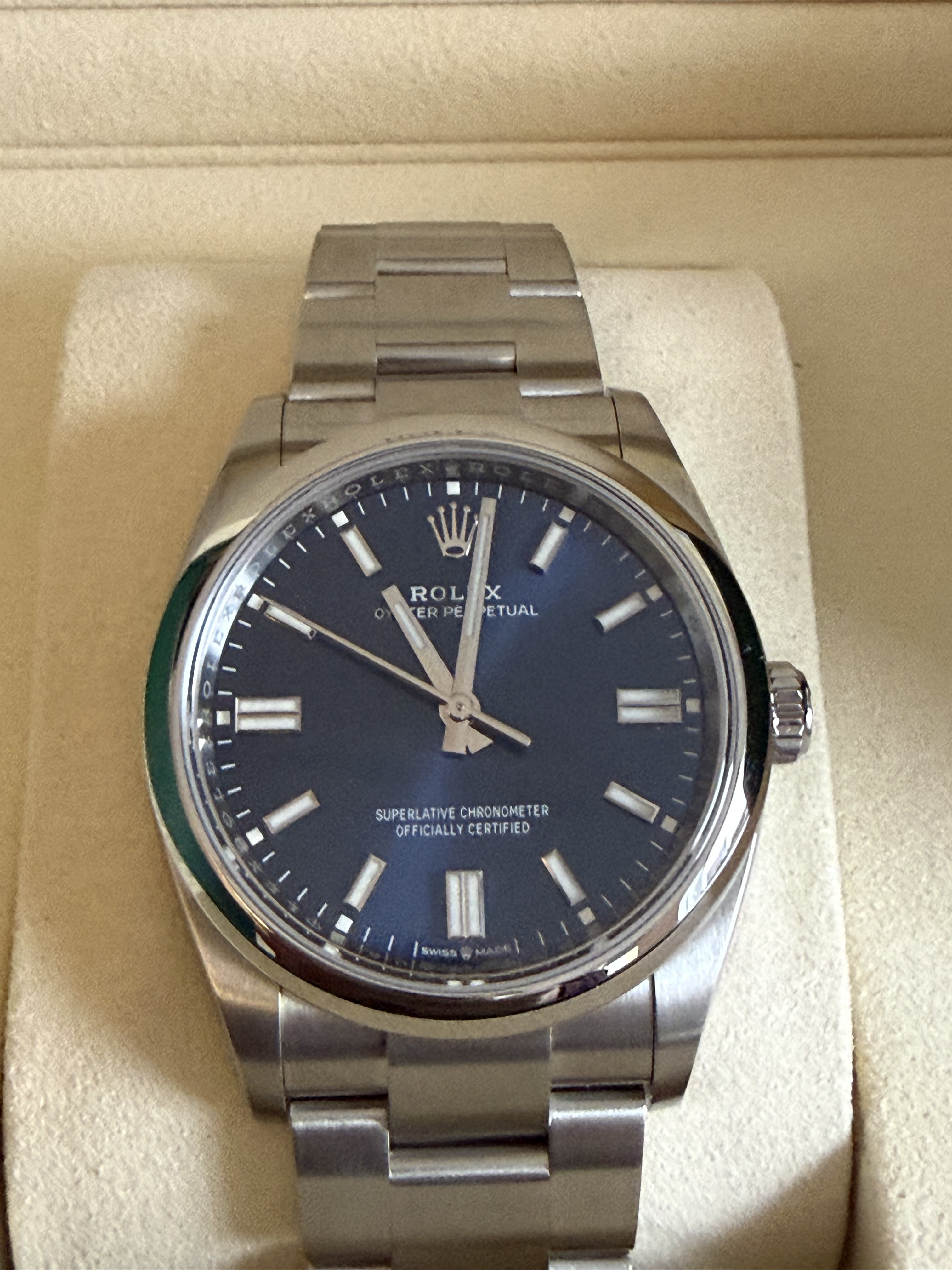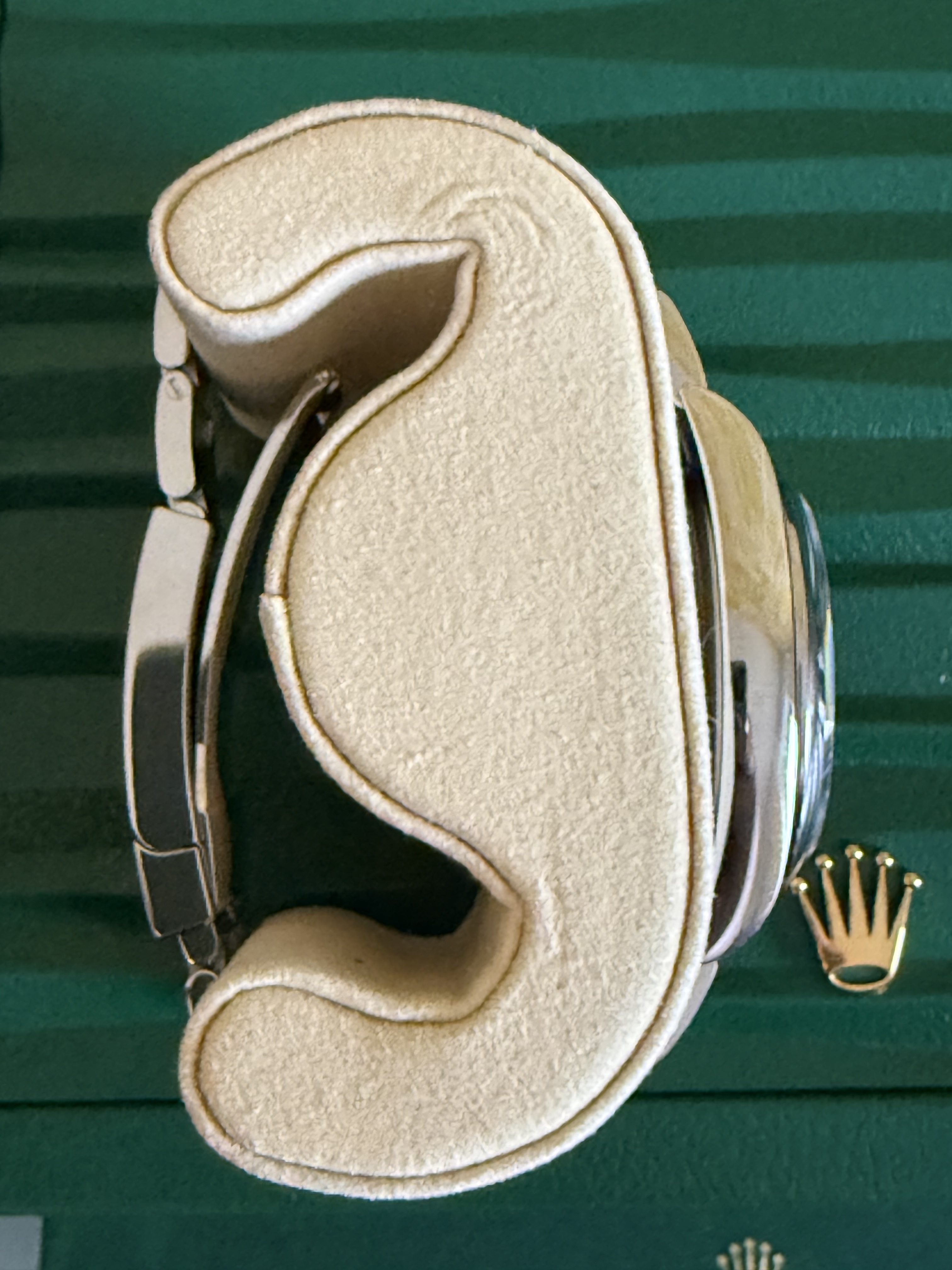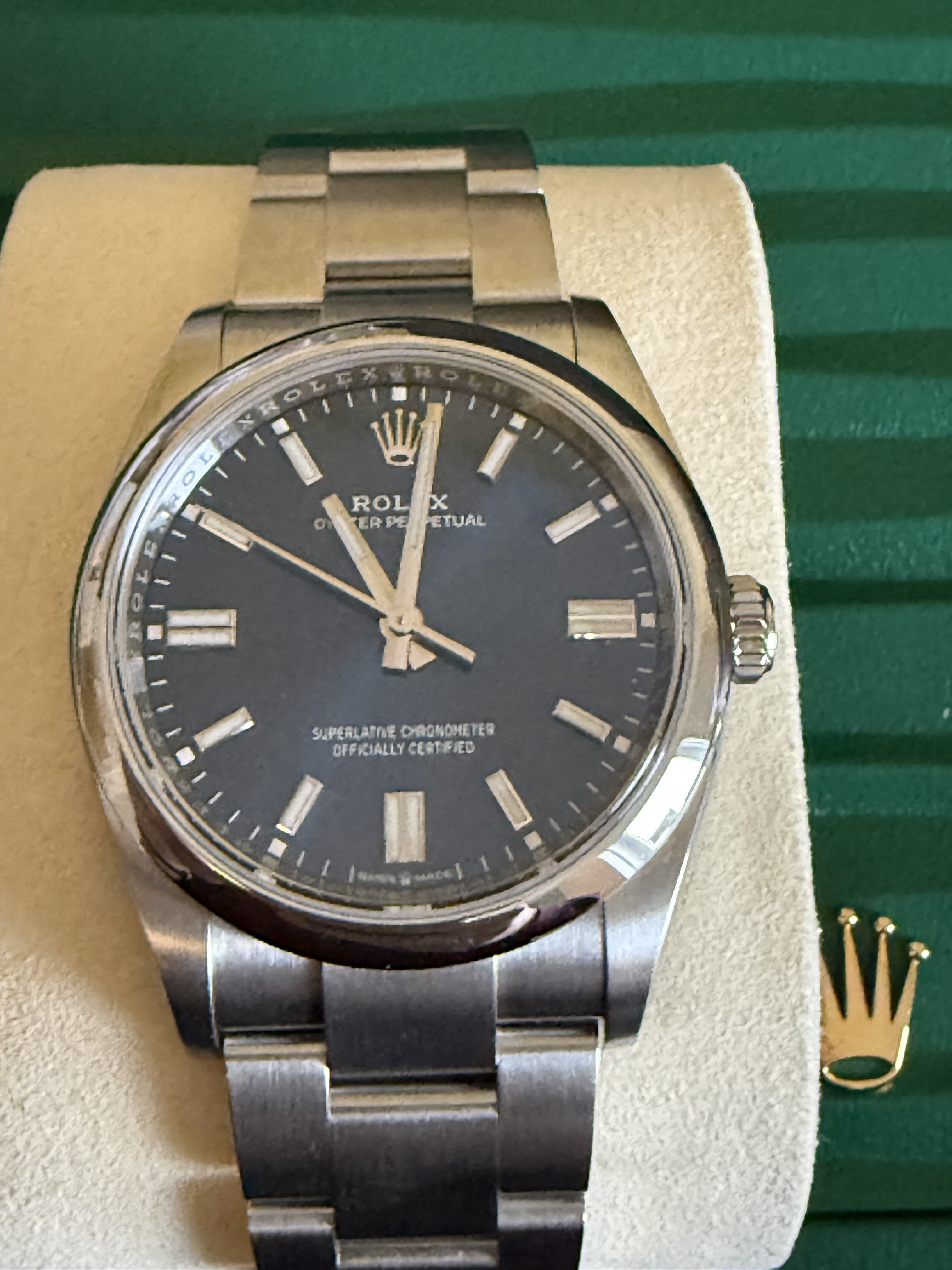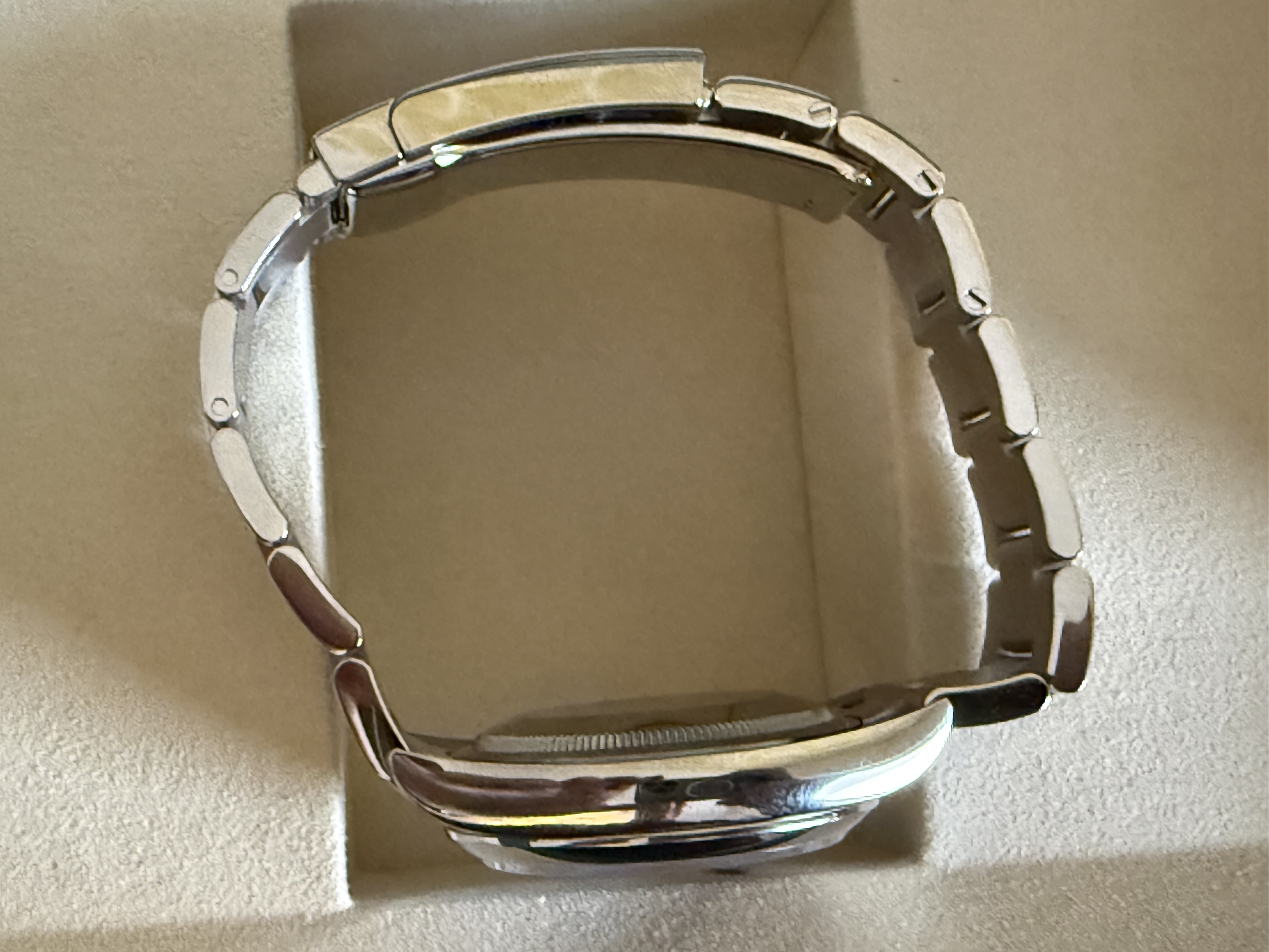 Het betreft nog de versie met de sunburst wijzerplaat, dus niet de nieuwe blauwe wijzerplaat. Dat nieuwe blauw is mooi maar naar mijn bescheiden mening veel minder tijdloos dan deze. Dus grijp je kans als je nog een nieuwe wil met die super mooie wijzerplaat.