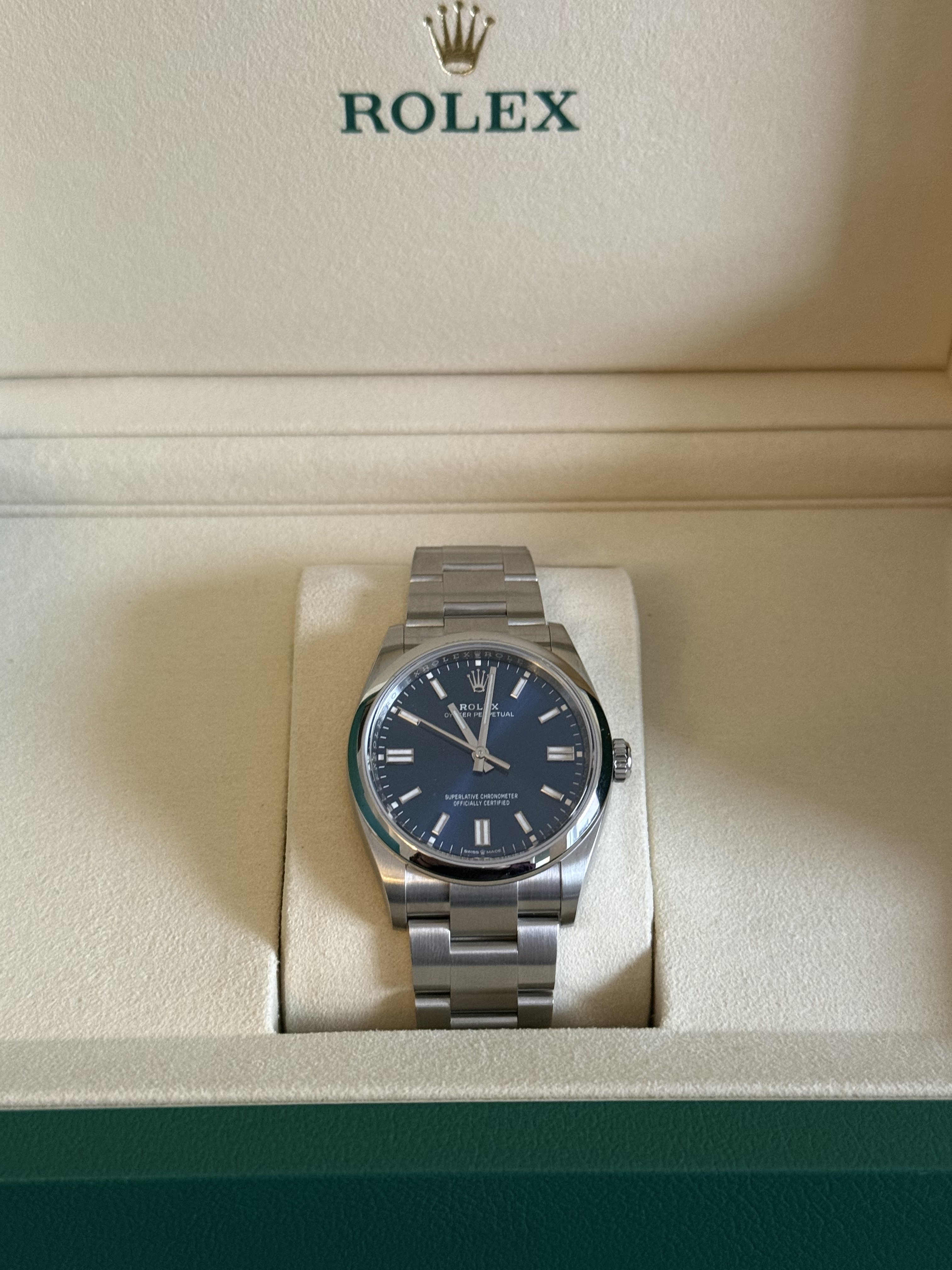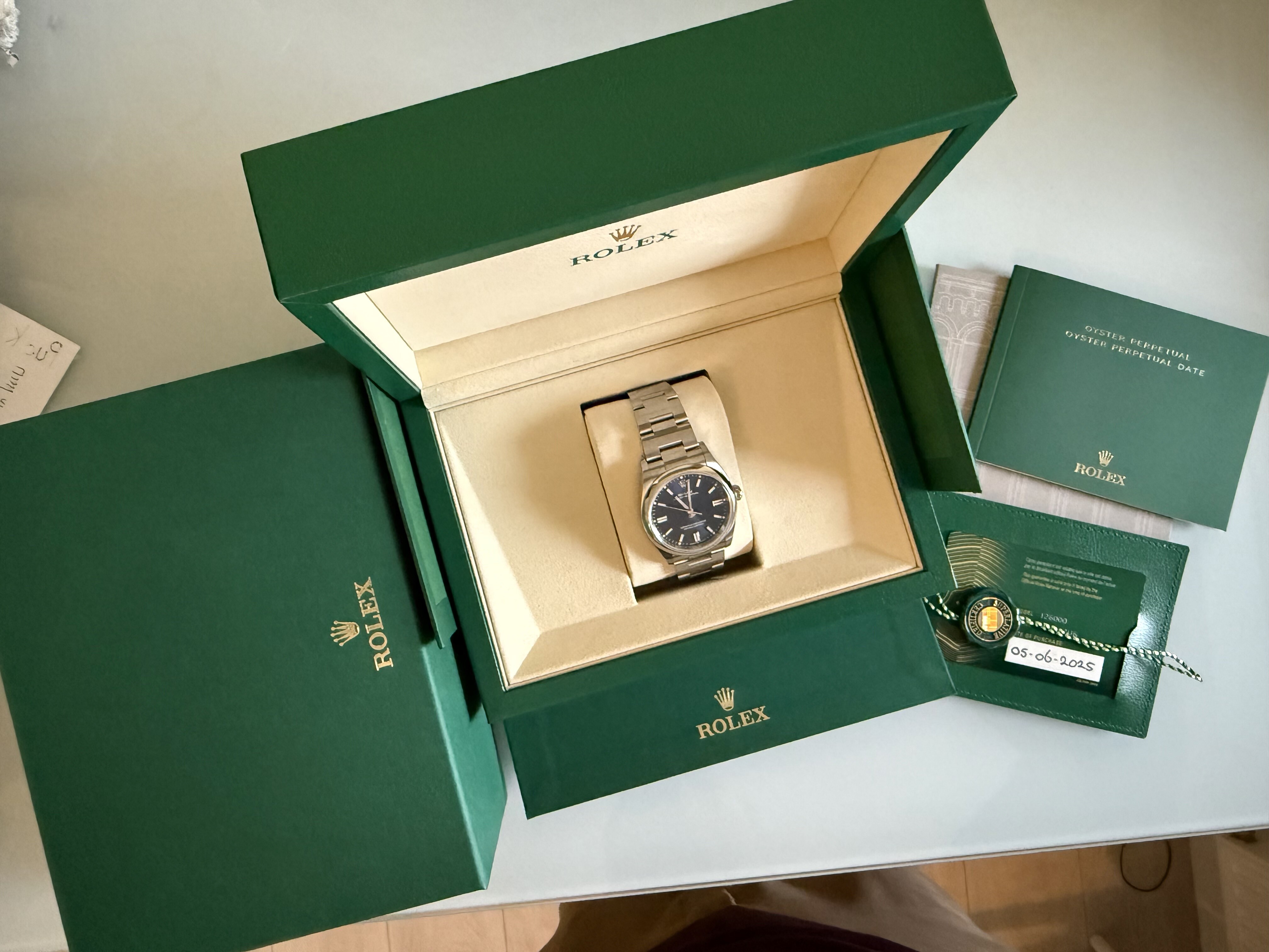 Hierbij verkoop ik mijn ongedragen Rolex Oyster Perpetual 36mm uit 2025. Ik heb getwijfeld of voor mij de 41mm of 36mm de perfecte maat was en had het geluk dat ik ze beide kon/mocht aanschaffen. De 41mm is voor mij de betere keuze en wordt dus ook gedragen. Deze heeft sinds aankoop in de kast gelegen en ik hoop er hier een nieuwe eigenaar voor te vinden. Is dus nieuw, buiten twee passessies niet gedragen. Alles zit erbij. Geen inruil.