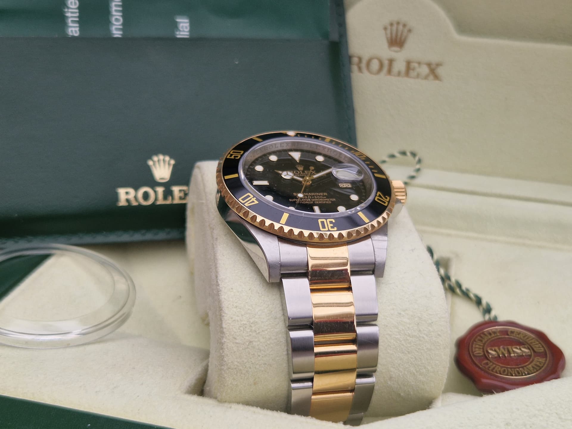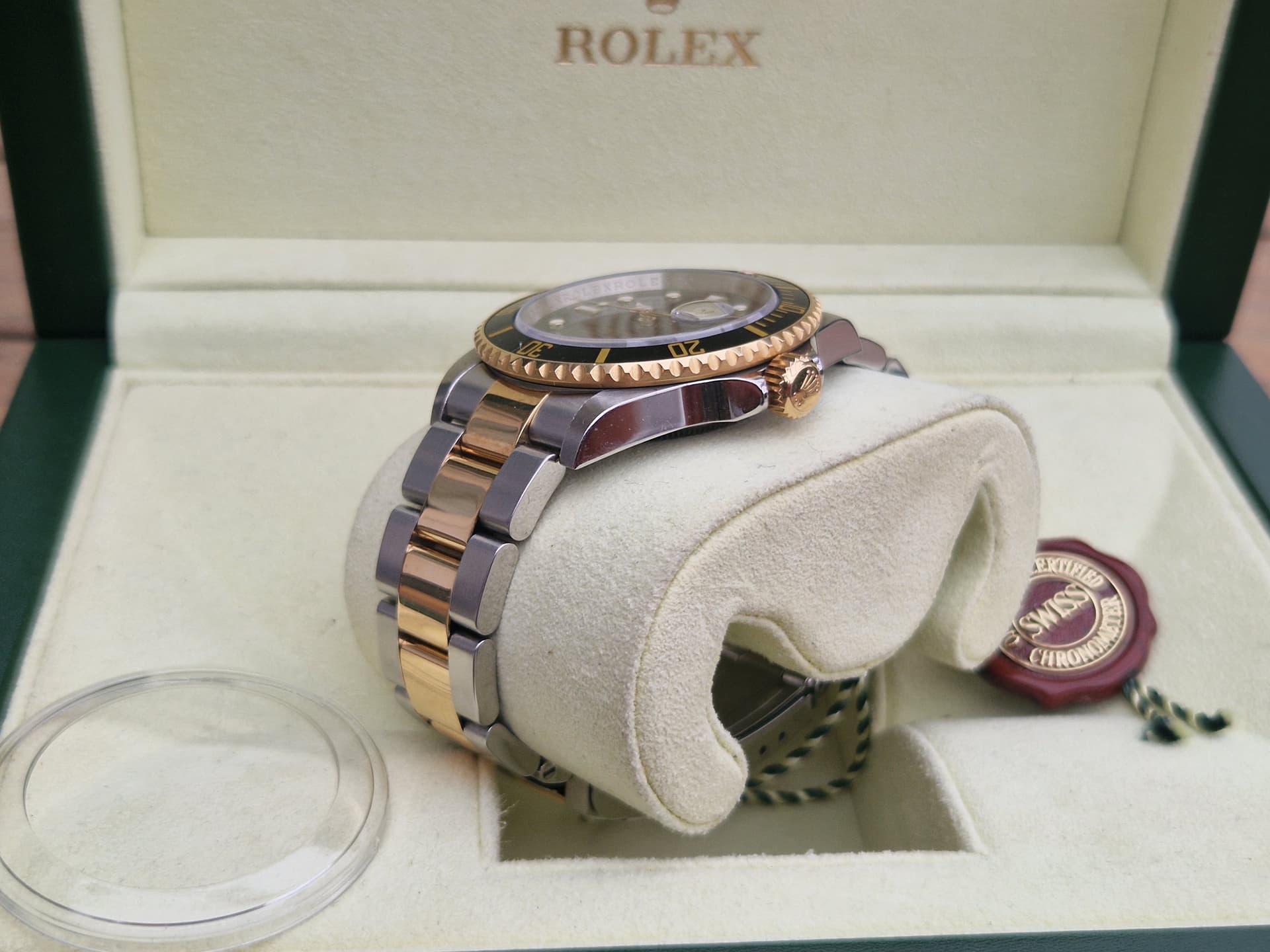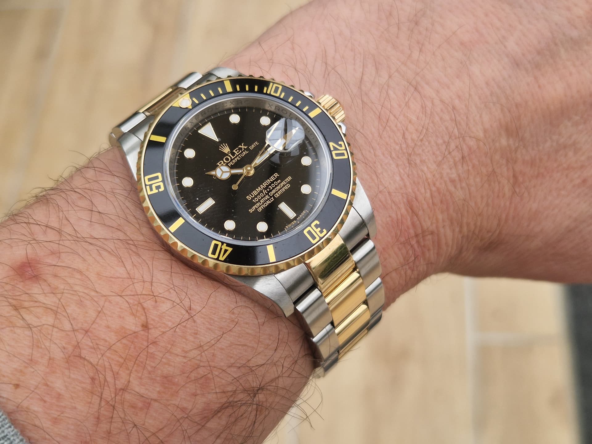 Na lang zoeken in januari van dit jaar aangeschaft van de 1e eigenaar in Duitsland (LC100), deze mooie two-tone sub met zwarte plaat. Ik wilde er persé één zonder lugholes en mét de rehaut. Een schitterend horloge inclusief doos en papieren en accessoires. Hij mag toch gaan omdat ik een andere two-tone op het oog heb; een 116513 en ik weet dat ik geen 2 two-tones ga dragen.