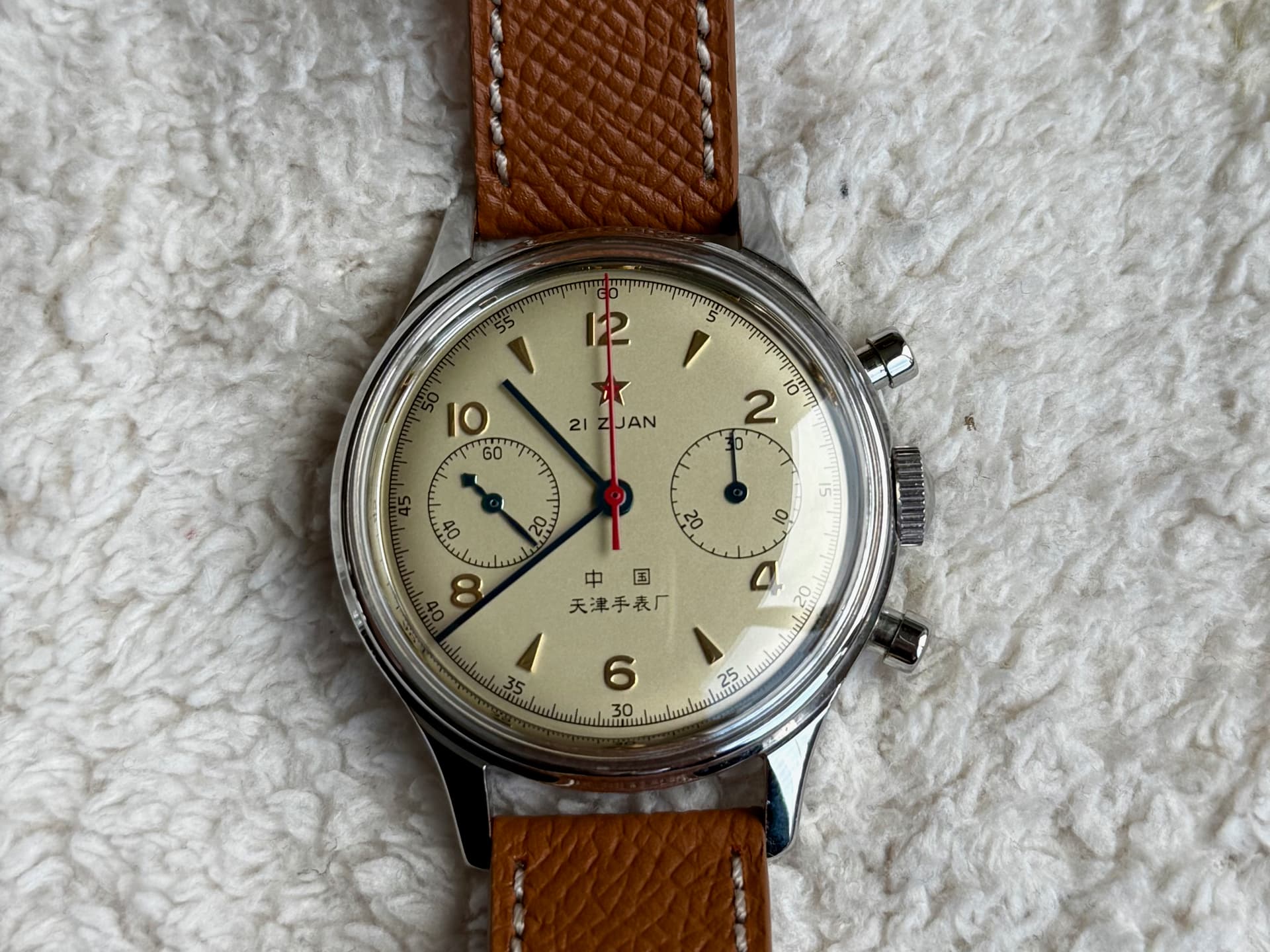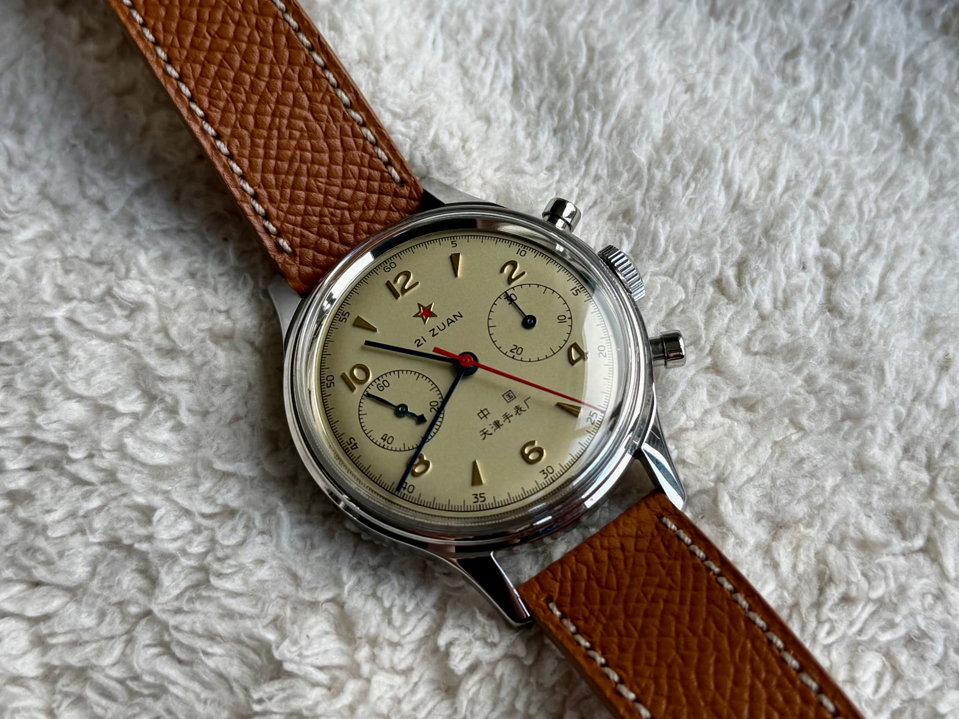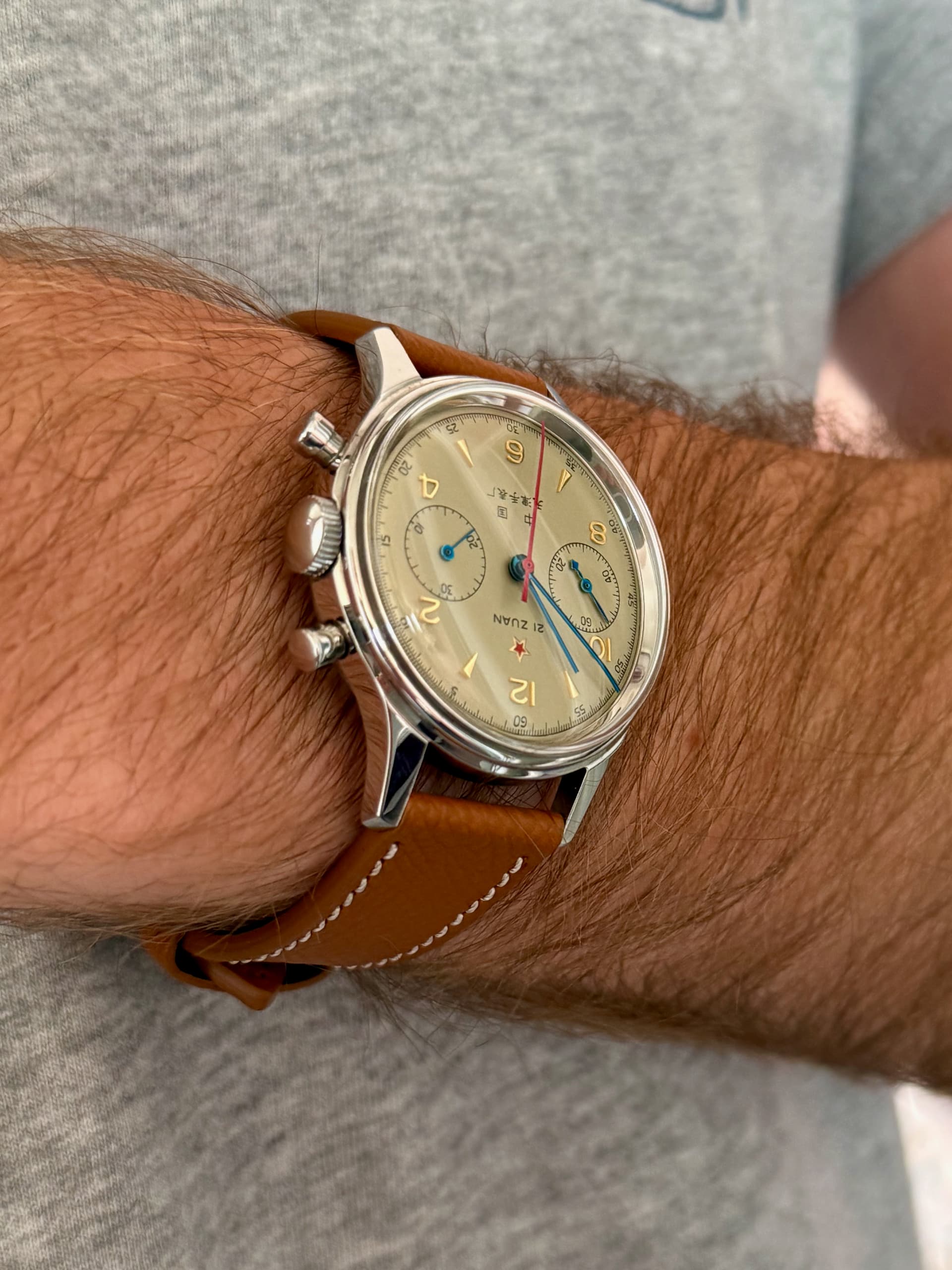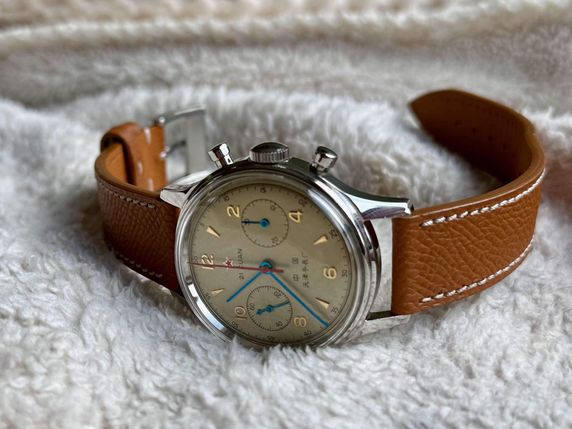 Dit iconische (doch bezahlbare) chronograaf horloge komt op een heel mooi lichtbruin leren bandje van Watch Works Haarlem kuch ‘Molequin’ t.w.v. 110 piek, maar doe ik er voor een geeltje bij. Haalt het horloge wel enorm op. ![]()